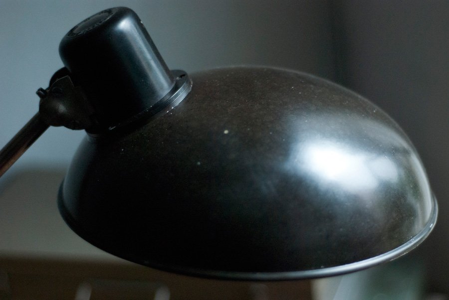 Nach der kompletten Zerlegung, Entrostung wurden die Elemente der Leuchte sorgfältig gereinigt und zusammengebaut. Die Teile aus Bakelit wurden mit einem Hausrezept gepflegt. Die Lampe hat dem Alter entsprechend Lager- und Gebrauchsspuren, sie befindet sich in einem sehr guten Zustand. Der wunderschöne Schirm aus Bakelit hat keinen Riss, weist sehr leichte Gebrauchsspuren auf. Der Sockel aus Bakelit ist seitlich gebrochen.
