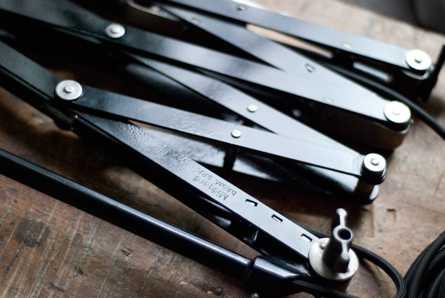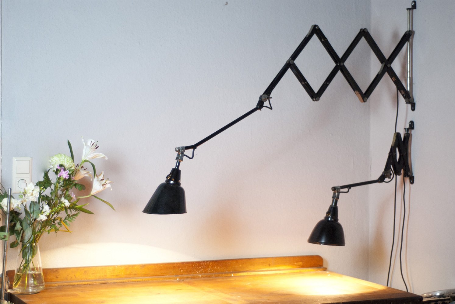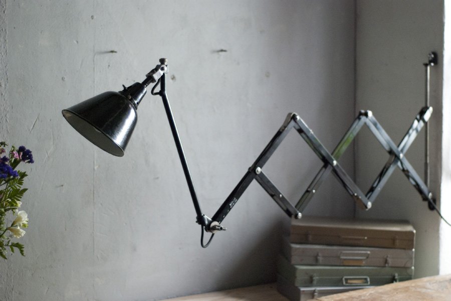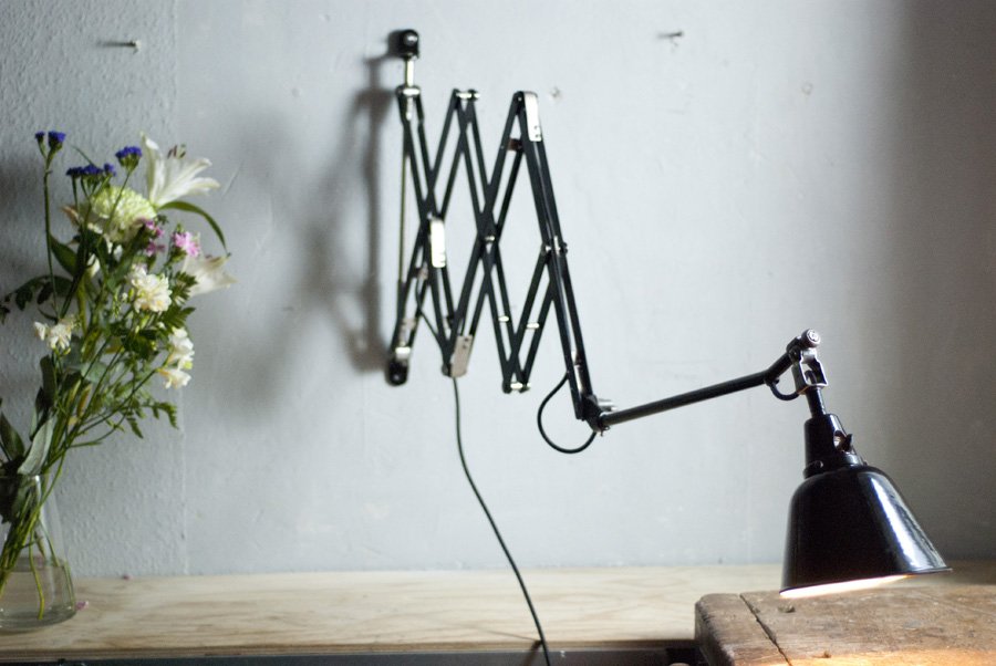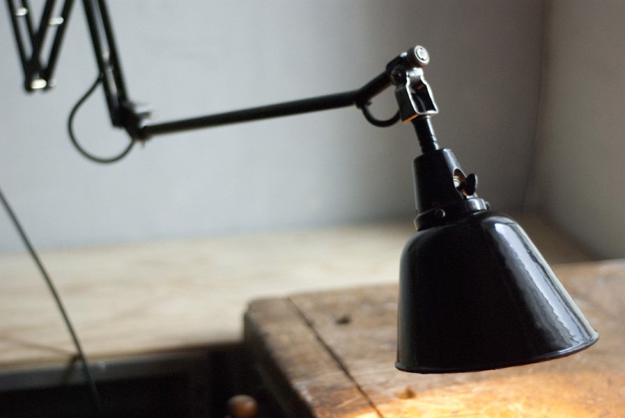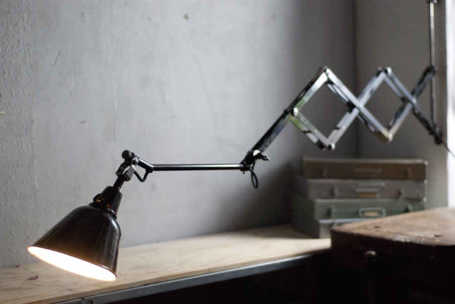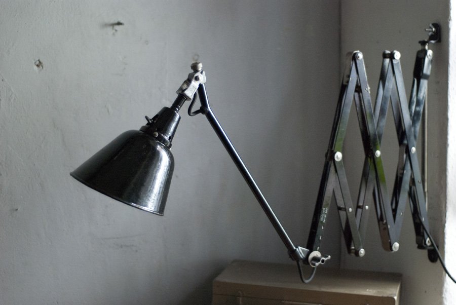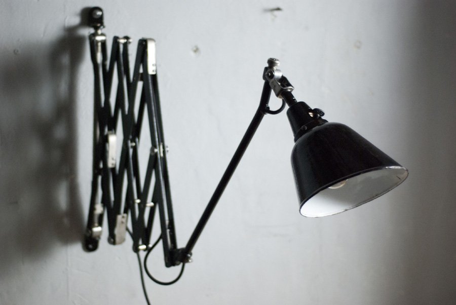 Der Entwurf dieser einzigartigen Scherenlampe mit Doppelgelenk stammt von Curt Fischer, der ab ca. 1920 an der Idee des „lenkbaren Lichtes“ gearbeitet hat. Noch vor den so bekannten Entwürfen von Christian Dell oder Marianne Brandt setzte Curt Fischer mit der allseitig beweglichen Arbeitsplatzleuchte die Idee des so genannten ‚lenkbaren Lichtes‘ um. Die Metallwerkstatt im Bauhaus in Weimar wurde mit Midgard-Leuchten erhellt und diente den Bauhaus-Studenten als Vorbild und ist später auch in die Wohnzimmereinrichtung von Ilse und Walter Gropius in deren Meisterhaus am Dessauer Bauhaus belegbar.