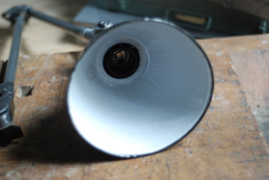 Alte Tischleuchte Midgard in Stahloptik mit emailliertem Reflektor