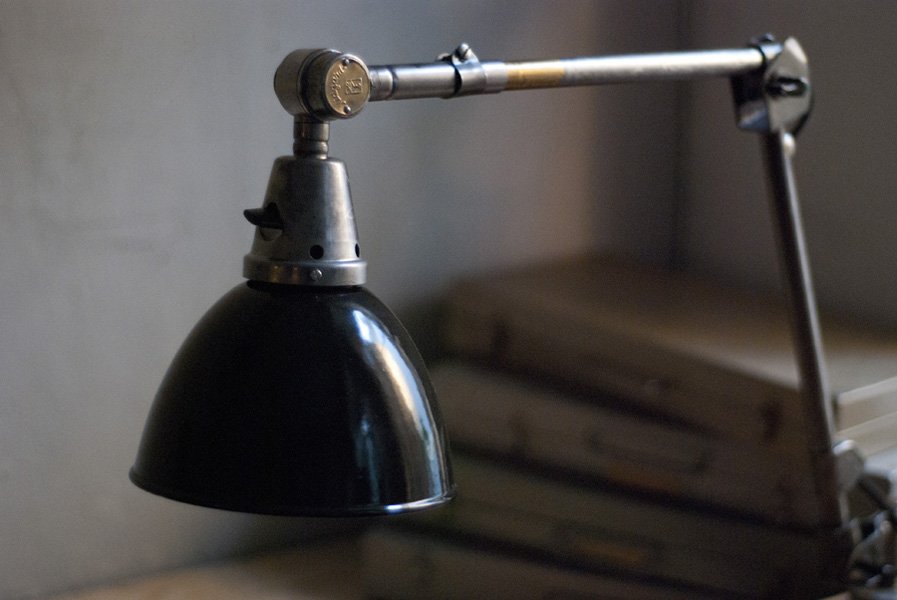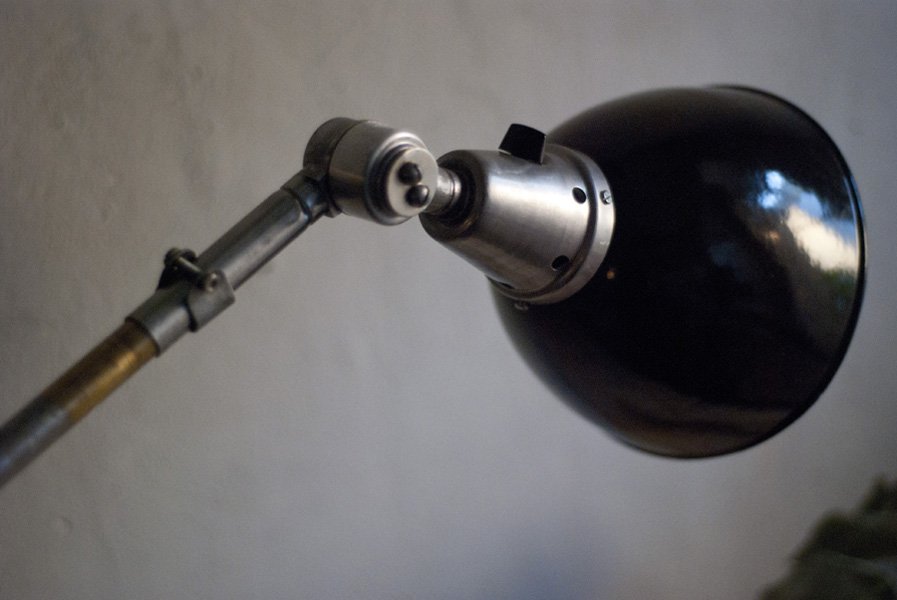 Gelenkleuchte Midgard in Stahloptik mit emailliertem Reflektor eines anderen Herstellers.