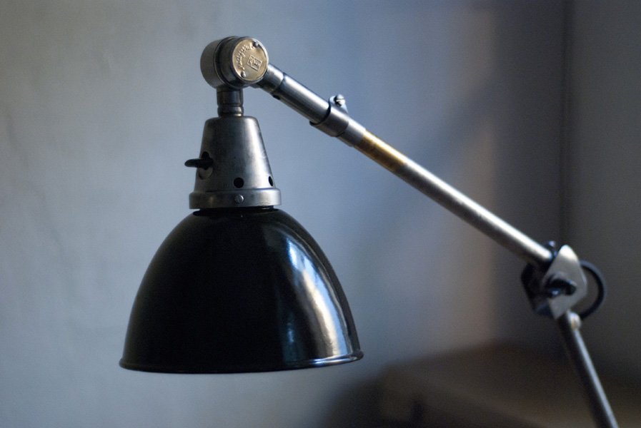 Gelenkleuchte Midgard in Stahloptik mit emailliertem Reflektor eines anderen Herstellers. Der Entwurf dieser einzigartigen Gelenklampe stammt von Curt Fischer, der ab ca. 1920 an der Idee des „lenkbaren Lichtes“ gearbeitet hat. Noch vor den so bekannten Entwürfen von Christian Dell oder Marianne Brandt setzte Curt Fischer mit der allseitig beweglichen Arbeitsplatzleuchte die Idee des so…