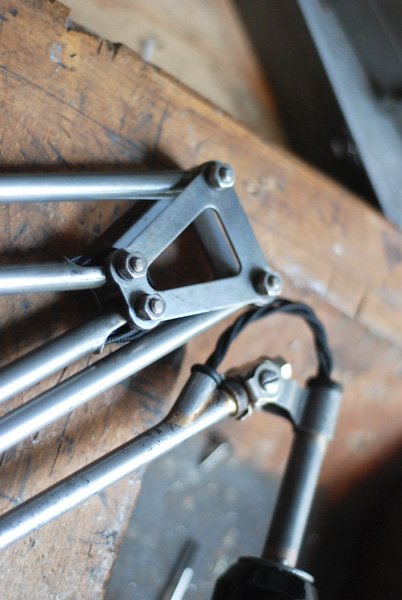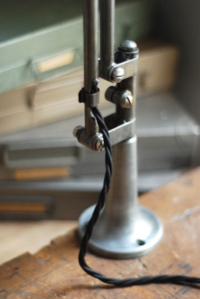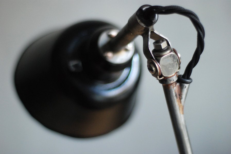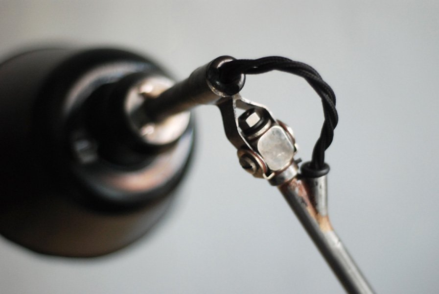 Die Elektrik wurde dreiadrig erneuert und generalüberholt. Es wurde ein schwarzes, stoffummanteltes Kabel verwendet.Die Leuchte wird mittels eines Drehschalters an der Fassung betätigt.