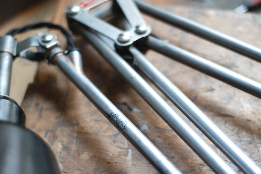 Nach der kompletten Zerlegung wurden die Elemente der Leuchte gereinigt, entlackt, mit Öl versiegelt und neu aufgebaut. Alle Einzelteile wurden entrostet, poliert, geölt.