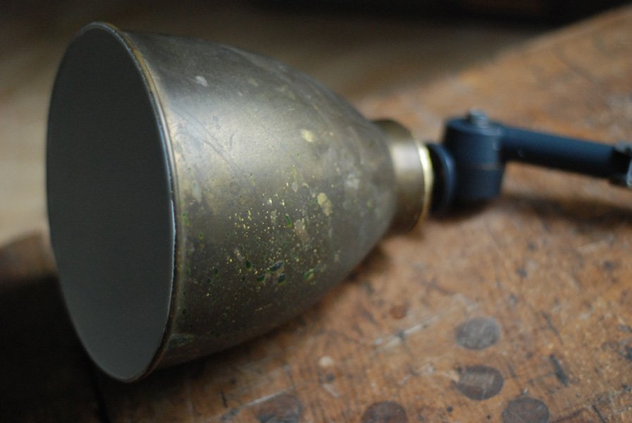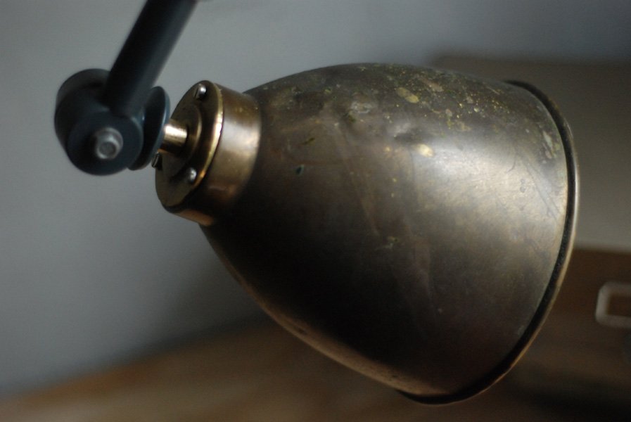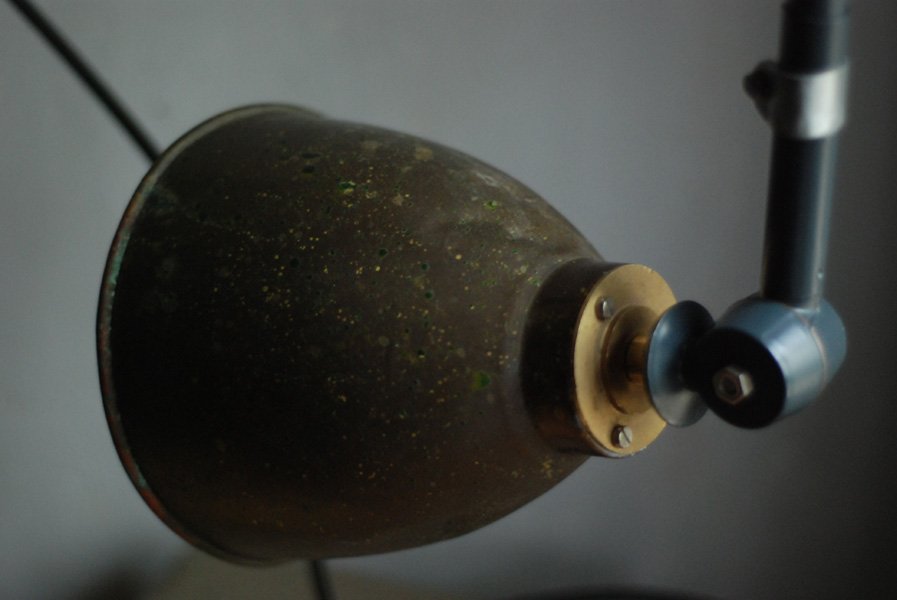 Die Leuchte befindet sich in einem gebrauchten Zustand. Der Schirm aus Messing eines anderen Herstellers weist Alter- und Nutzungsspuren, eine sehr schöne Patina und leichte Beulen am hinteren Teil auf.