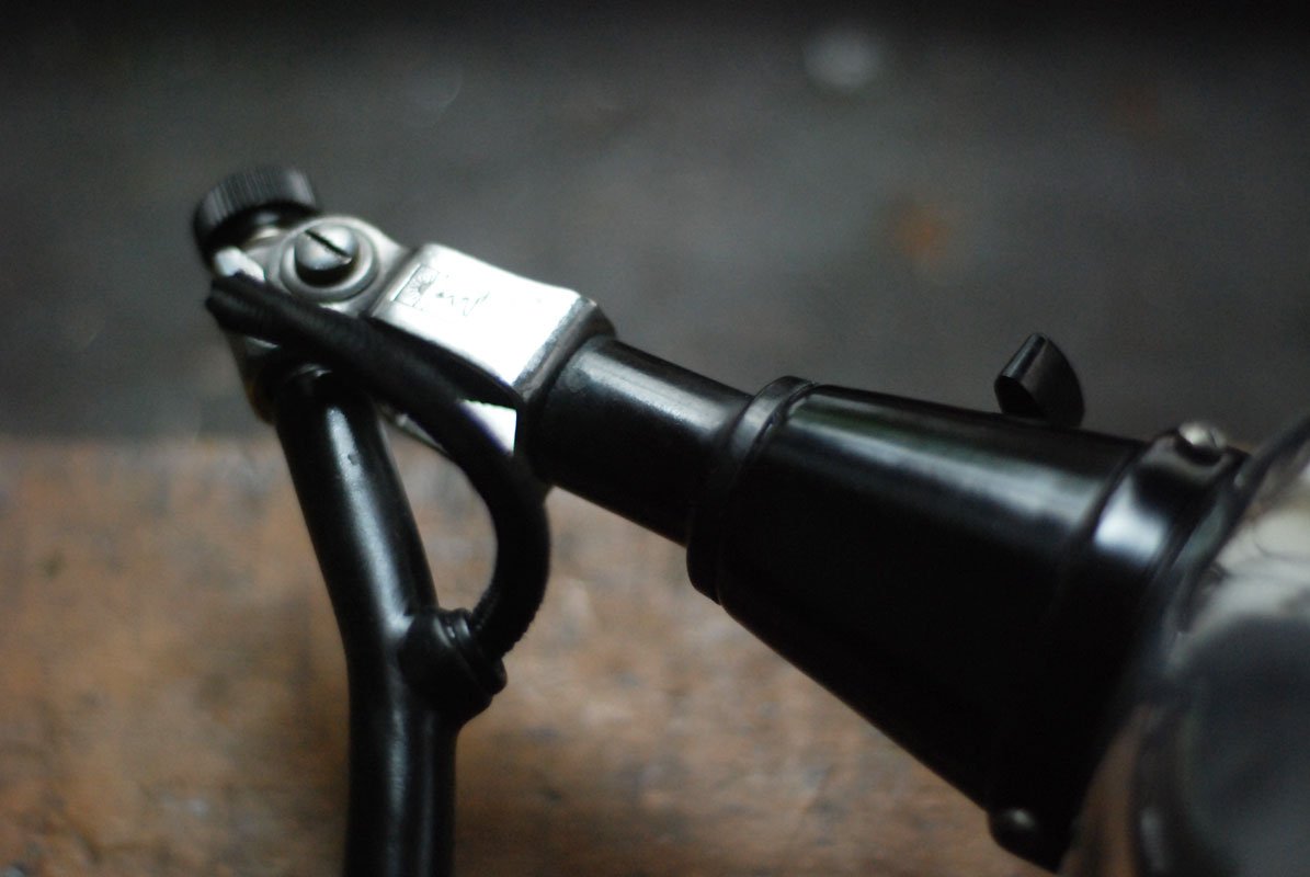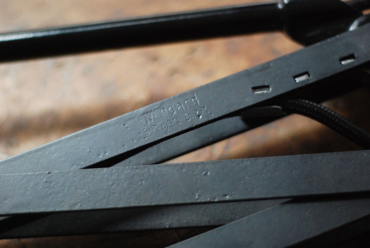 Geprägt ist die Leuchte am Kopf mit dem Midgard Logo, mit ‚DRGM‘ (Vorkrieg), auf der Schere mit ‚Midgard‘ und Einstellung.