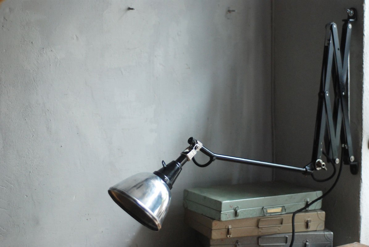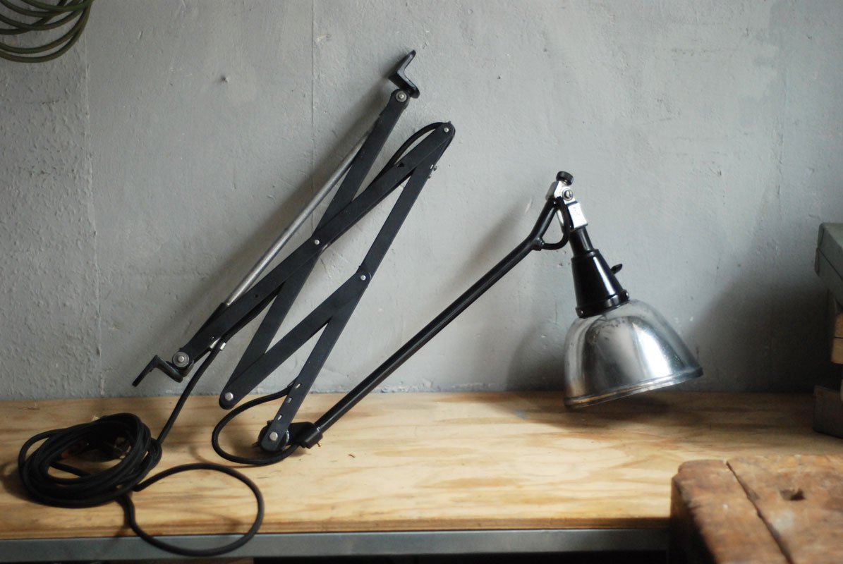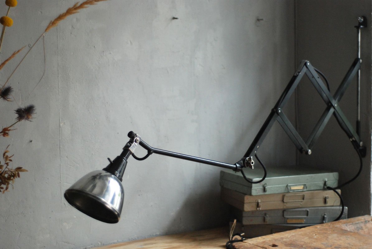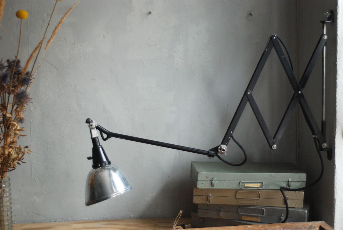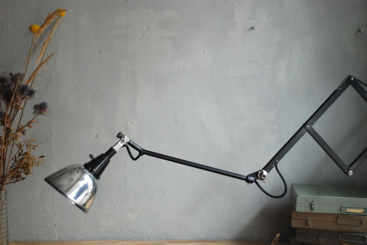 Grosse schwarze Scherenlampe Midgard Mod.112 mit poliertem Reflektor Der Entwurf dieser Scherenlampe stammt von Curt Fischer, der ab ca. 1920 an der Idee des „lenkbaren Lichtes“ gearbeitet hat. Noch vor den so bekannten Entwürfen von Christian Dell oder Marianne Brandt setzte Curt Fischer mit der allseitig beweglichen Arbeitsplatzleuchte die Idee des so genannten ‚lenkbaren Lichtes‘…