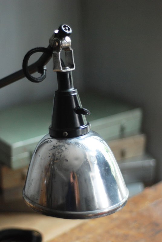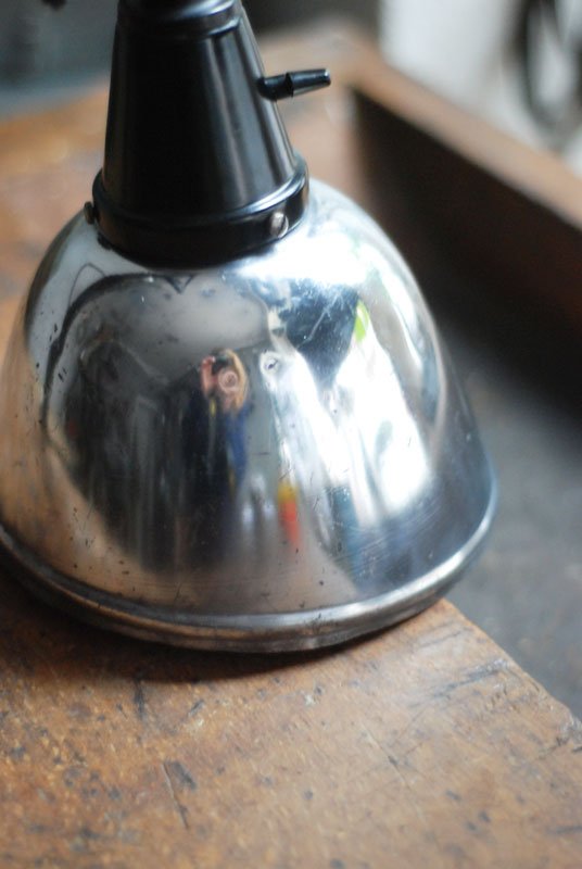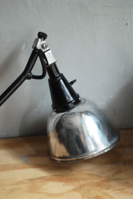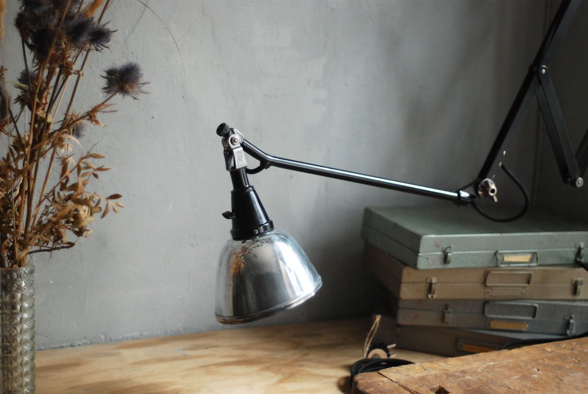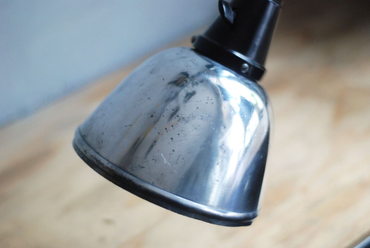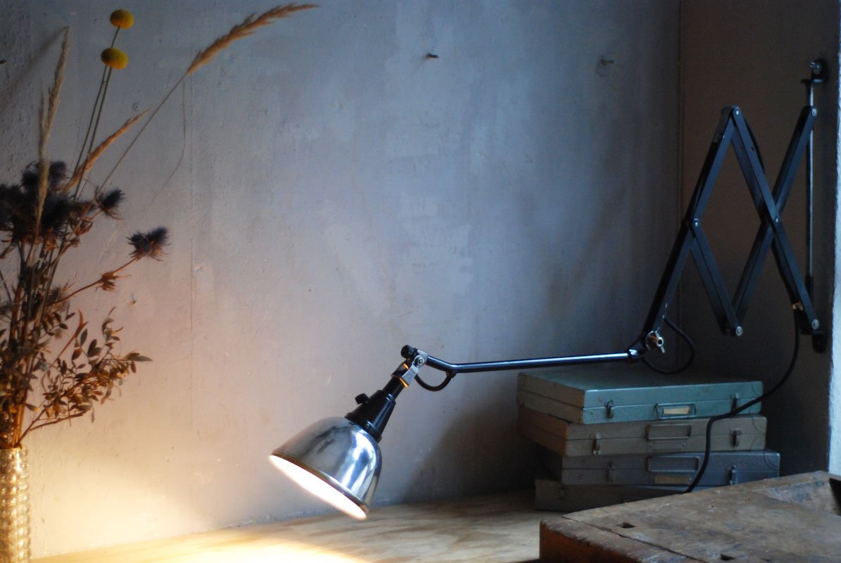 Grosse schwarze Scherenlampe Midgard Mod.112 mit poliertem Reflektor Der Entwurf dieser Scherenlampe stammt von Curt Fischer, der ab ca. 1920 an der Idee des „lenkbaren Lichtes“ gearbeitet hat. Noch vor den so bekannten Entwürfen von Christian Dell oder Marianne Brandt setzte Curt Fischer mit der allseitig beweglichen Arbeitsplatzleuchte die Idee des so genannten ‚lenkbaren Lichtes‘…