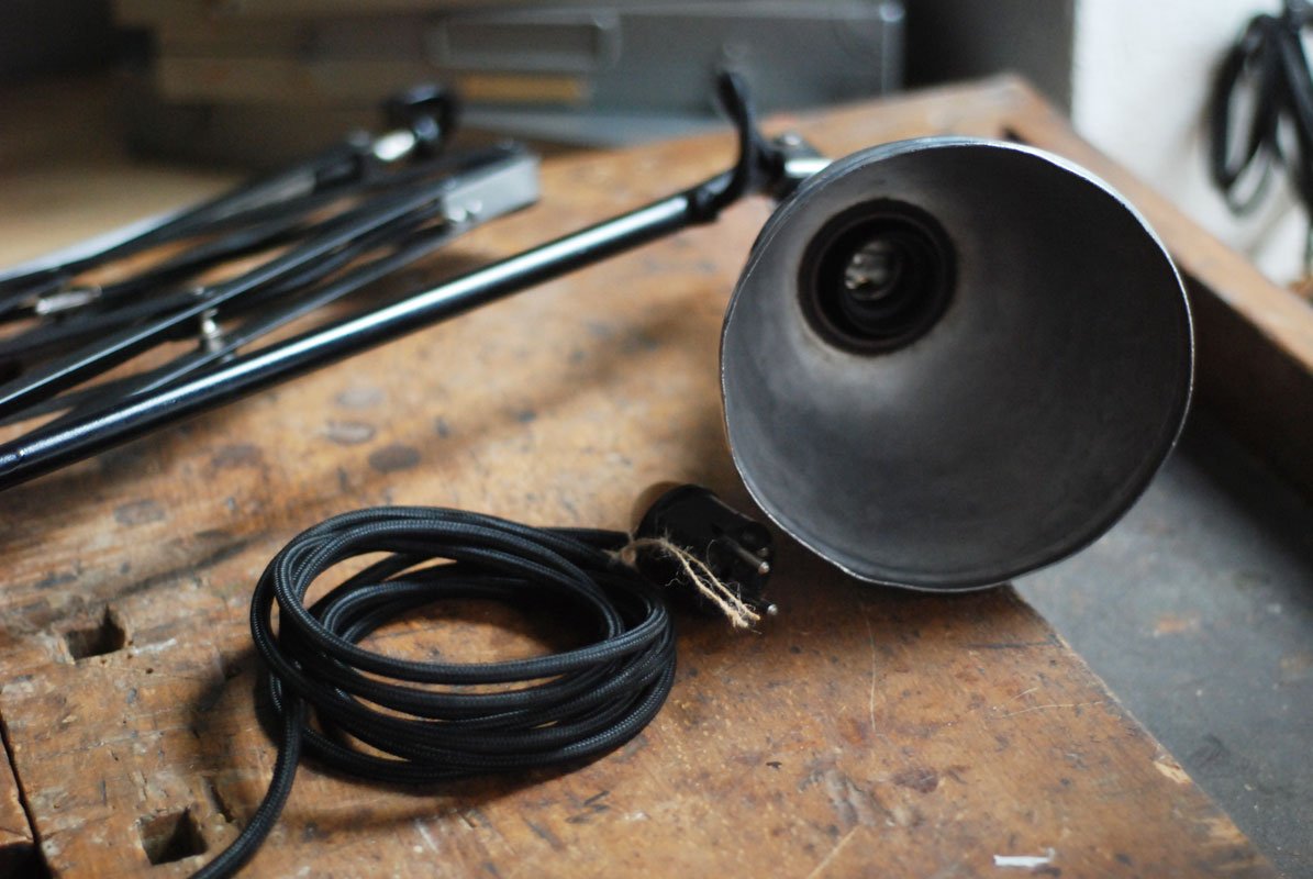 Die Elektrik wurde dreiadrig erneuert und generalüberholt. Es wurde ein schwarzes, stoffummanteltes Kabel verwendet. Die Leuchte wird mittels des Drehschalters an der Fassung betätigt.