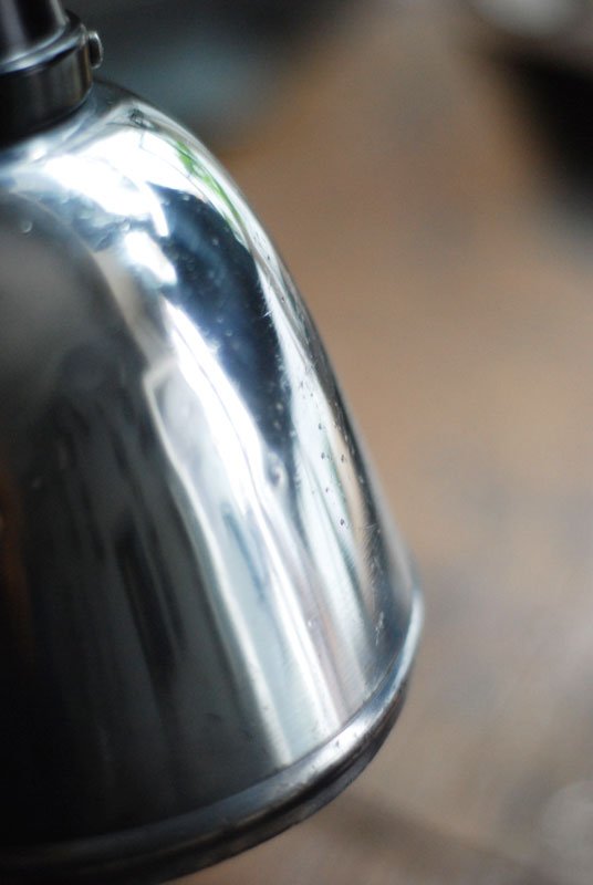 Nach der kompletten Zerlegung und sorgsamen Reinigung wurden die Elemente der Leuchte voll entlackt, neu lackiert und neu aufgebaut.
