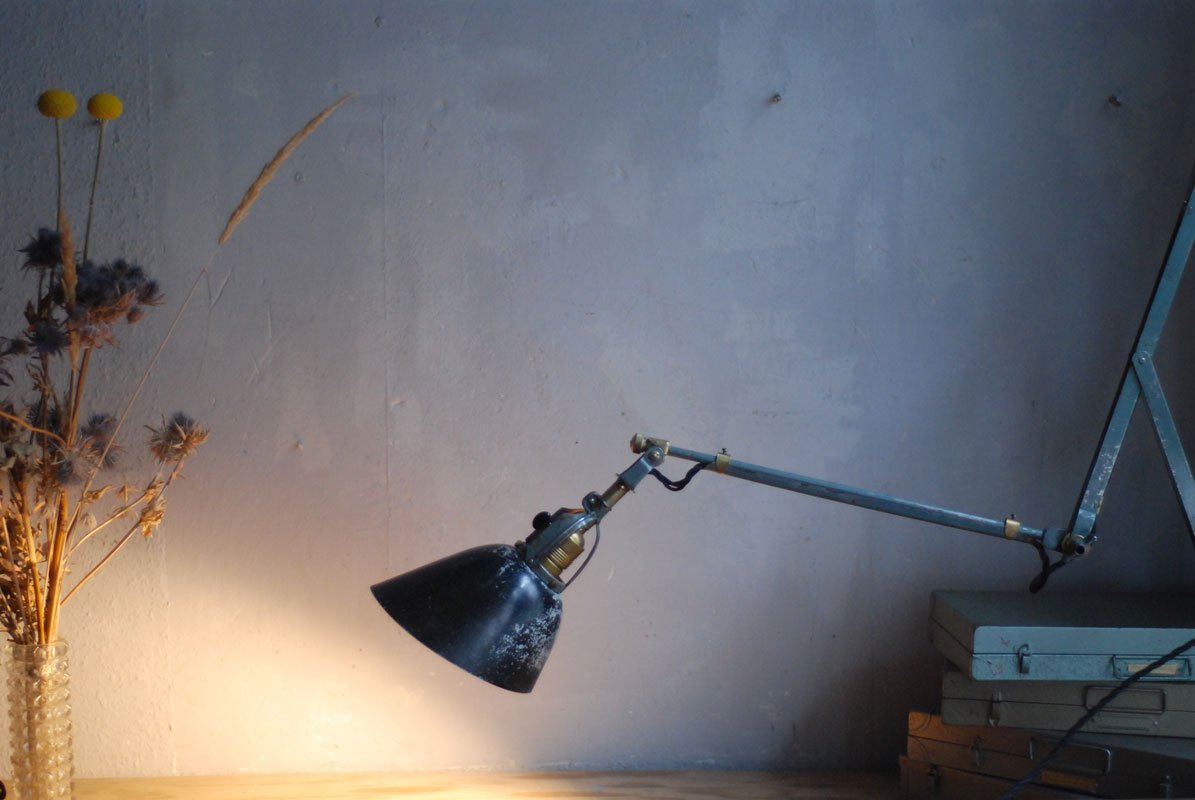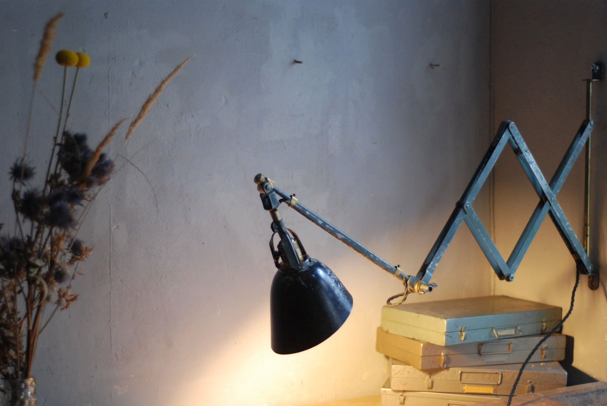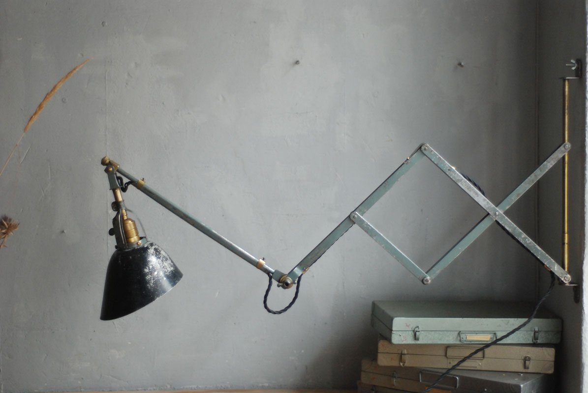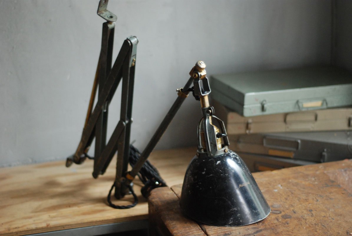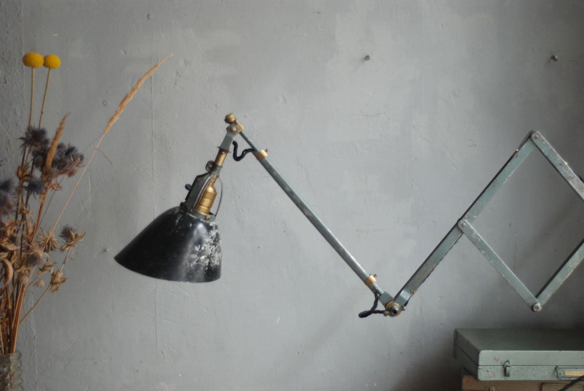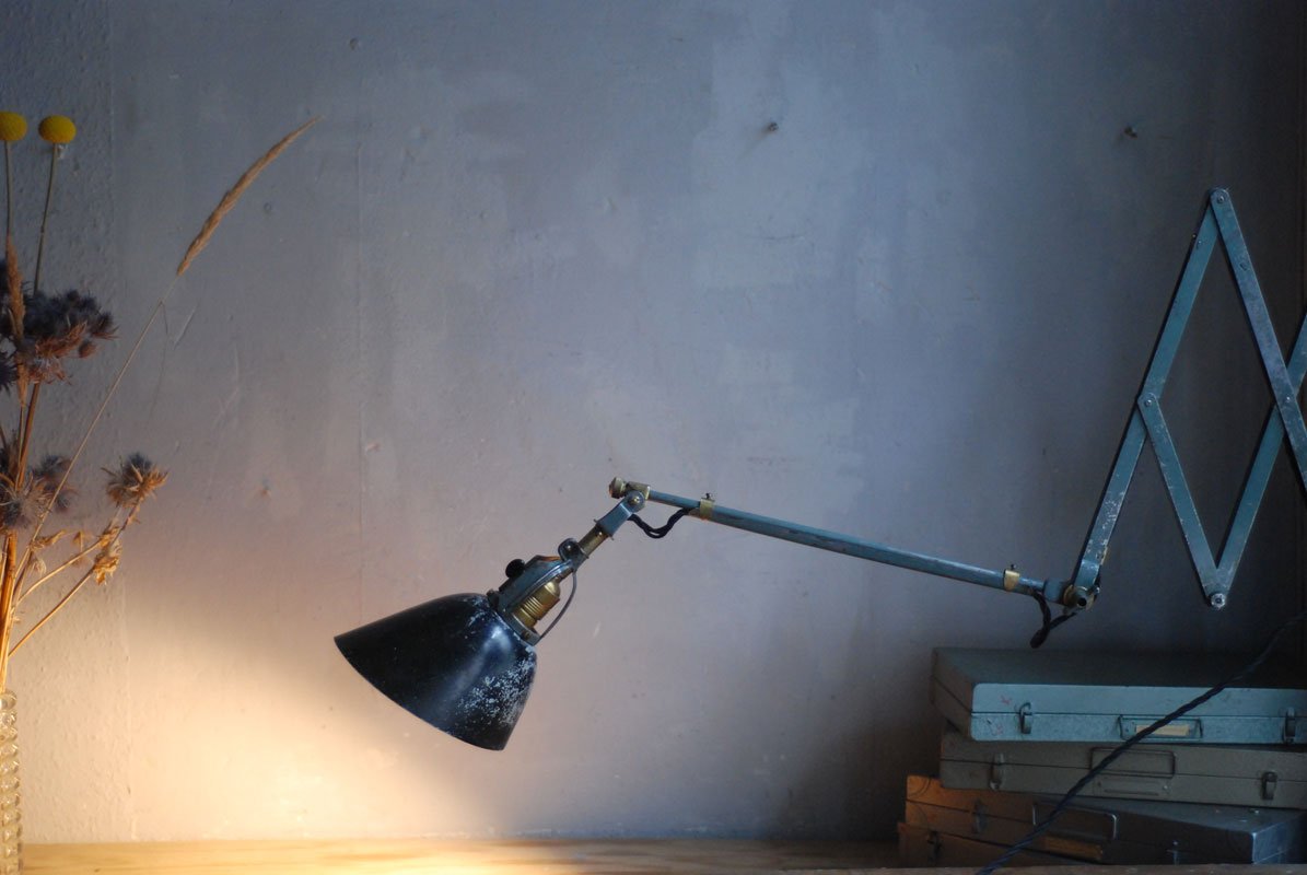 Wundeschöne seltene frühe Scherenlampe Midgard in Originalerhalt mit schrägem Reflektor aus Aluminium, Mod.112. Der Entwurf dieser Scherenlampe stammt von Curt Fischer, der ab ca. 1920 an der Idee des „lenkbaren Lichtes“ gearbeitet hat. Noch vor den so bekannten Entwürfen von Christian Dell oder Marianne Brandt setzte Curt Fischer mit der allseitig beweglichen Arbeitsplatzleuchte die Idee…