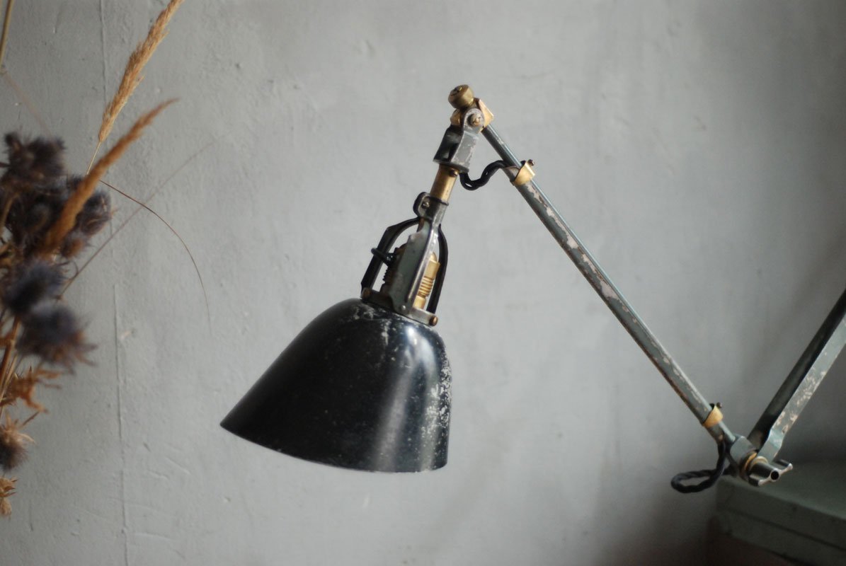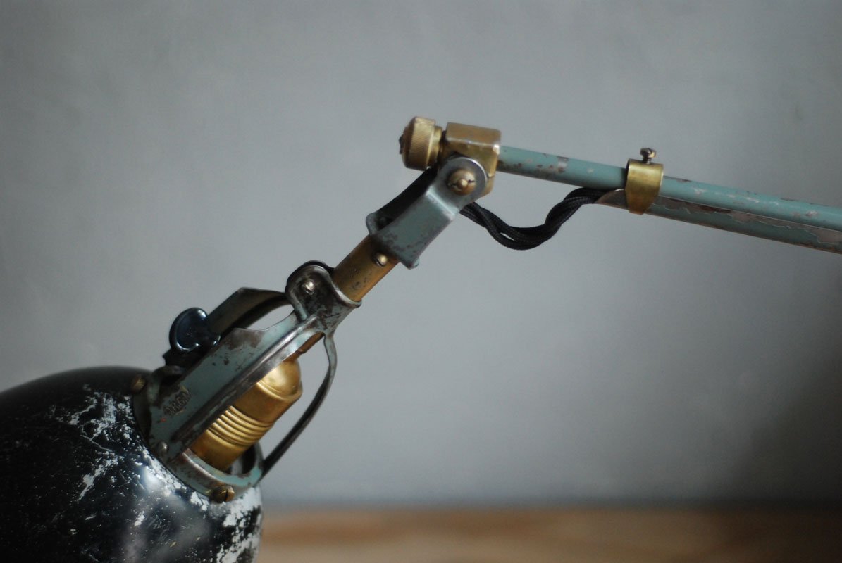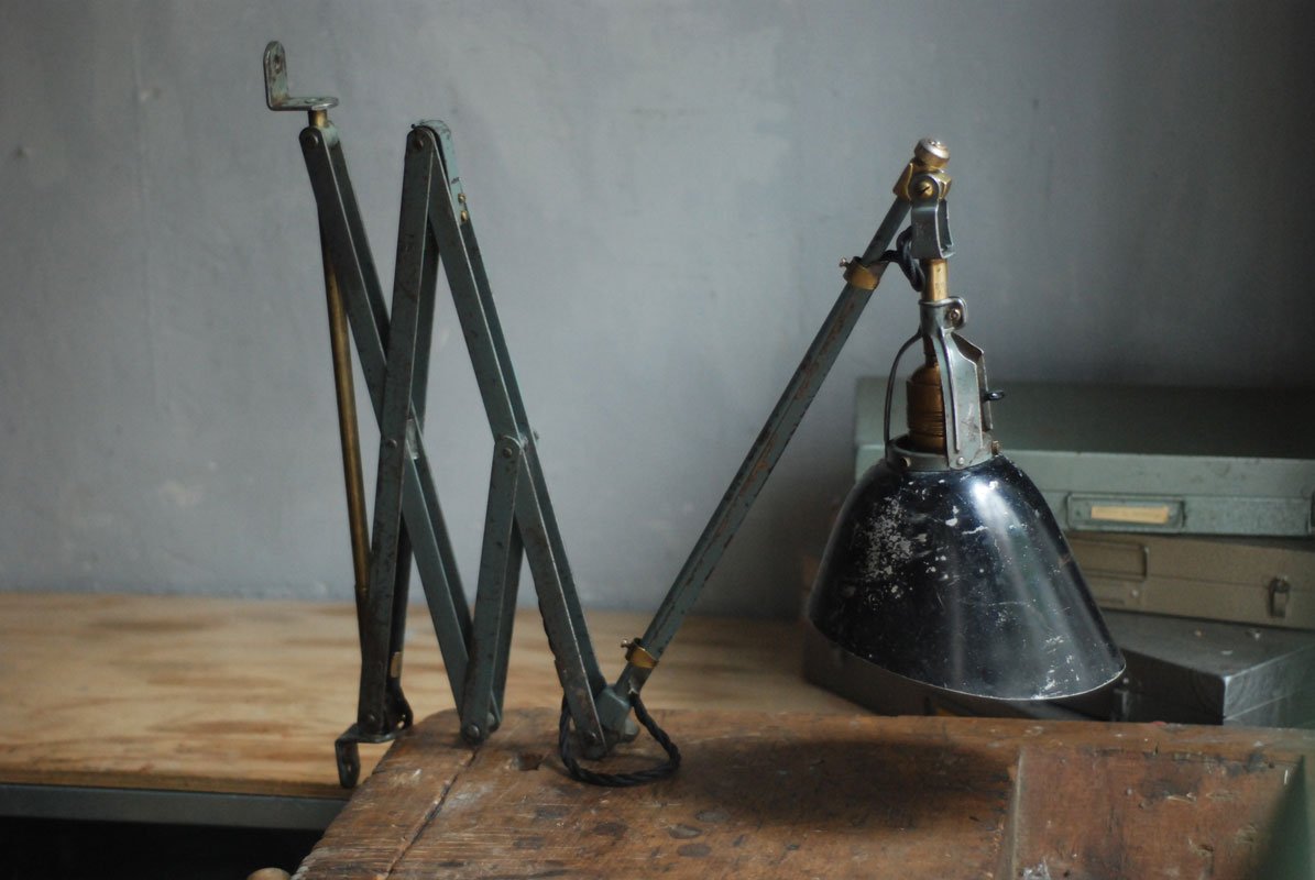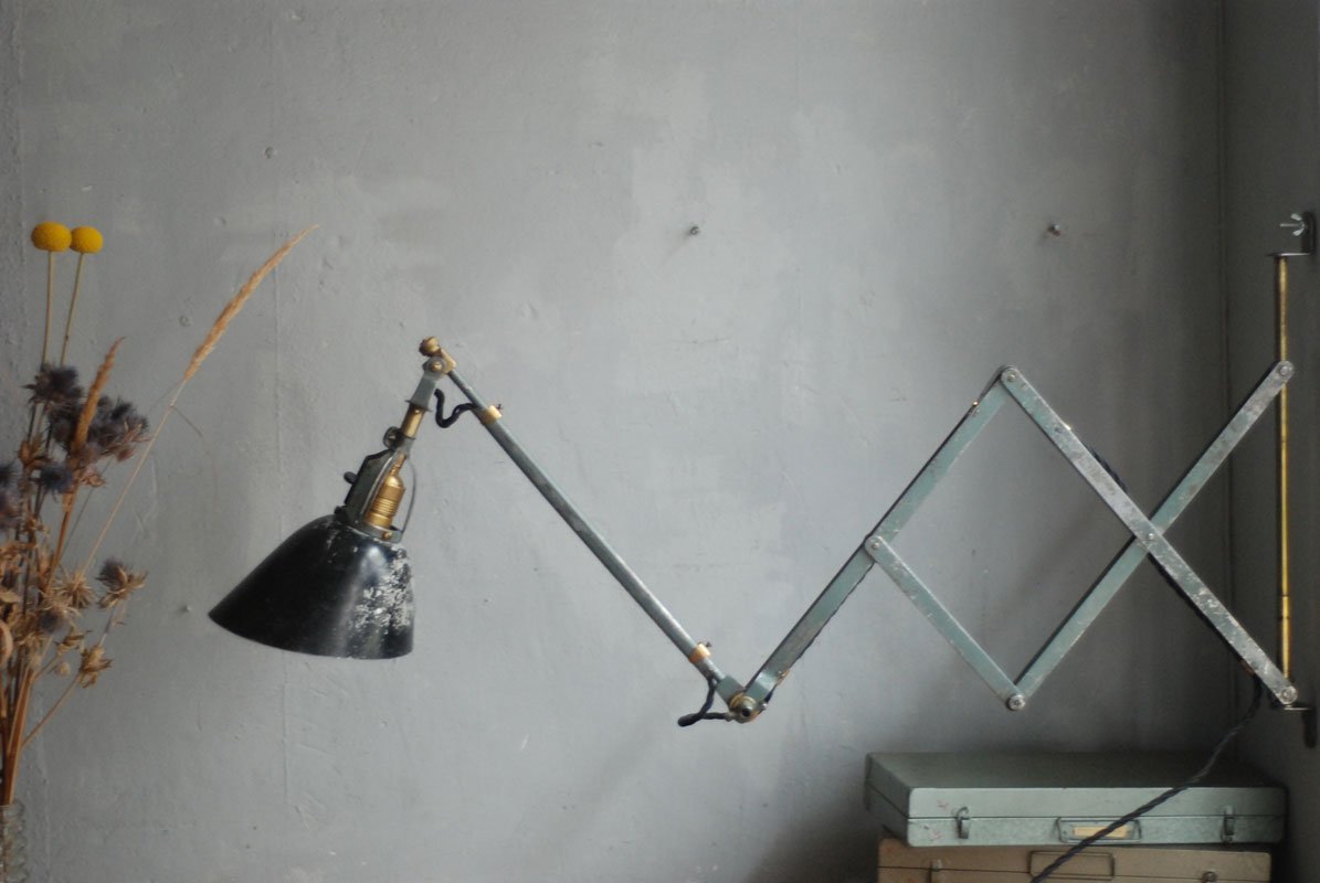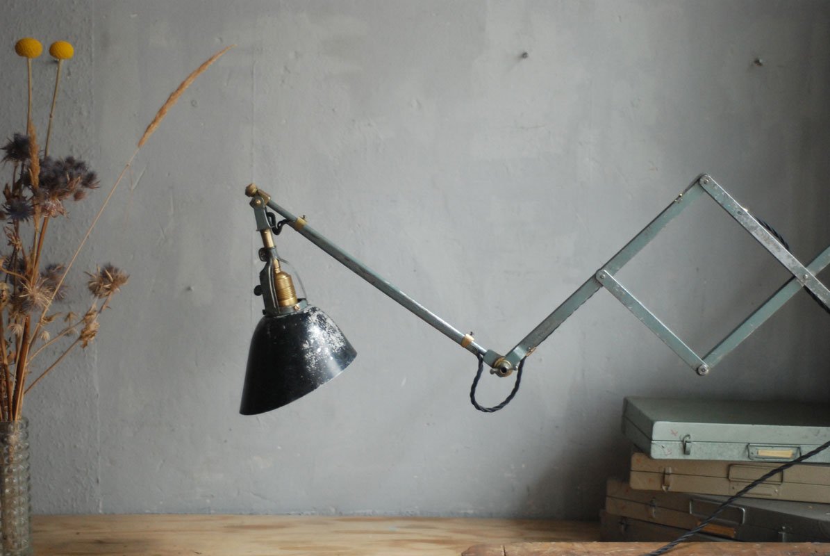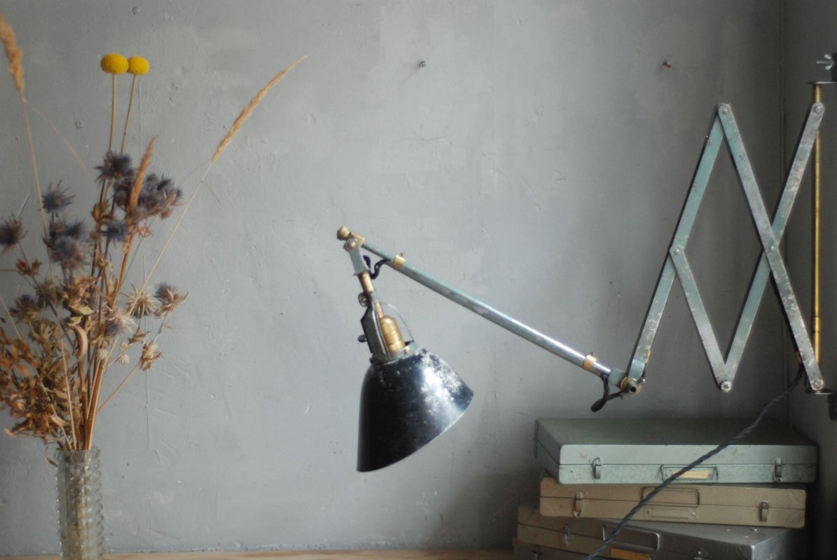 Wundeschöne seltene frühe Scherenlampe Midgard in Originalerhalt mit schrägem Reflektor aus Aluminium, Mod.112. Der Entwurf dieser Scherenlampe stammt von Curt Fischer, der ab ca. 1920 an der Idee des „lenkbaren Lichtes“ gearbeitet hat. Noch vor den so bekannten Entwürfen von Christian Dell oder Marianne Brandt setzte Curt Fischer mit der allseitig beweglichen Arbeitsplatzleuchte die Idee…