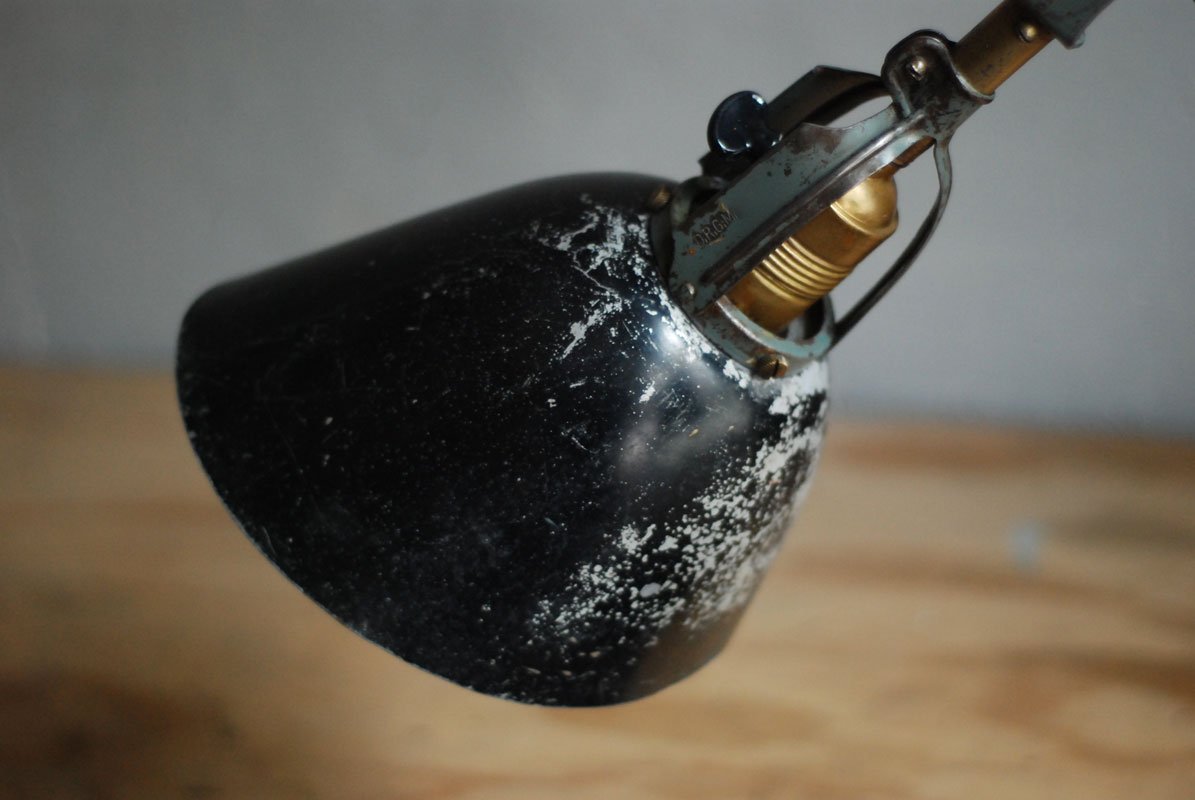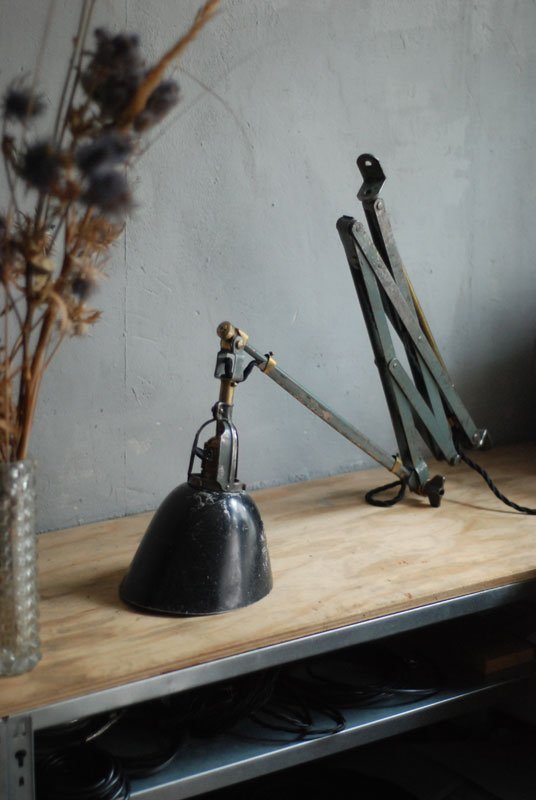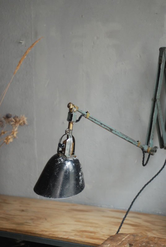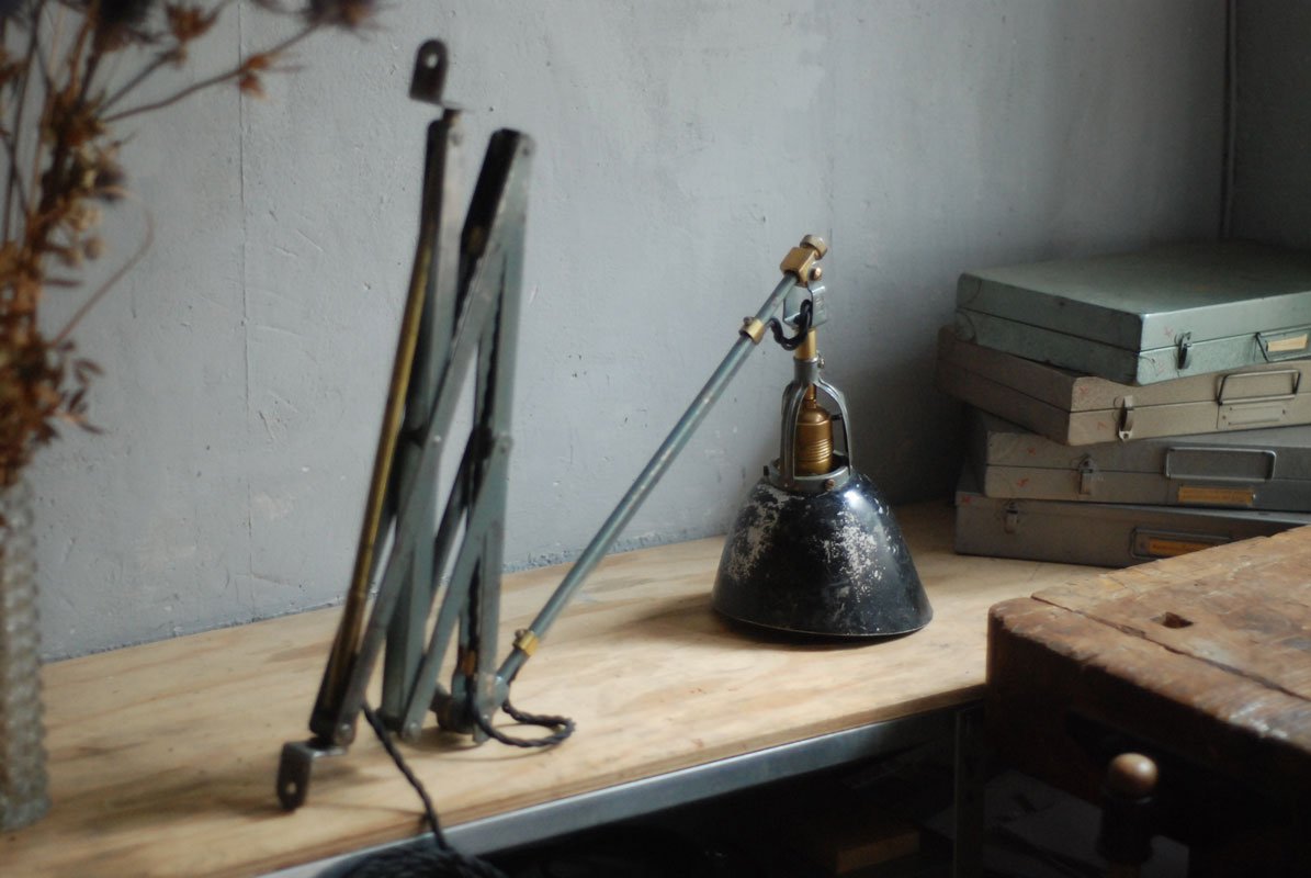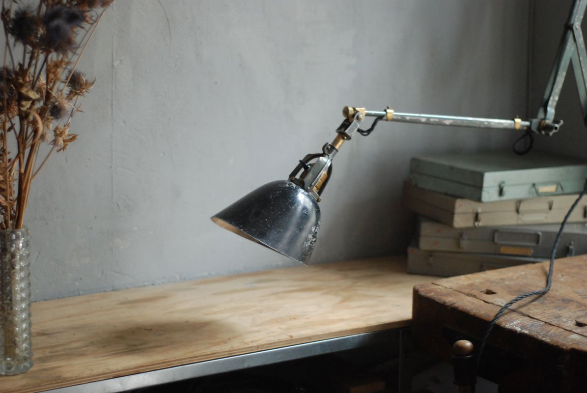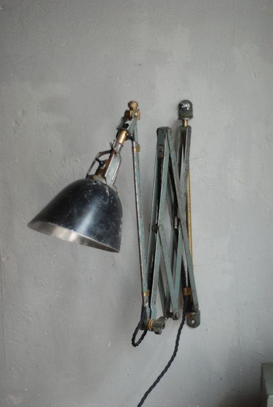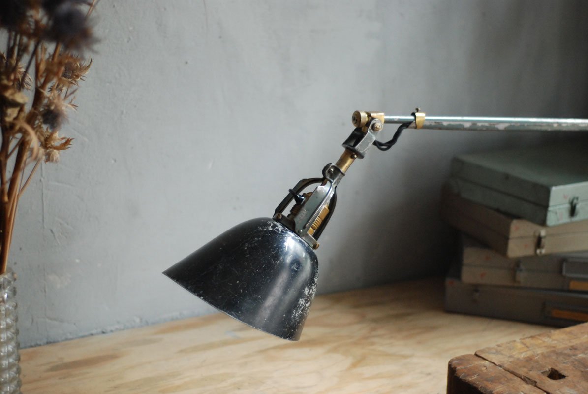 Wundeschöne seltene frühe Scherenlampe Midgard in Originalerhalt mit schrägem Reflektor aus Aluminium, Mod.112. Der Entwurf dieser Scherenlampe stammt von Curt Fischer, der ab ca. 1920 an der Idee des „lenkbaren Lichtes“ gearbeitet hat. Noch vor den so bekannten Entwürfen von Christian Dell oder Marianne Brandt setzte Curt Fischer mit der allseitig beweglichen Arbeitsplatzleuchte die Idee…