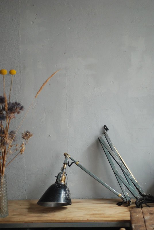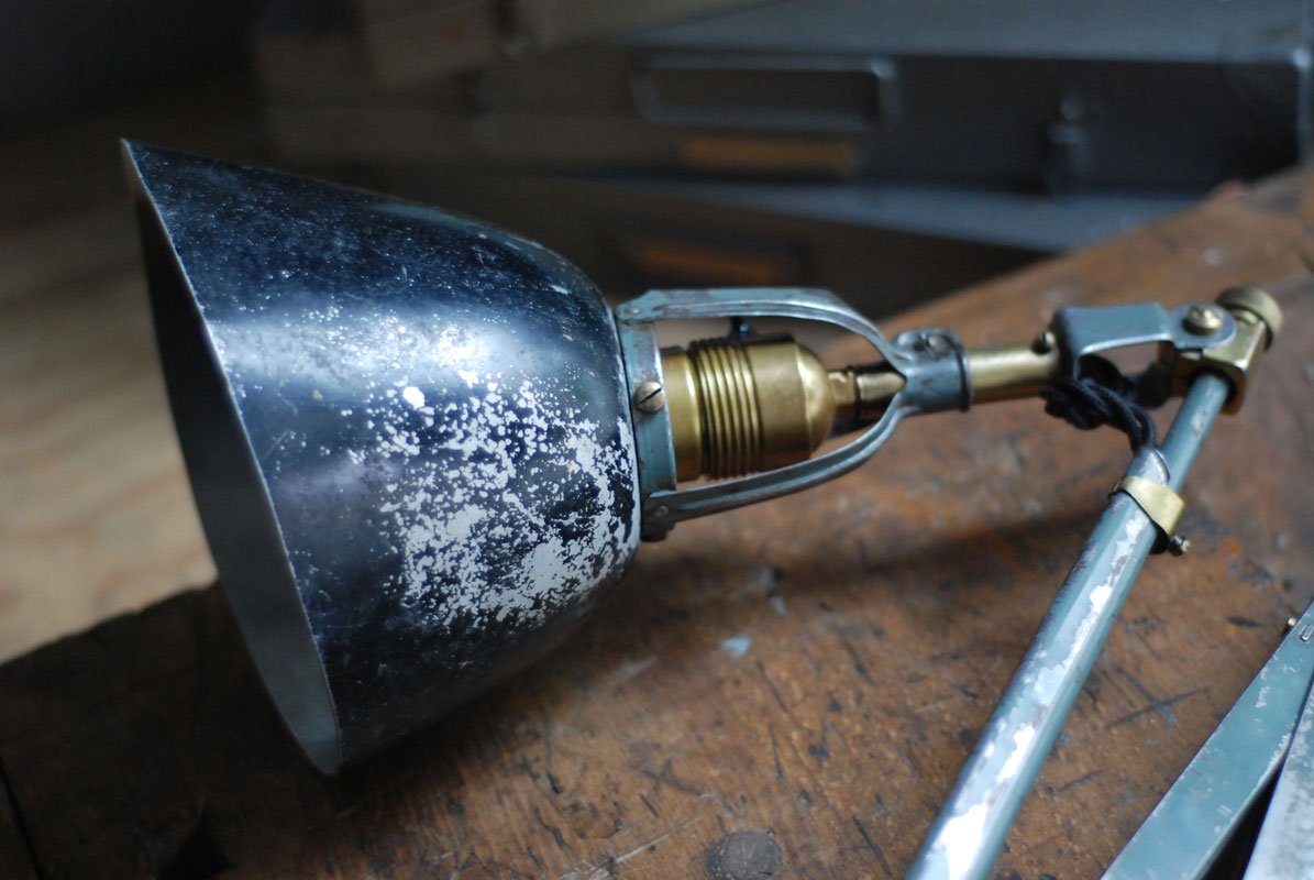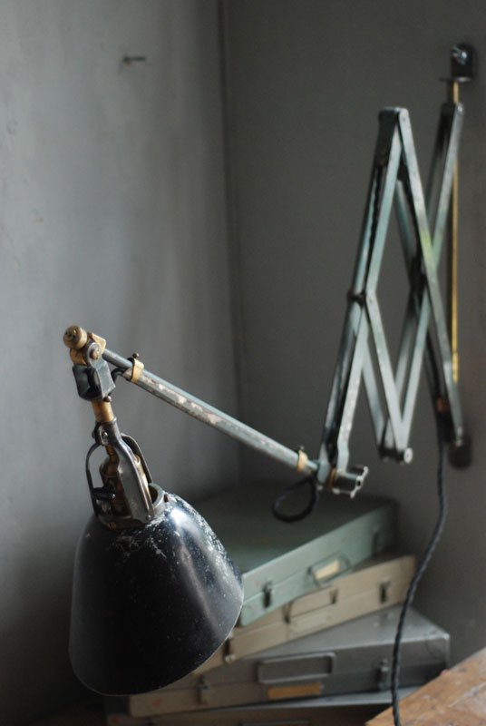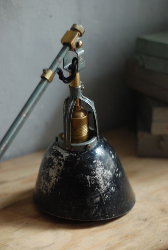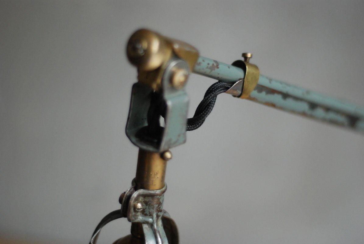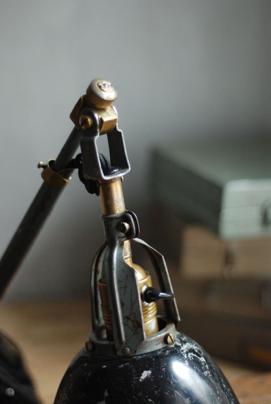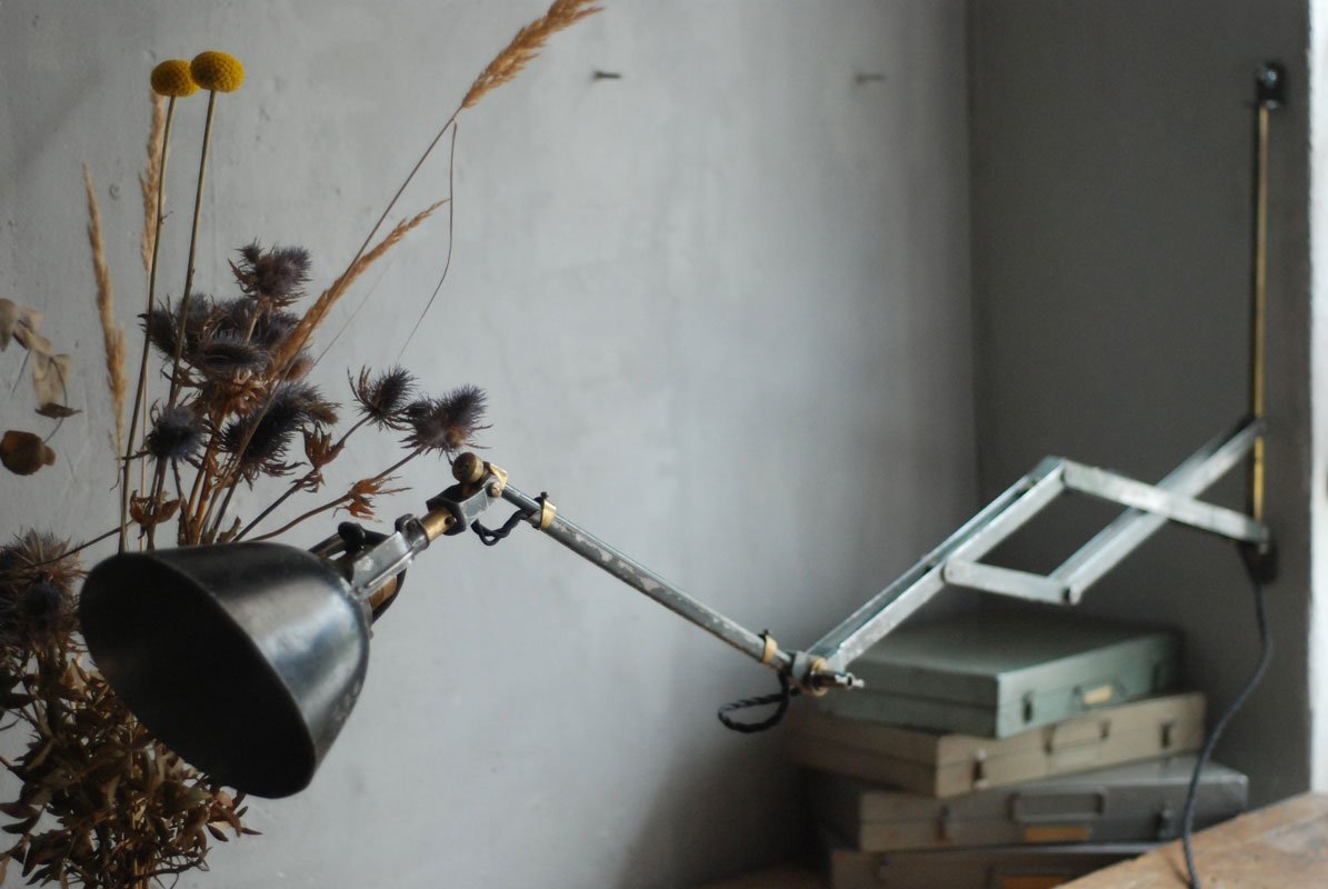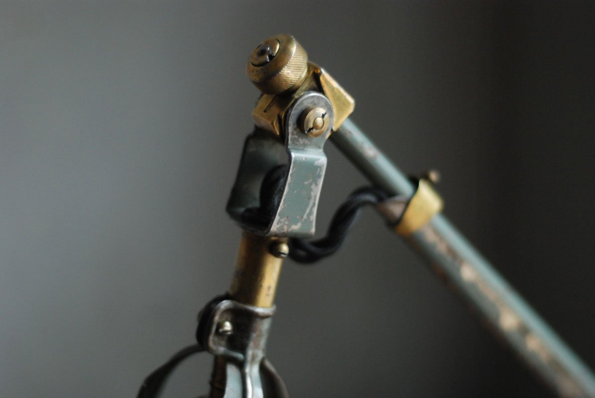 Wundeschöne seltene frühe Scherenlampe Midgard in Originalerhalt mit schrägem Reflektor aus Aluminium, Mod.112. Der Entwurf dieser Scherenlampe stammt von Curt Fischer, der ab ca. 1920 an der Idee des „lenkbaren Lichtes“ gearbeitet hat. Noch vor den so bekannten Entwürfen von Christian Dell oder Marianne Brandt setzte Curt Fischer mit der allseitig beweglichen Arbeitsplatzleuchte die Idee…