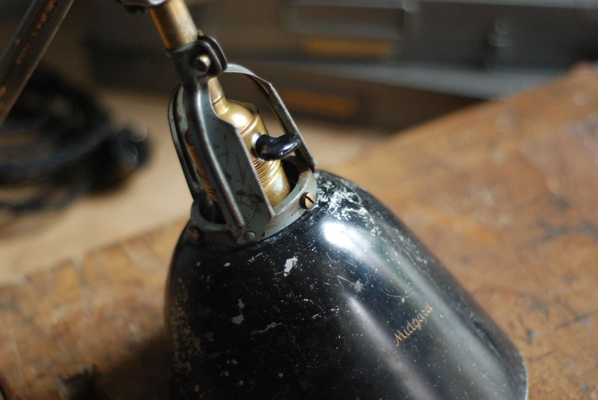 Der Entwurf dieser Scherenlampe stammt von Curt Fischer, der ab ca. 1920 an der Idee des „lenkbaren Lichtes“ gearbeitet hat. Noch vor den so bekannten Entwürfen von Christian Dell oder Marianne Brandt setzte Curt Fischer mit der allseitig beweglichen Arbeitsplatzleuchte die Idee des so genannten ‚lenkbaren Lichtes‘ um. Die Metallwerkstatt im Bauhaus in Weimar wurde mit Midgard-Leuchten erhellt und diente den Bauhaus-Studenten als Vorbild und ist später auch in die Wohnzimmereinrichtung von Ilse und Walter Gropius in deren Meisterhaus am Dessauer Bauhaus belegbar.