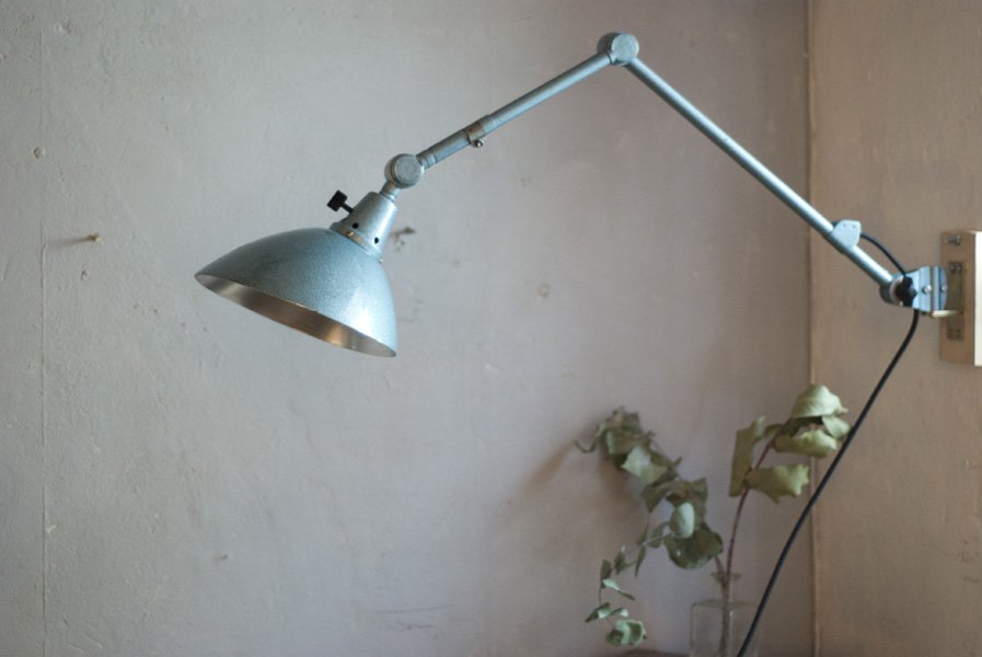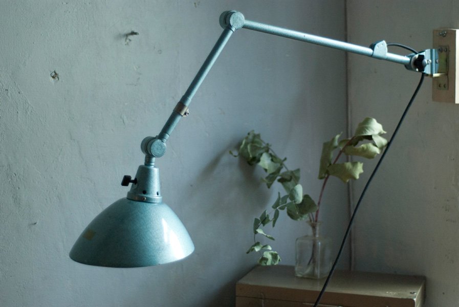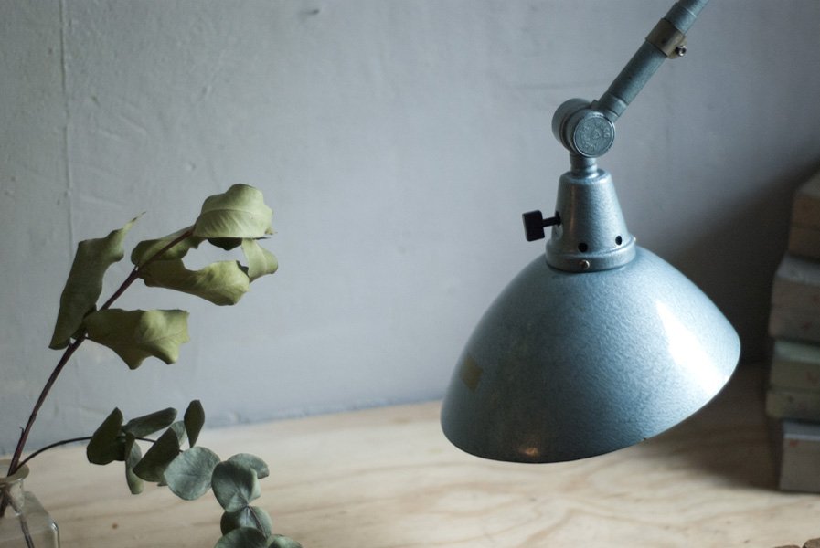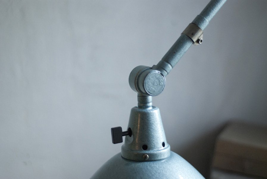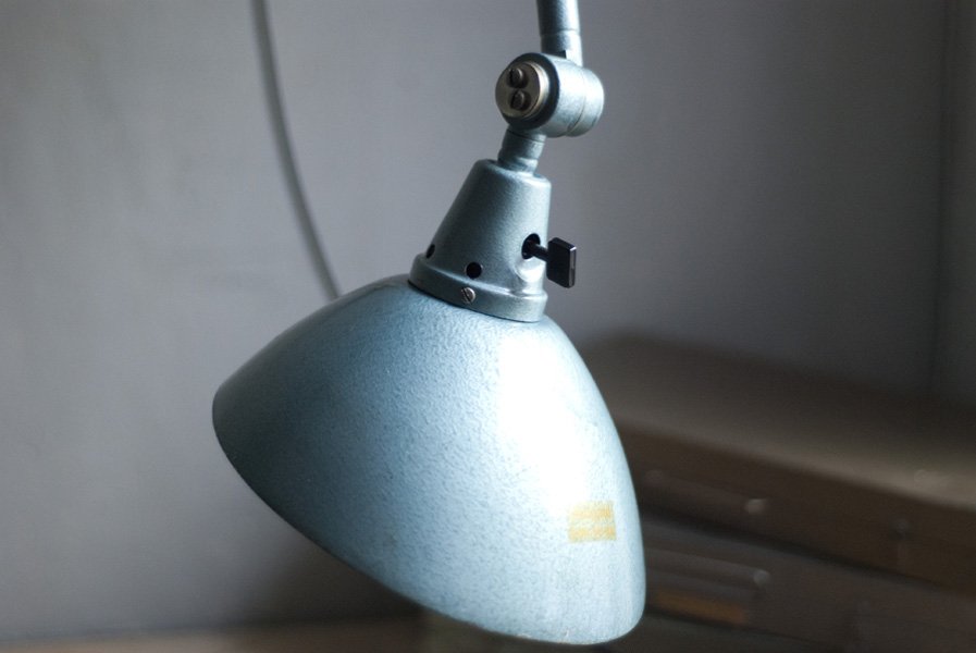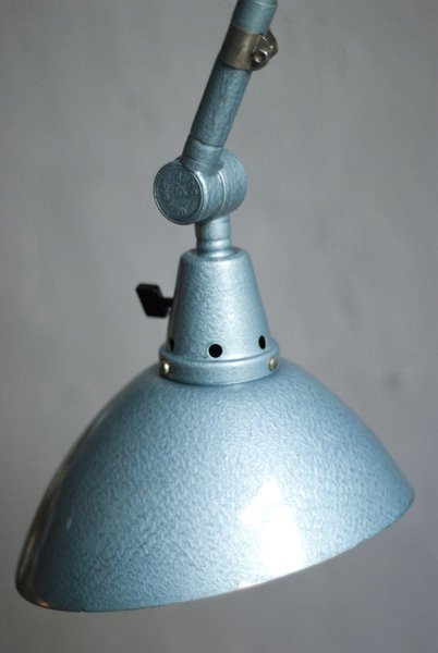 Gelenklampe in Originalzustand mit blauer Hammerschlaglackierung und großem Schirm.