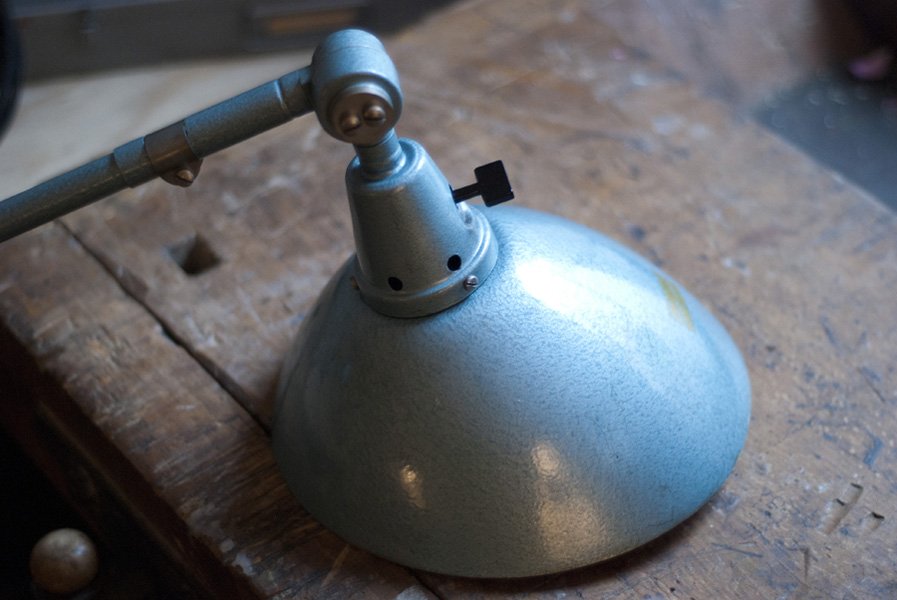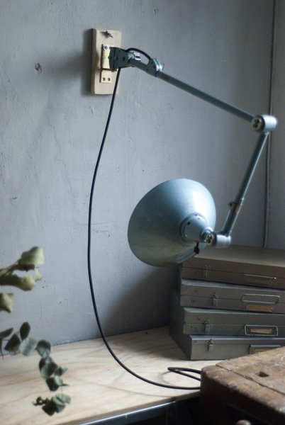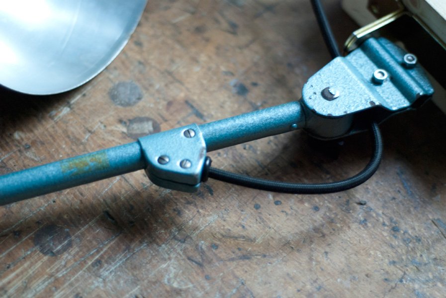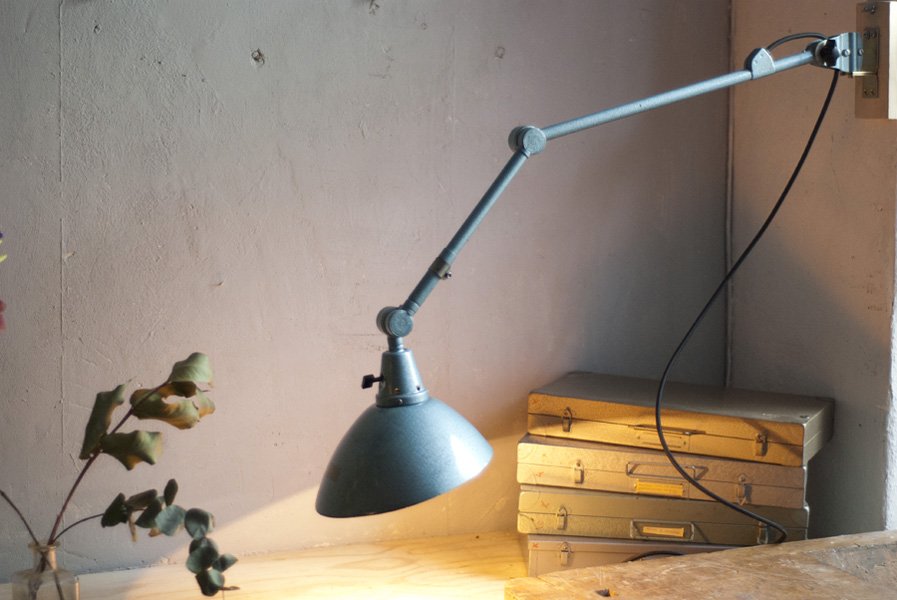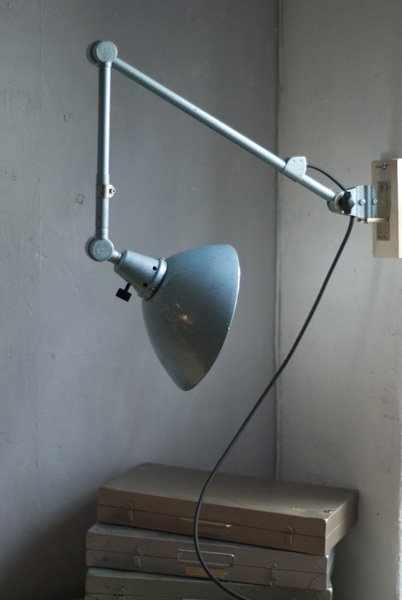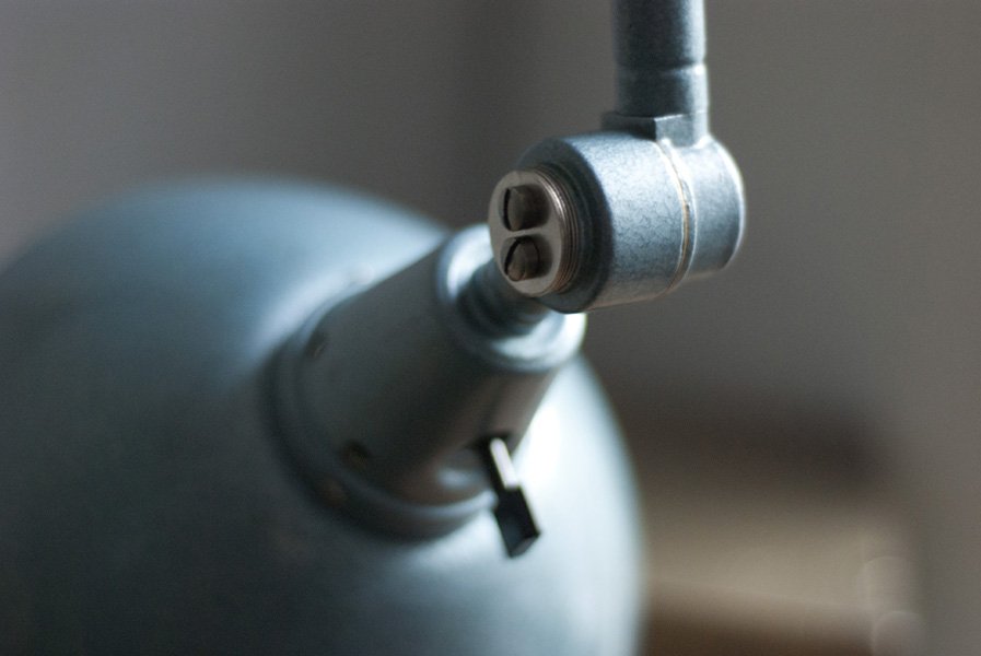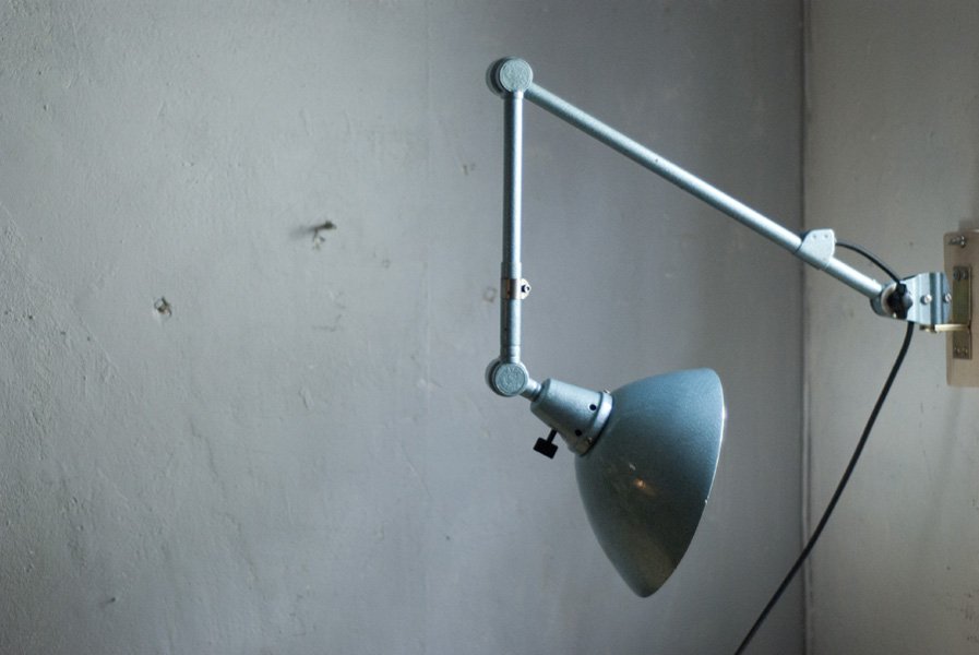 Gelenklampe in Originalzustand mit blauer Hammerschlaglackierung und großem Schirm.