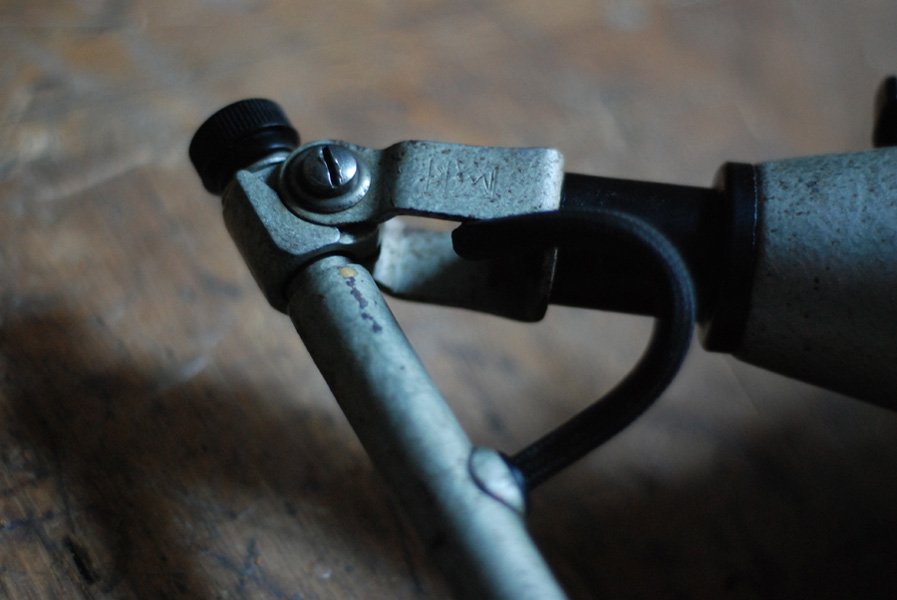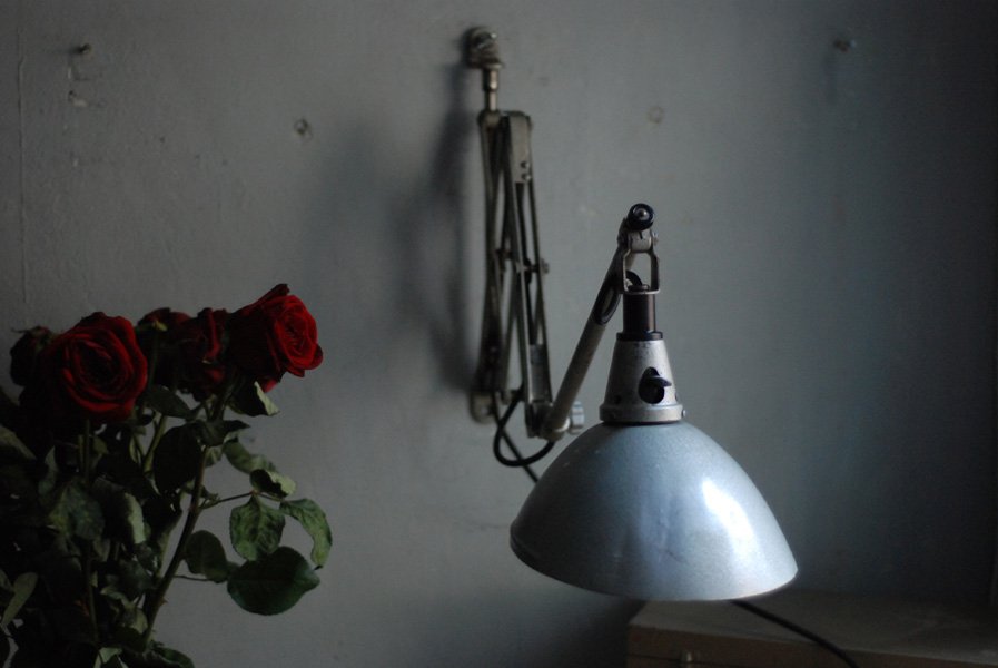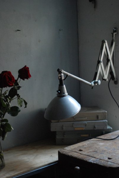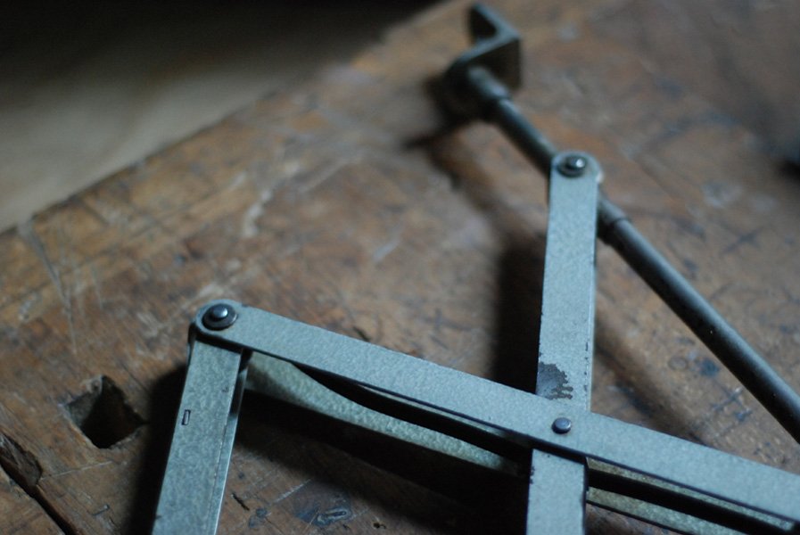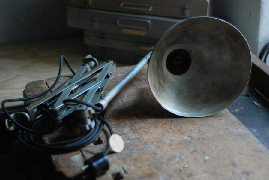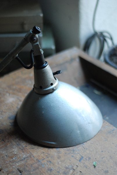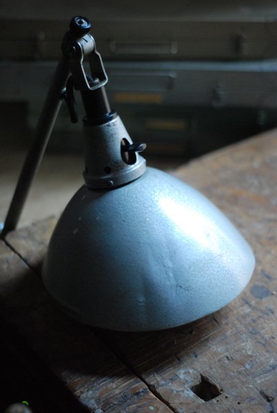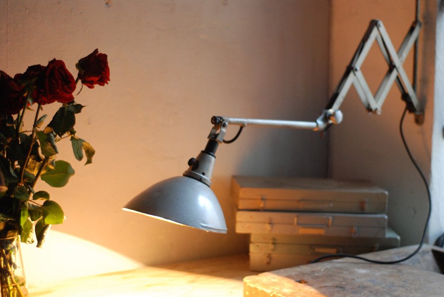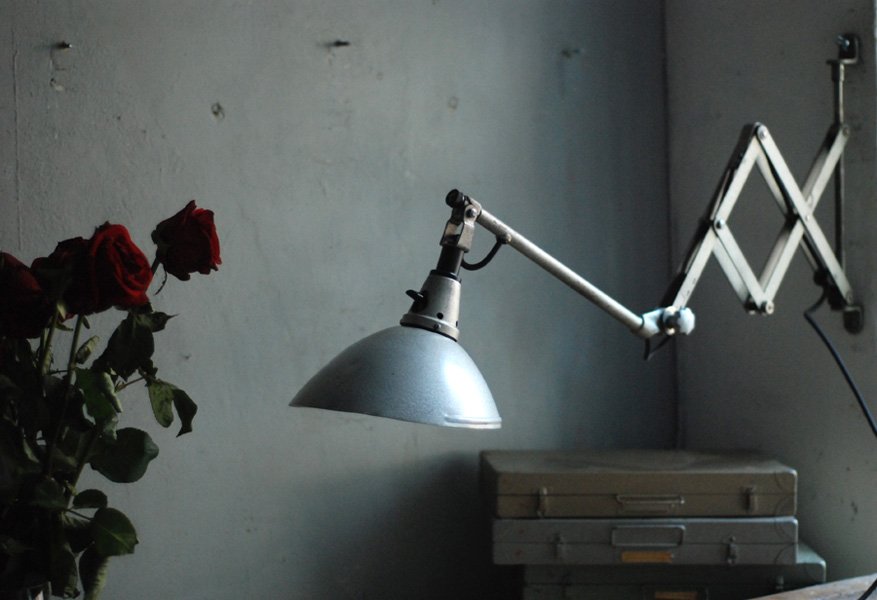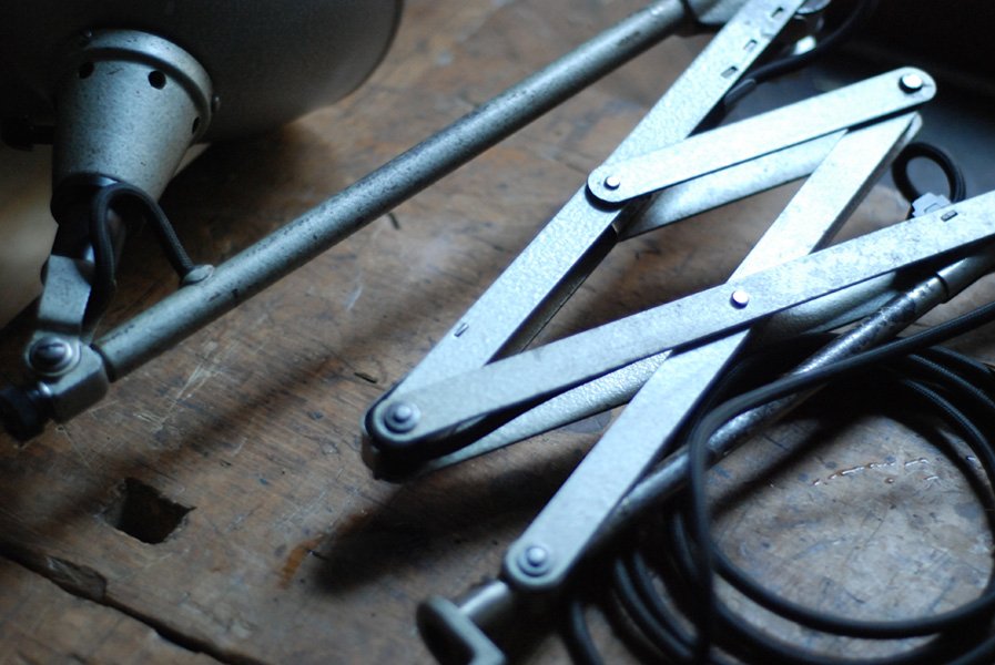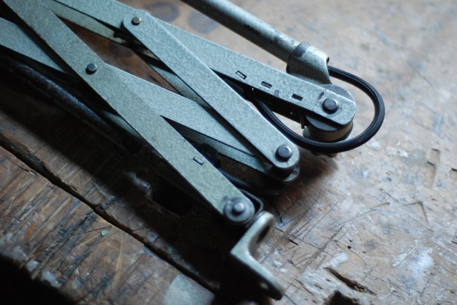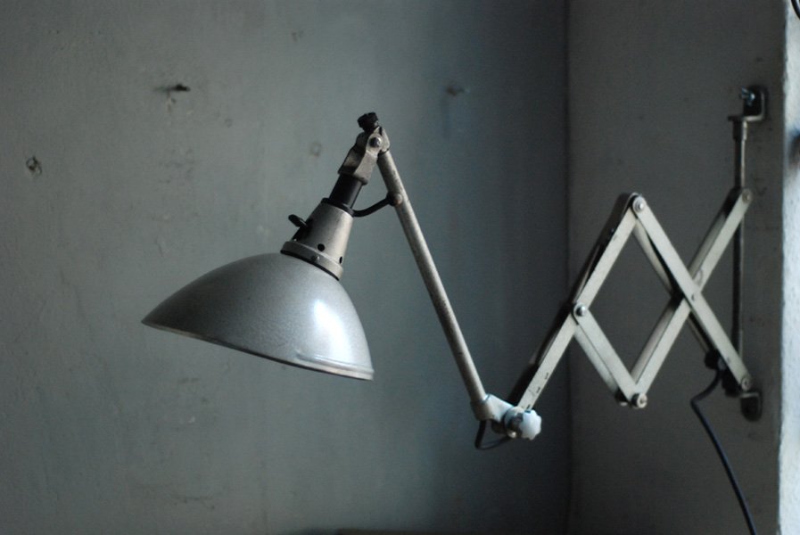 Alte Scherenlampe Midgard 110 DRGM DRP in Originalerhalt mit grauer Hammerschlaglackierung