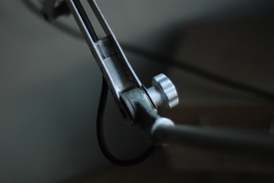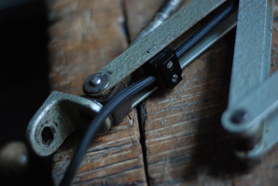 Die Elektrik wurde dreiadrig erneuert und generalüberholt. Es wurde ein schwarzes, stoffummanteltes Kabel verwendet. Die Leuchte wird mittels eines Drehschalters an der schönen originalen Messingfassung betätigt.