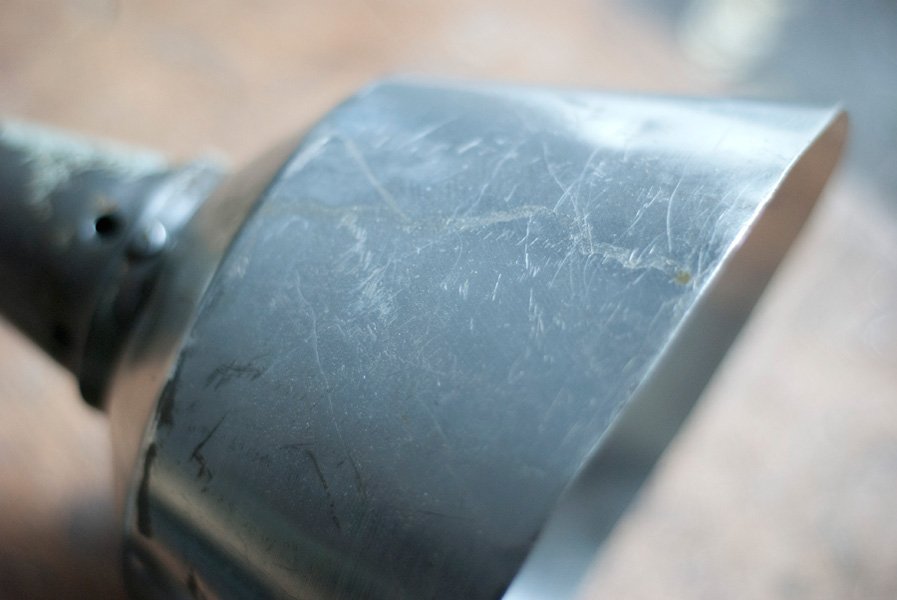 Die Leuchte befindet sich in einem gebrauchten Zustand. Der Schirm aus Aluminium weist Alter- und Nutzungsspuren auf, hat ein paar Kratzer und eine Beule.