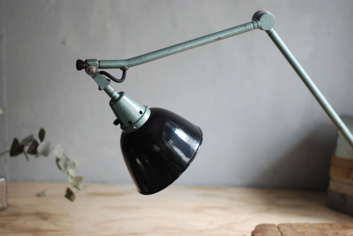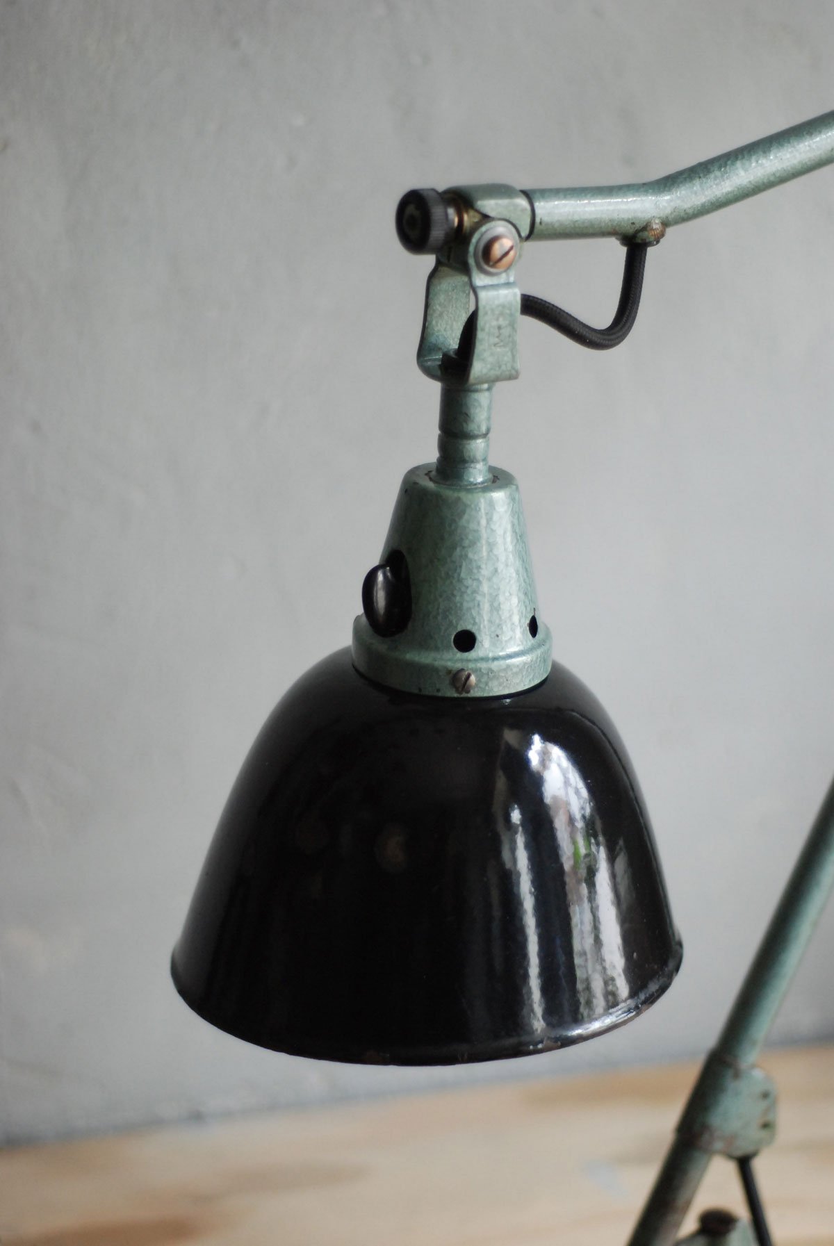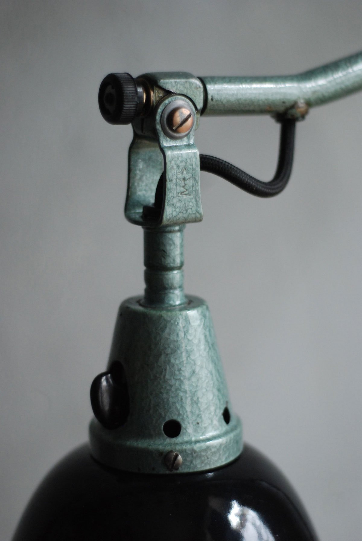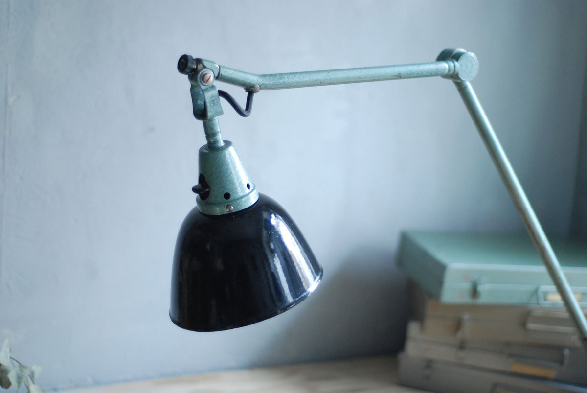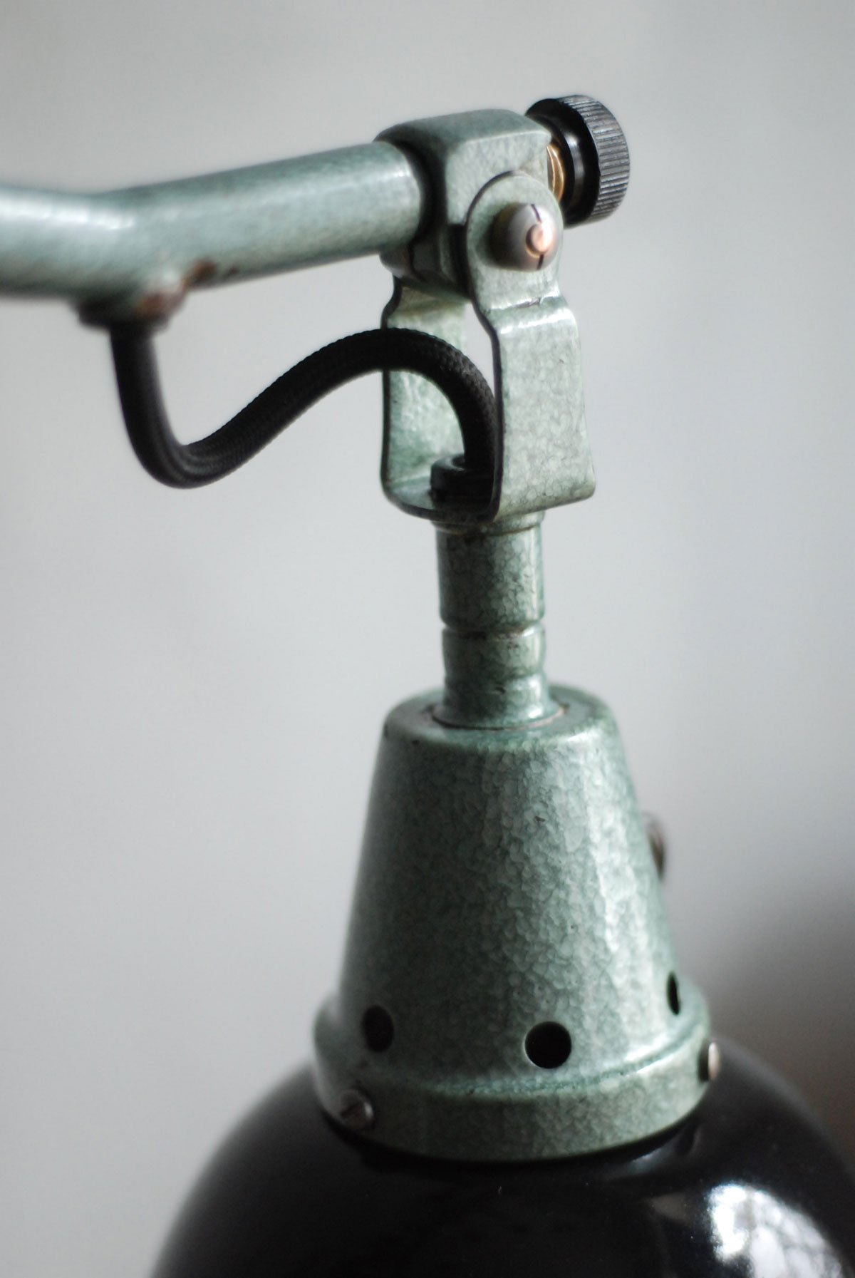 Doppeltischarm Midgard mit Originallackierung und emaillertem Reflektor. Der Entwurf dieser Gelenklampe stammt von Curt Fischer, der ab ca. 1920 an der Idee des „lenkbaren Lichtes“ gearbeitet hat. Noch vor den so bekannten Entwürfen von Christian Dell oder Marianne Brandt setzte Curt Fischer mit der allseitig beweglichen Arbeitsplatzleuchte die Idee des so genannten ‚lenkbaren Lichtes‘ um.…