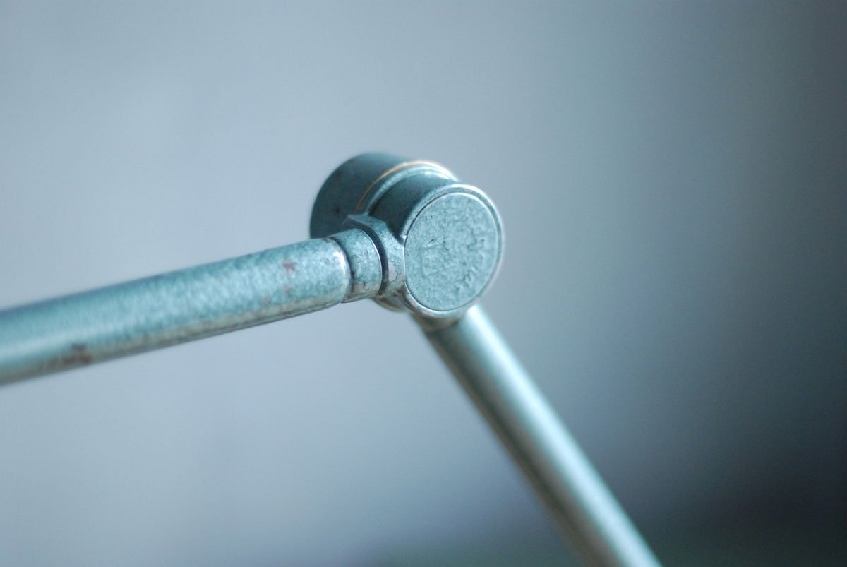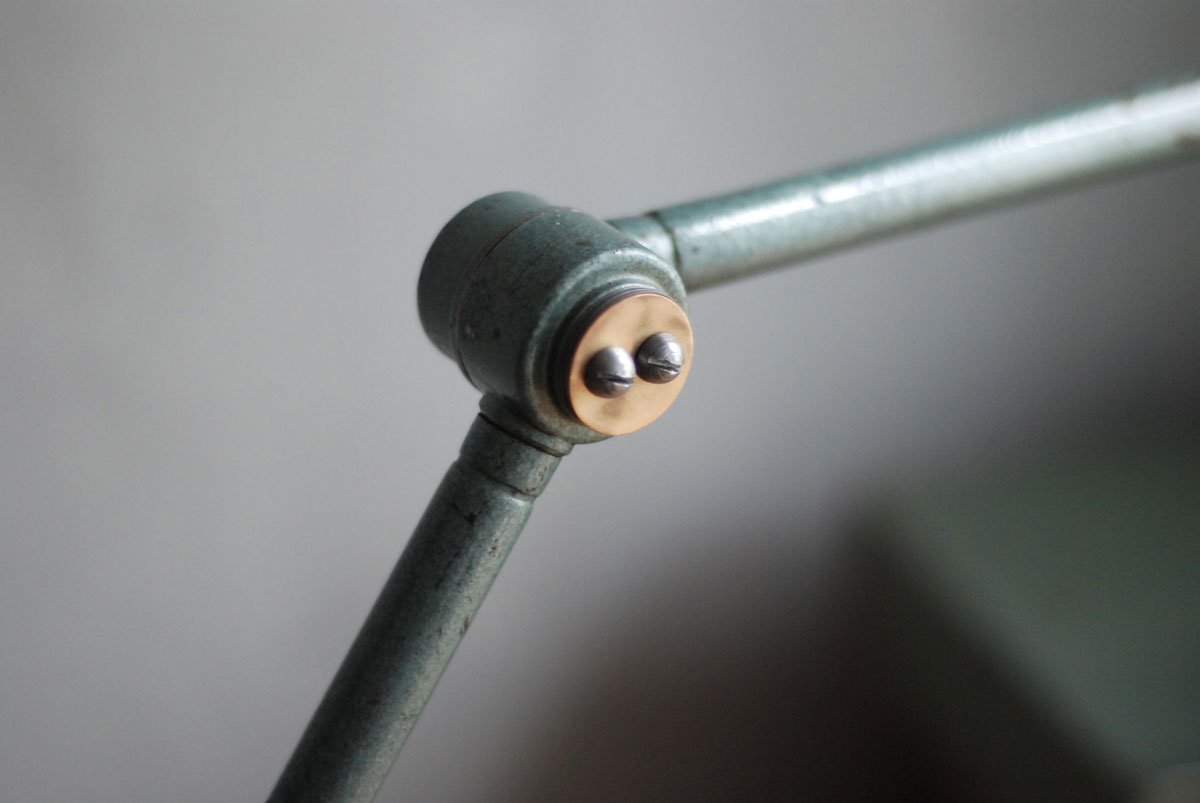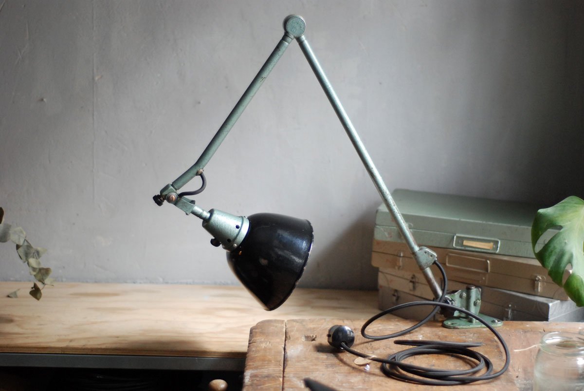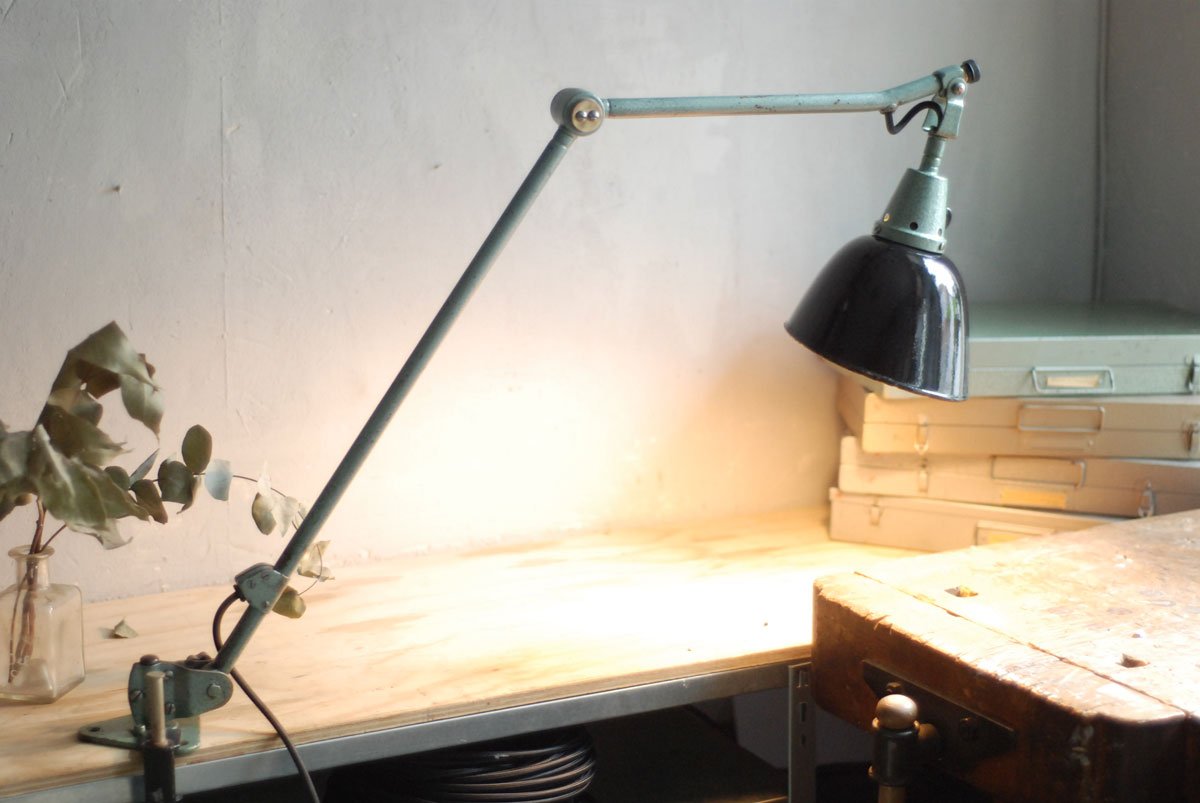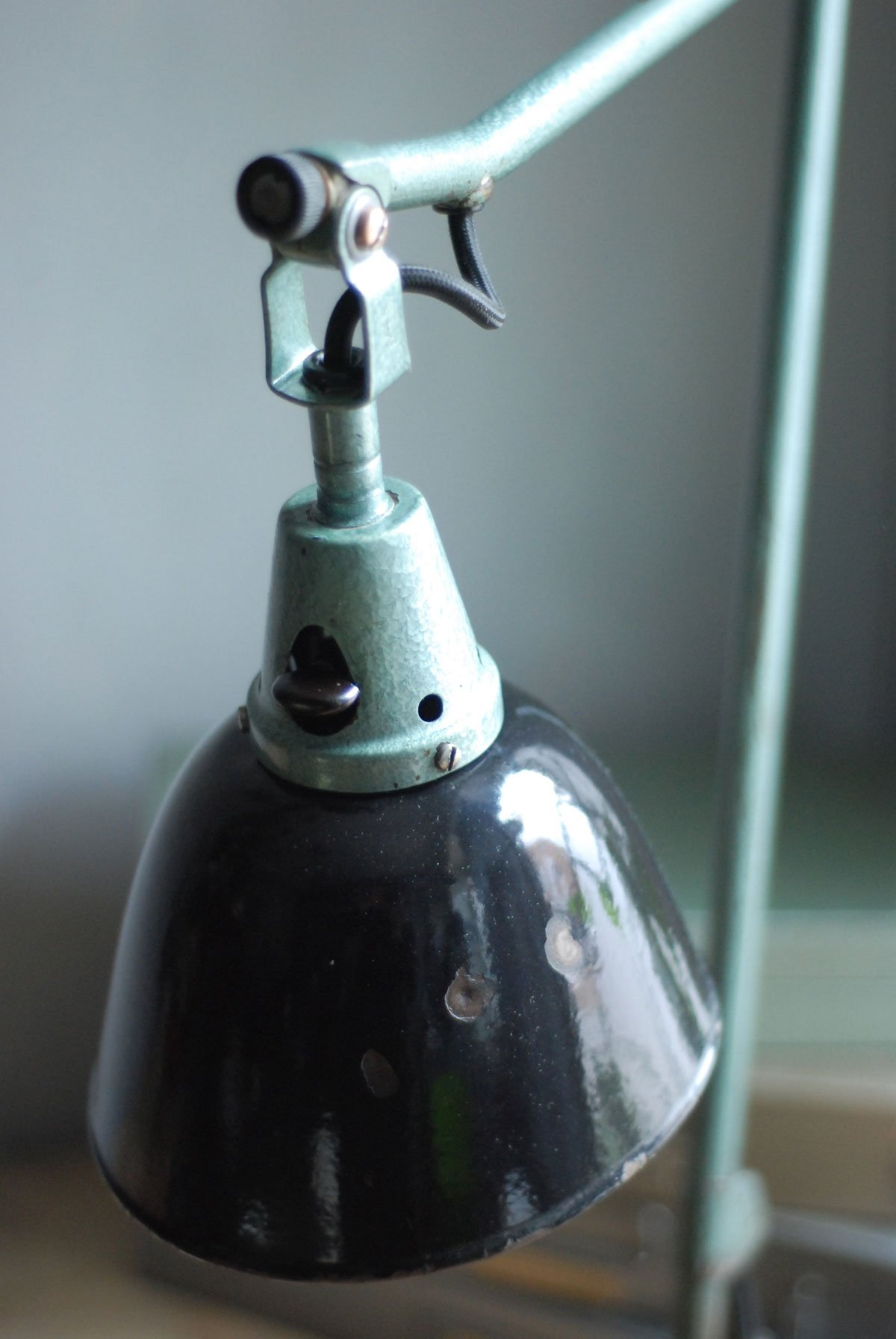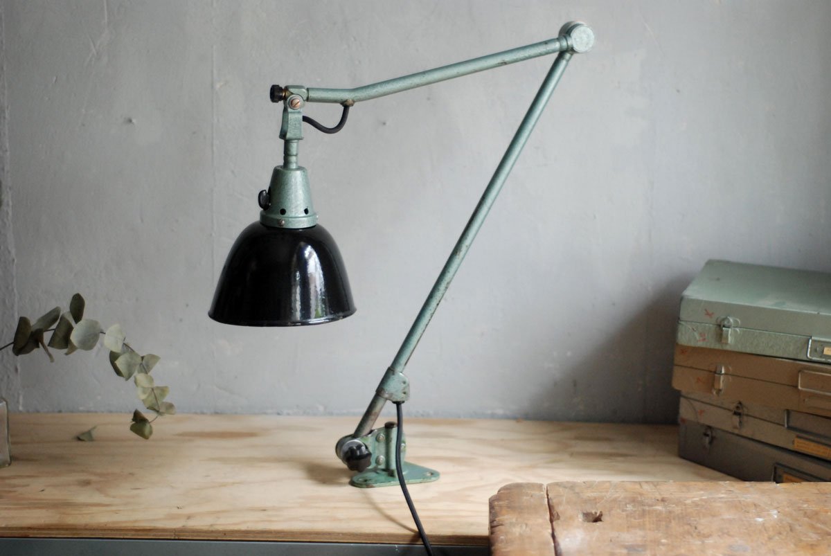 Doppeltischarm Midgard mit Originallackierung und emaillertem Reflektor. Der Entwurf dieser Gelenklampe stammt von Curt Fischer, der ab ca. 1920 an der Idee des „lenkbaren Lichtes“ gearbeitet hat. Noch vor den so bekannten Entwürfen von Christian Dell oder Marianne Brandt setzte Curt Fischer mit der allseitig beweglichen Arbeitsplatzleuchte die Idee des so genannten ‚lenkbaren Lichtes‘ um.…