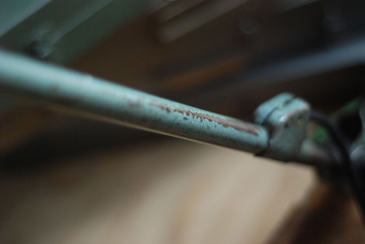 Der  emaillierte Reflektor hat ein paar Abplatzer am Rand und drei Abplatzer. Die Arme und die Tischhalterung weisen Alterspuren und Lackablaptzer auf.