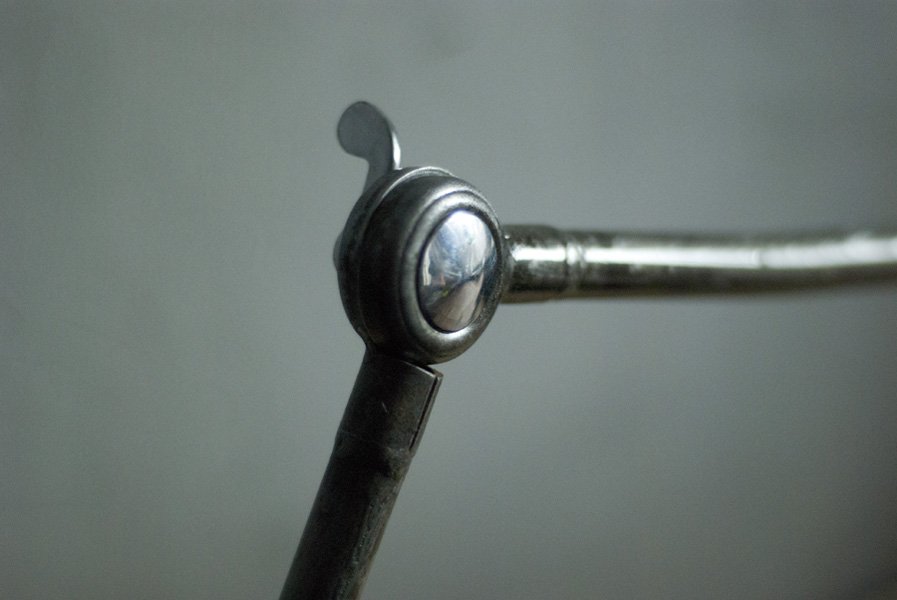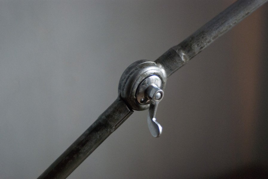 Die Elektrik wurde dreiadrig erneuert und generalüberholt. Es wurde ein schwarzes, stoffummanteltes Kabel verwendet.Die Leuchte wird mittels des original Drehschalters aus Bakelit betätigt. Die Technik der Leuchte funktioniert einwandfrei. Die Lampe lässt sich dank ihren zwei Kugelgelenken stufenlos bewegen.