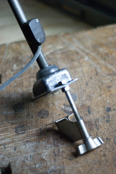 Die Halterung ist ursprunglich zur Verschraubung an der Tischplatte oder an der Wand gedacht. Mit dem non originalen Klemmsystem kann die Lampe problemlos an der Tischplatte befestigt werden.