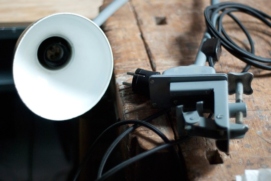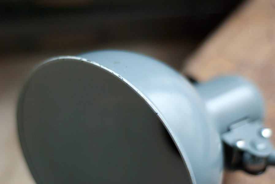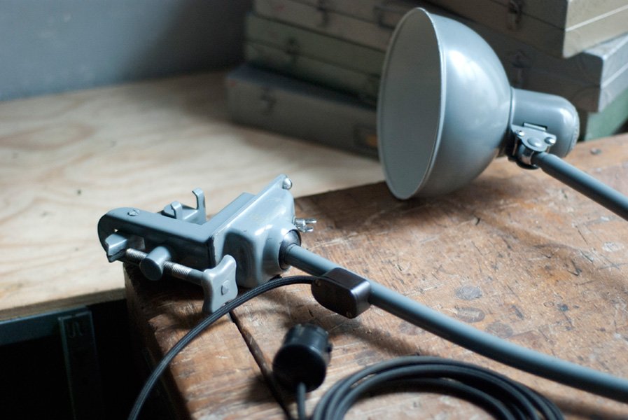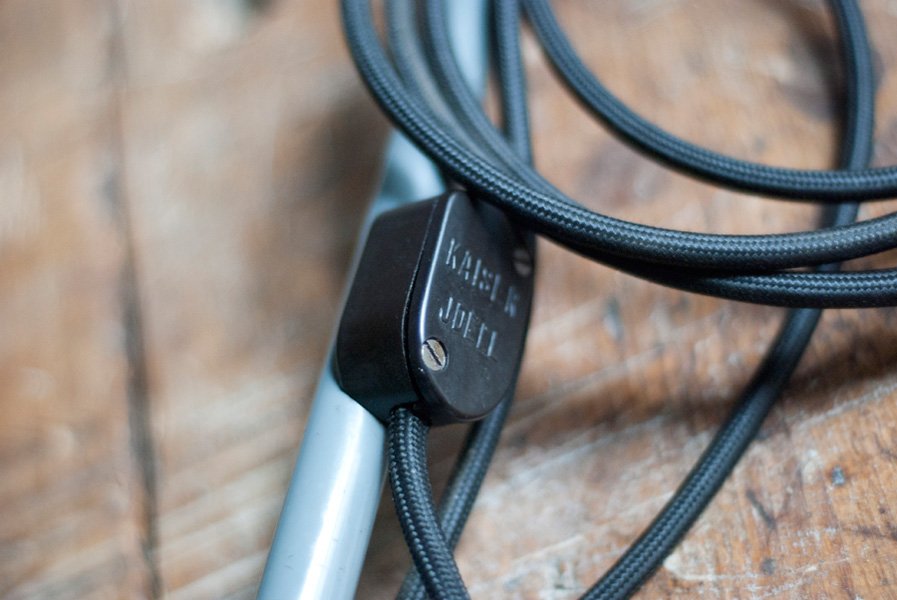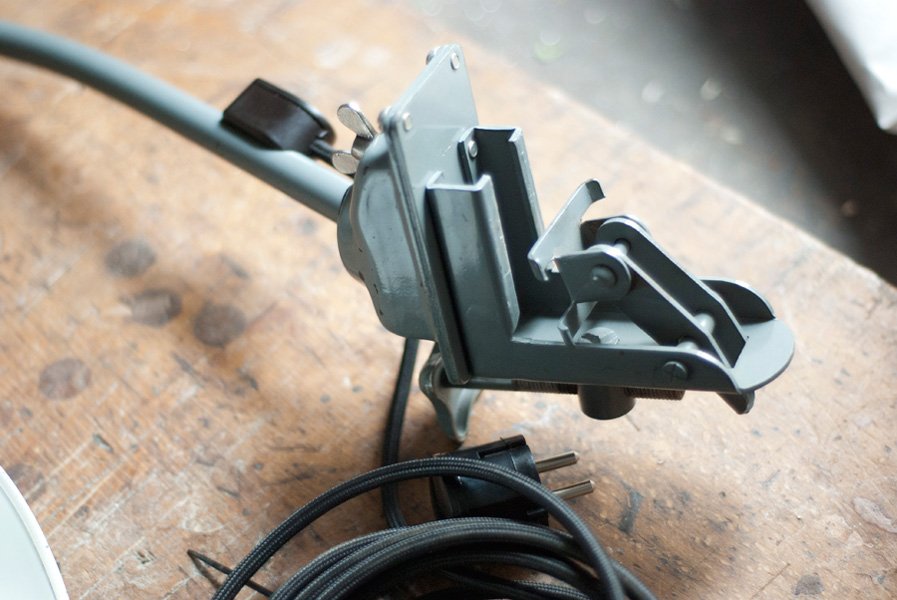 Die Elektrik wurde dreiadrig erneuert und generalüberholt. Es wurde ein schwarzes, stoffummanteltes Kabel verwendet.Die Leuchte wird mittels des original Drehschalters aus Bakelit betätigt. Die Technik der Leuchte funktioniert einwandfrei. Die Lampe lässt sich dank ihren zwei Kugelgelenken stufenlos bewegen.
