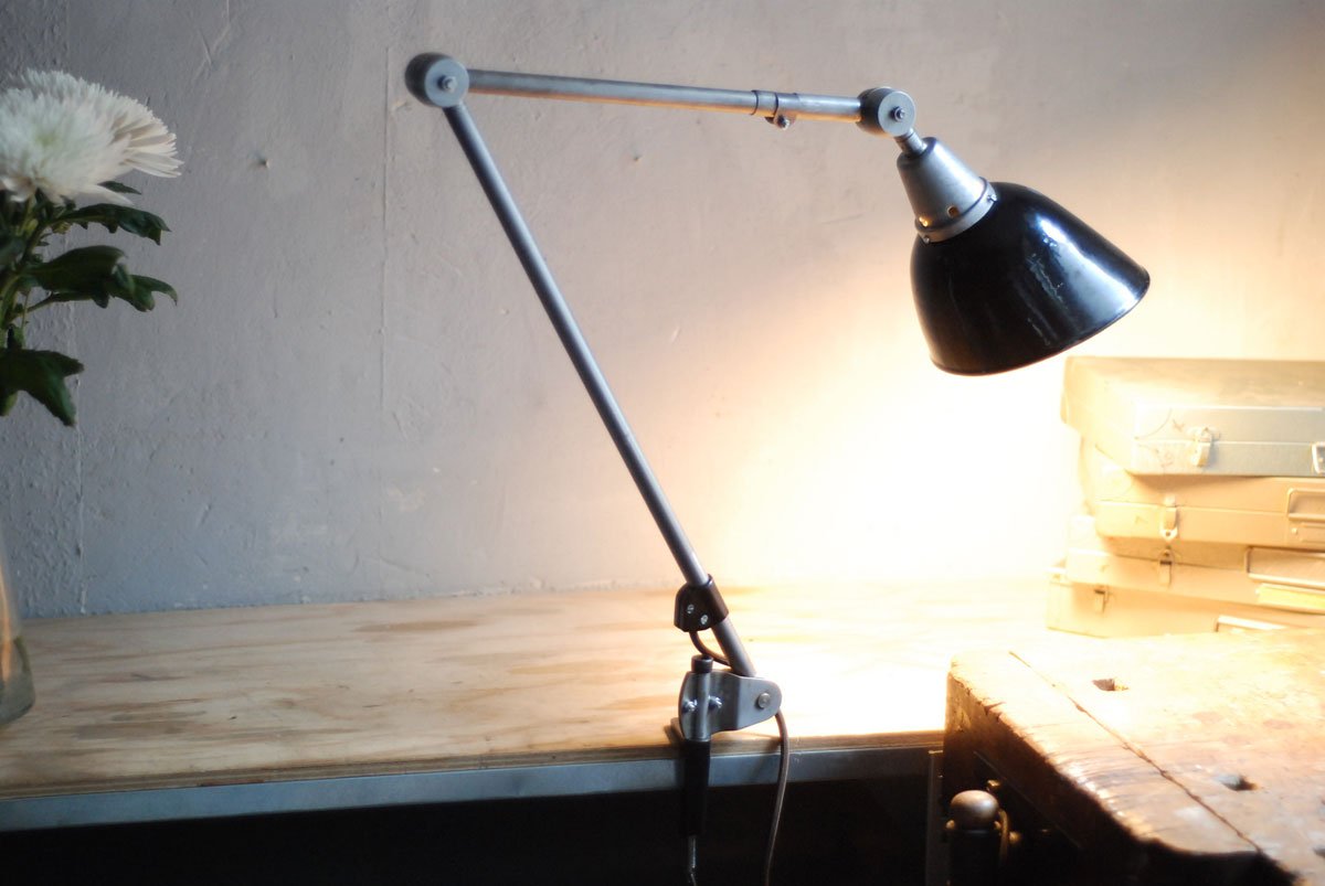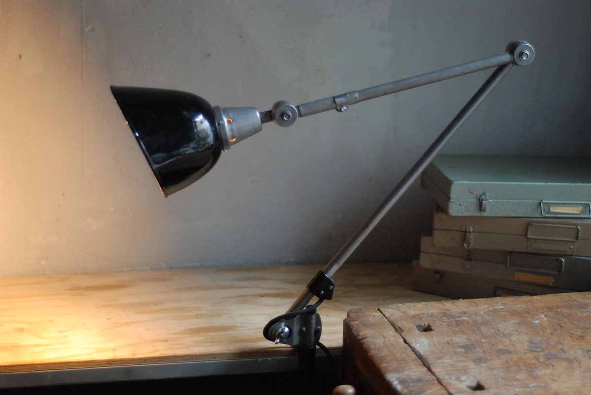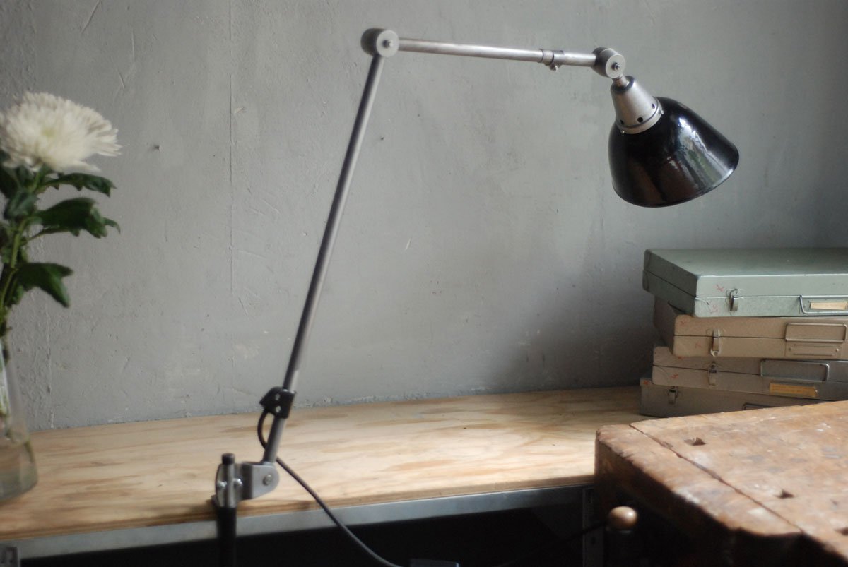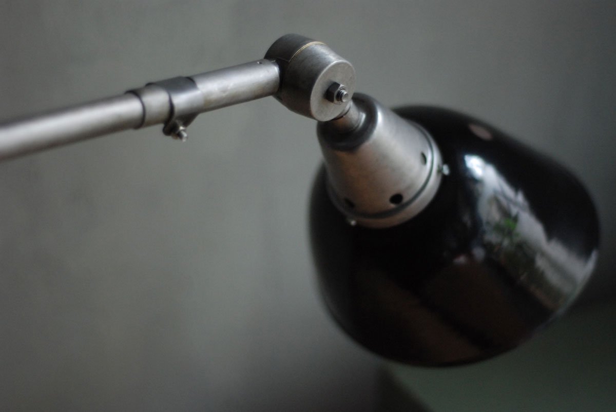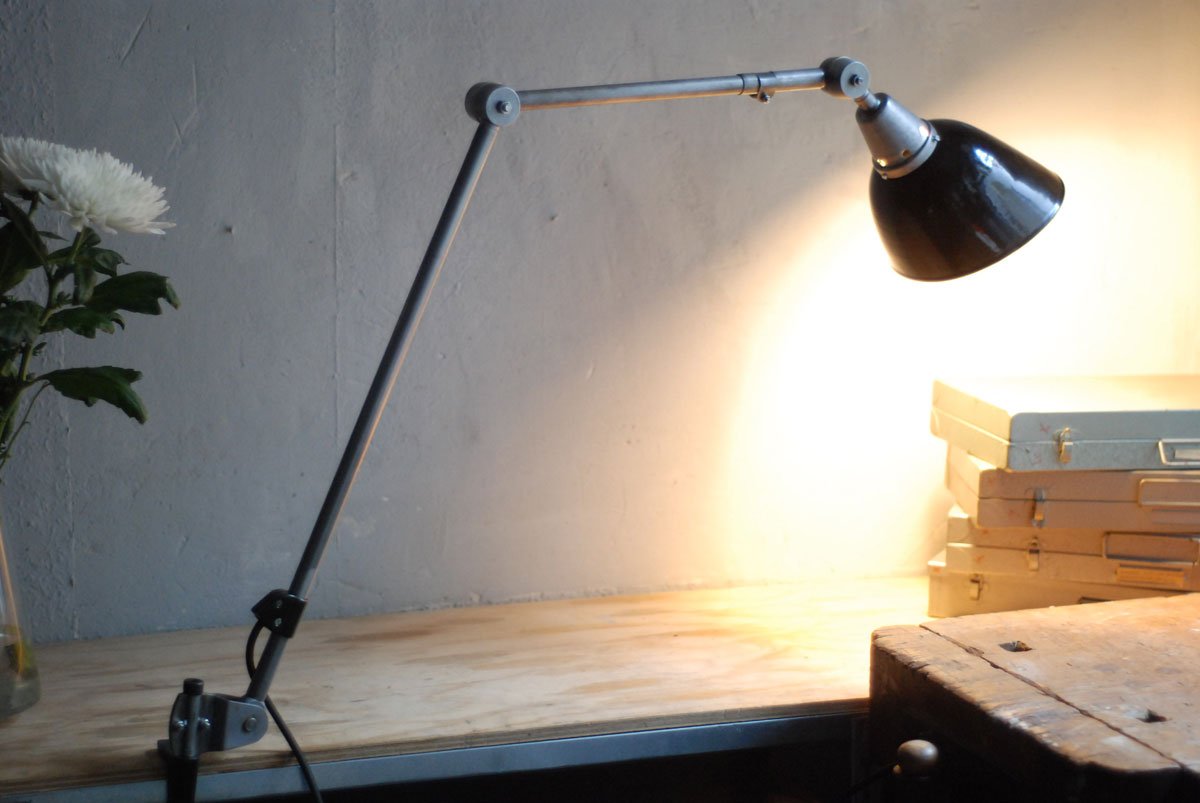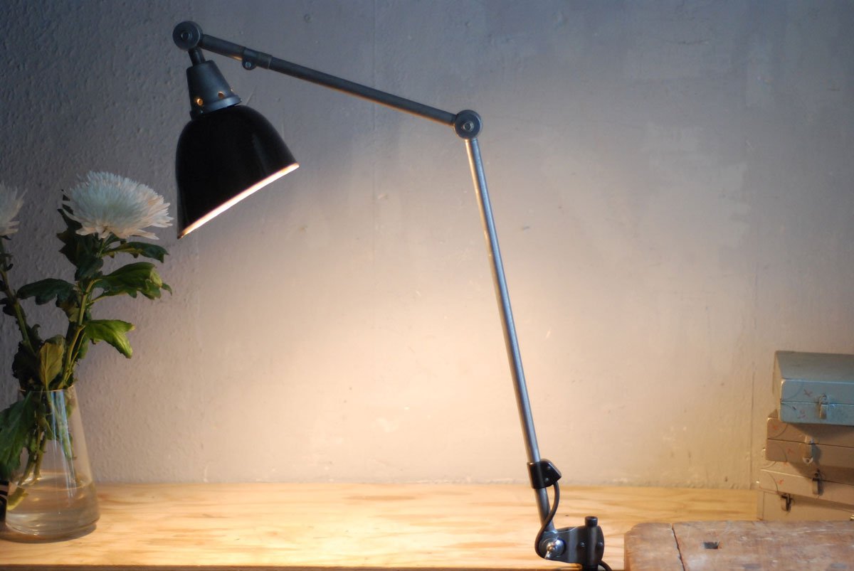 Gelenklampe Midgard in Stahloptik mit Klemmfuss und emailliertem Reflektor eines anderen Herstellers.