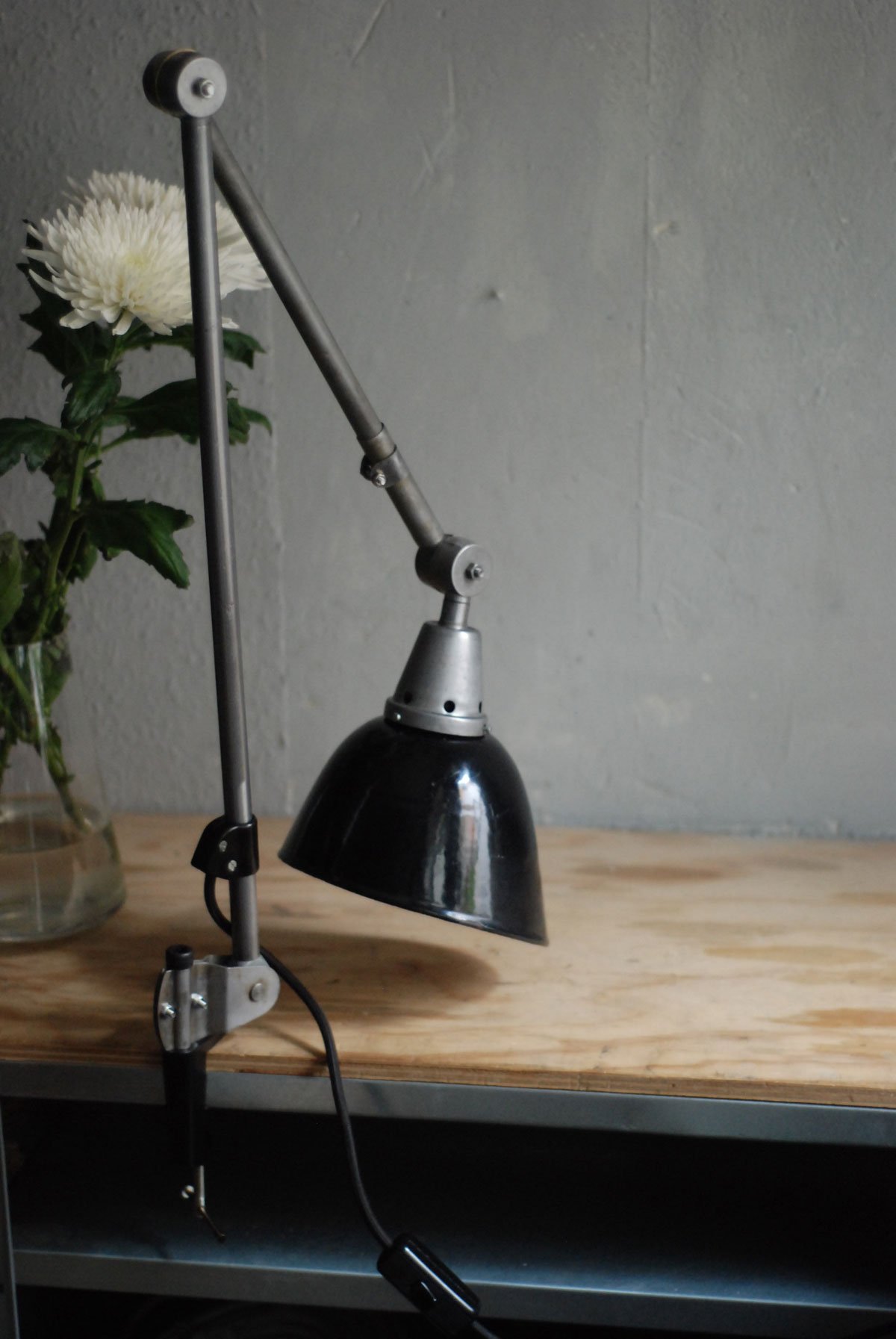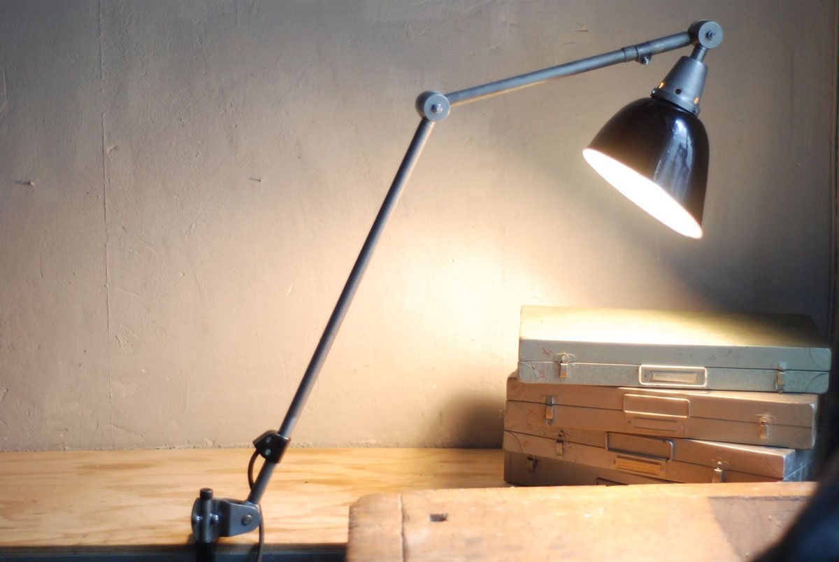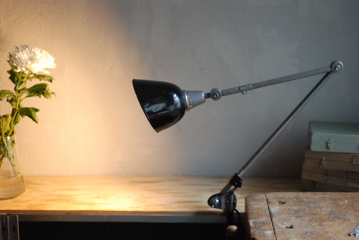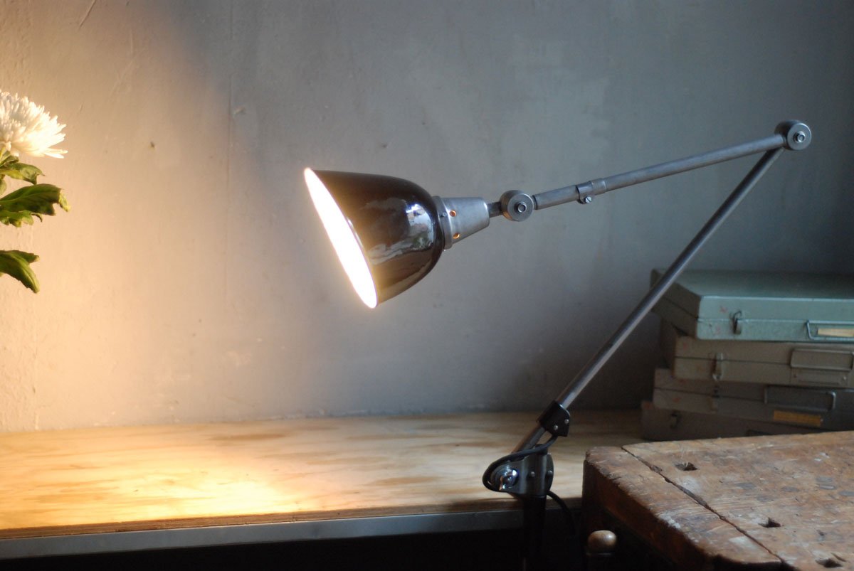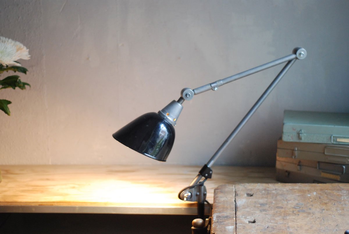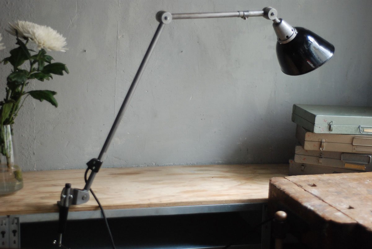 Gelenklampe Midgard in Stahloptik mit Klemmfuss und emailliertem Reflektor eines anderen Herstellers.