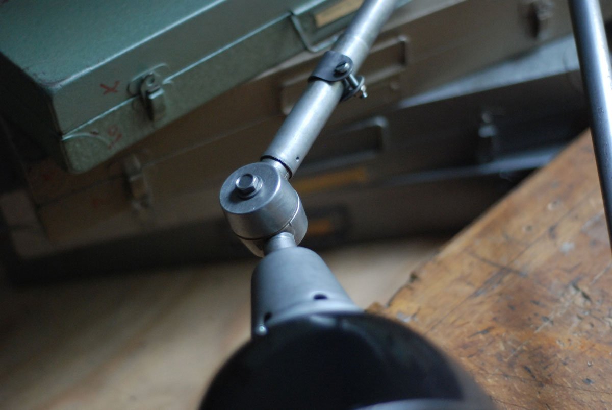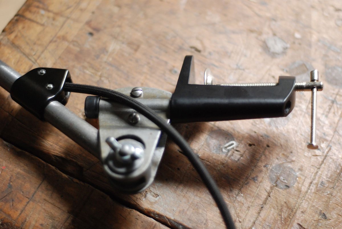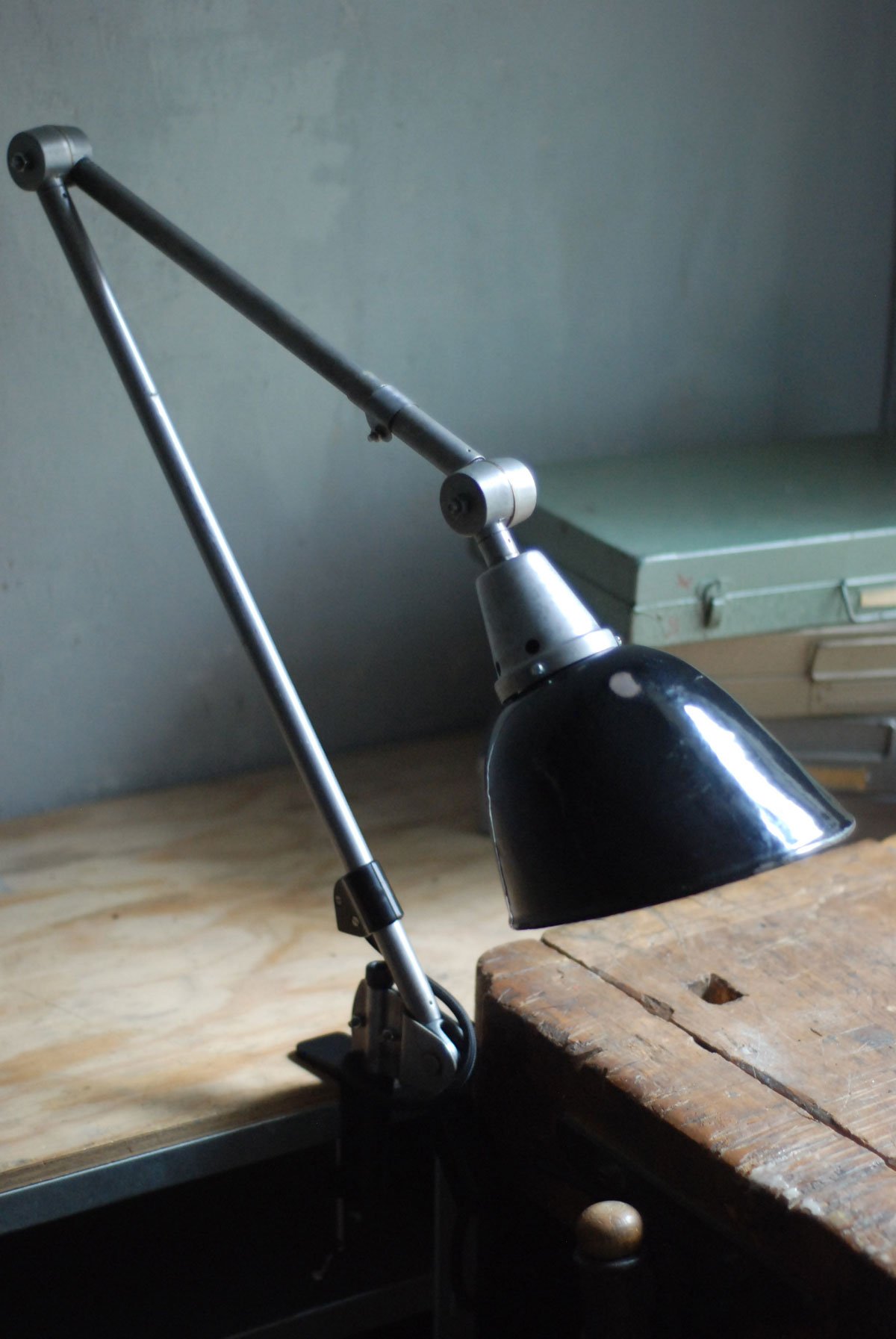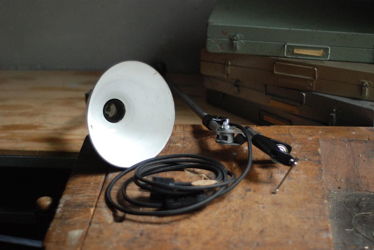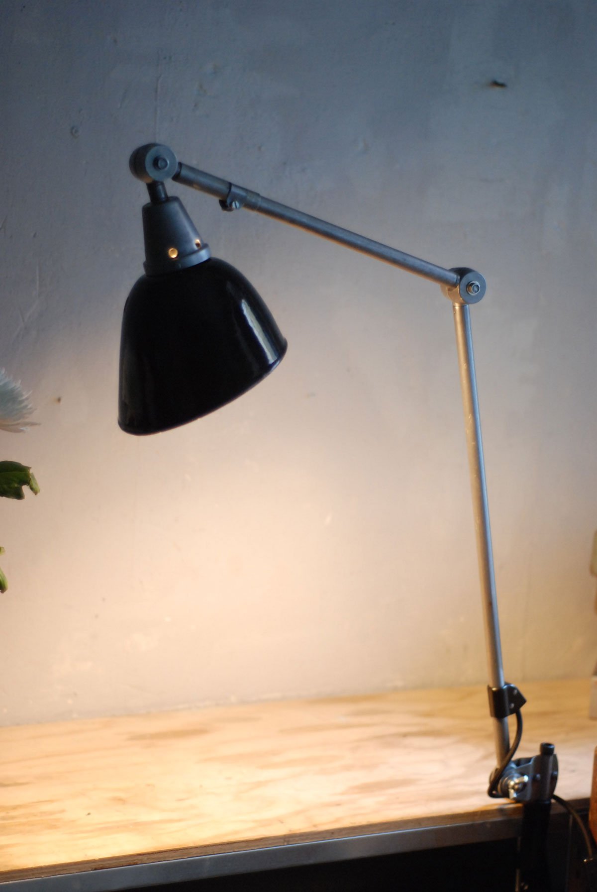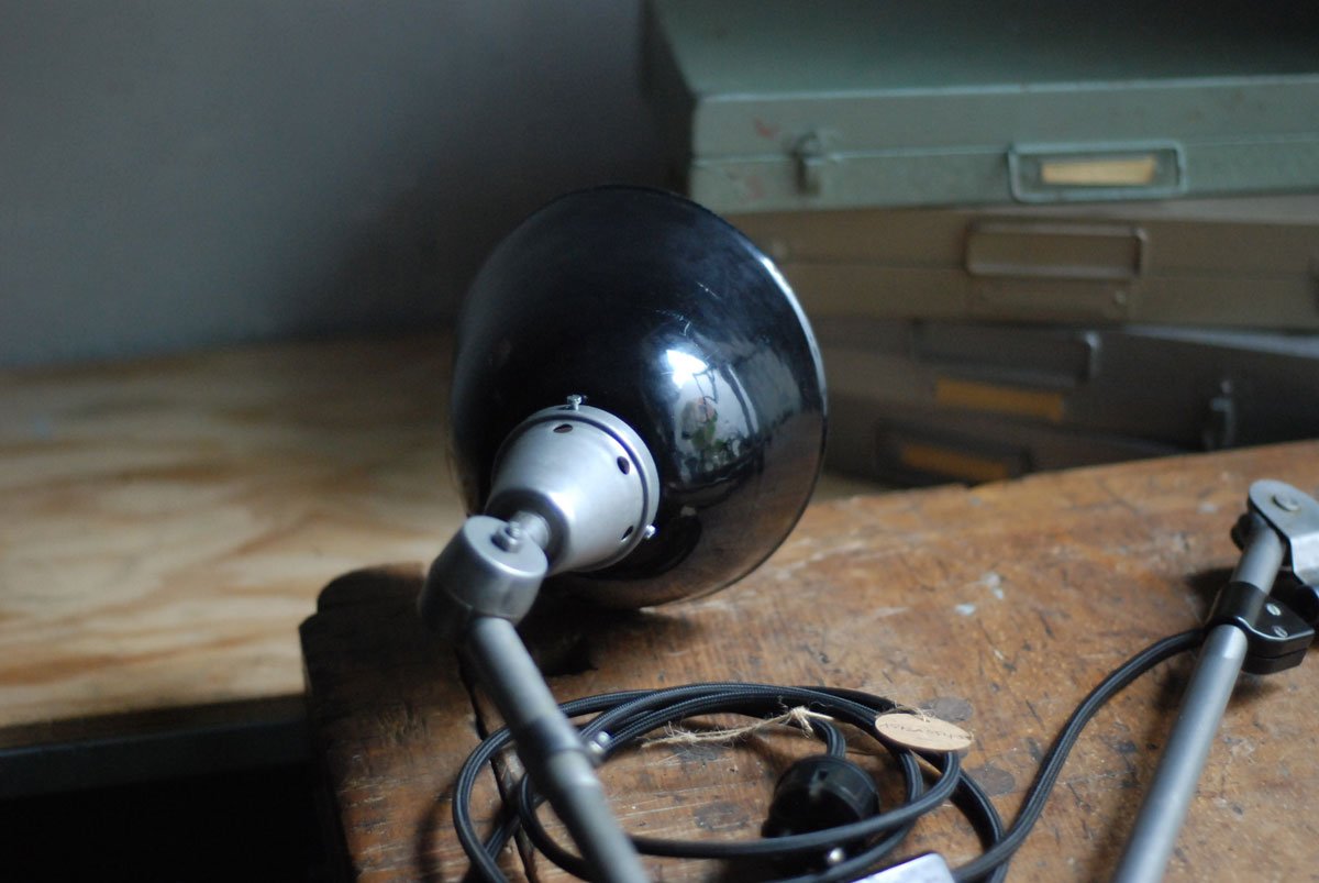 Gelenklampe Midgard in Stahloptik mit Klemmfuss und emailliertem Reflektor eines anderen Herstellers.