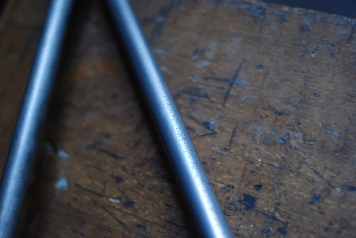 Nach der kompletten Zerlegung und sorgsamen Reinigung wurden die Elemente der Leuchte entlackt, entrostet, mit Öl versiegelt und neu aufgebaut. Alle Einzelteile wurden entrostet, gereinigt, poliert, geölt.