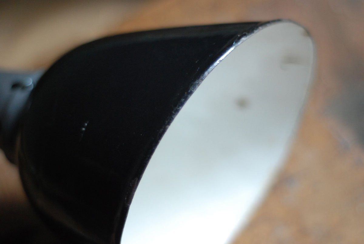 Die Leuchte befindet sich in einem guten gebrauchten Zustand. Der schöne emaillierte Schirm weist Alterspuren auf.