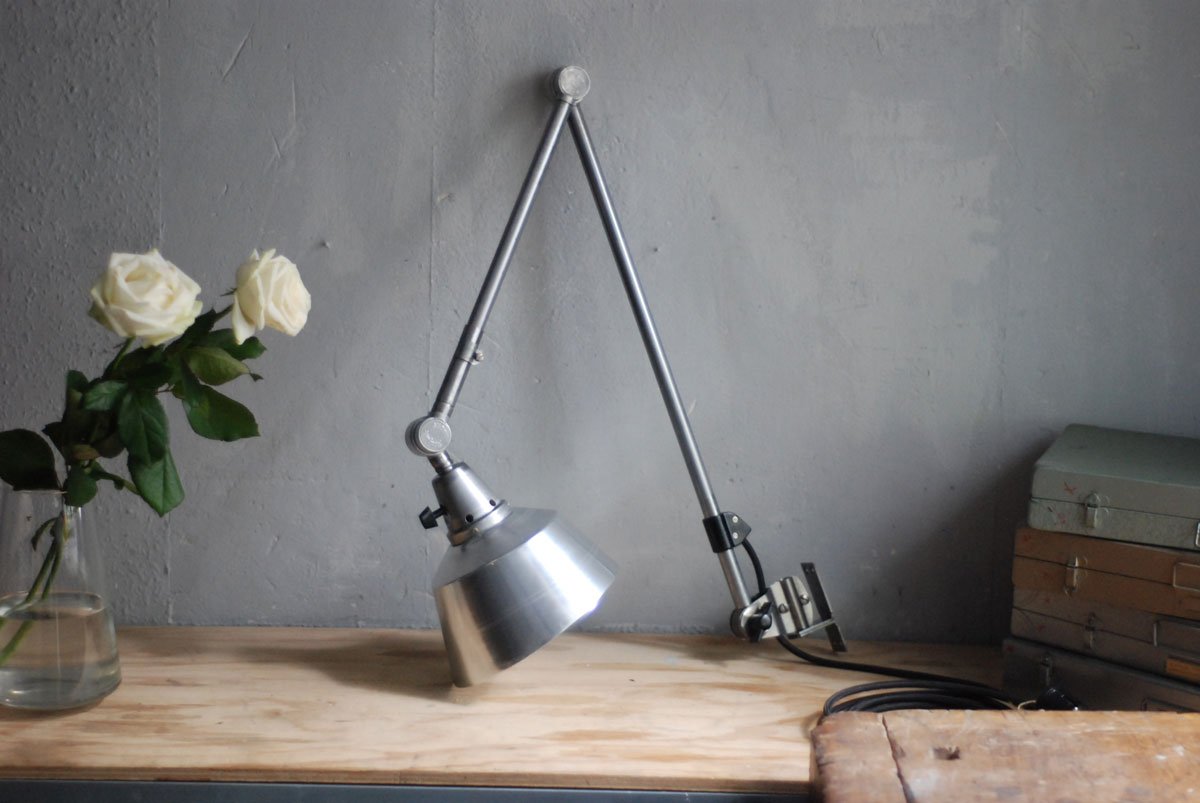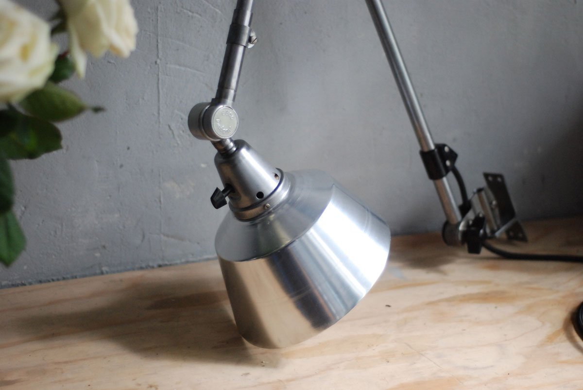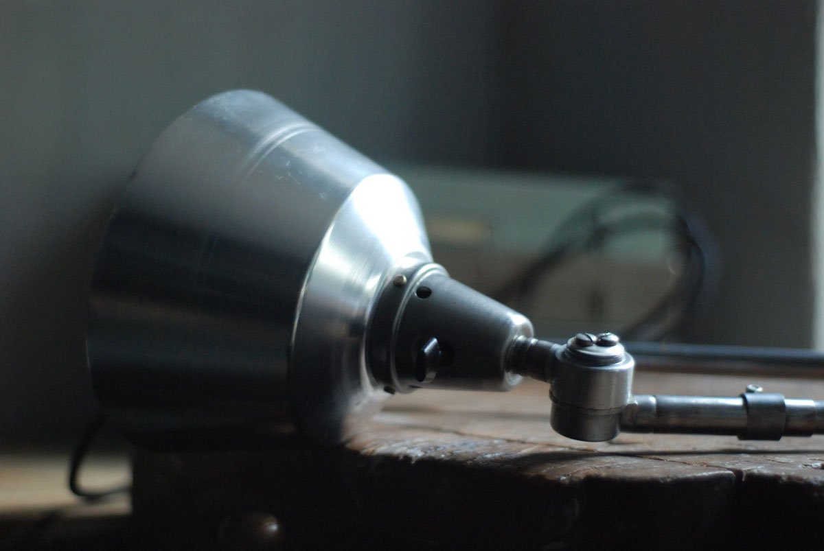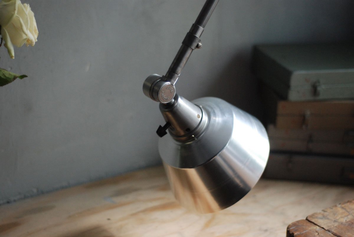 Gelenklampe Midgard in Stahloptik mit Wandhalterung. Der Entwurf dieser einzigartigen Gelenklampe stammt von Curt Fischer, der ab ca. 1920 an der Idee des „lenkbaren Lichtes“ gearbeitet hat. Noch vor den so bekannten Entwürfen von Christian Dell oder Marianne Brandt setzte Curt Fischer mit der allseitig beweglichen Arbeitsplatzleuchte die Idee des so genannten ‚lenkbaren Lichtes‘ um. Die…