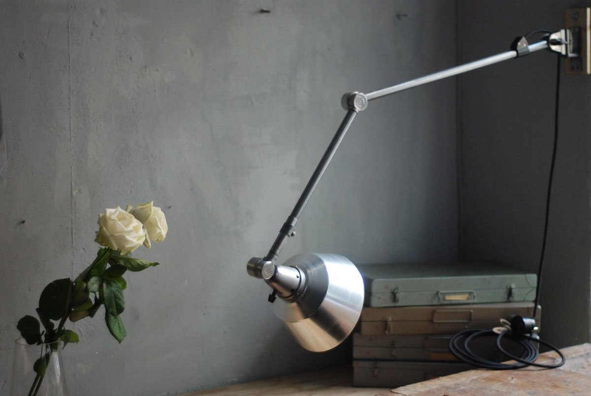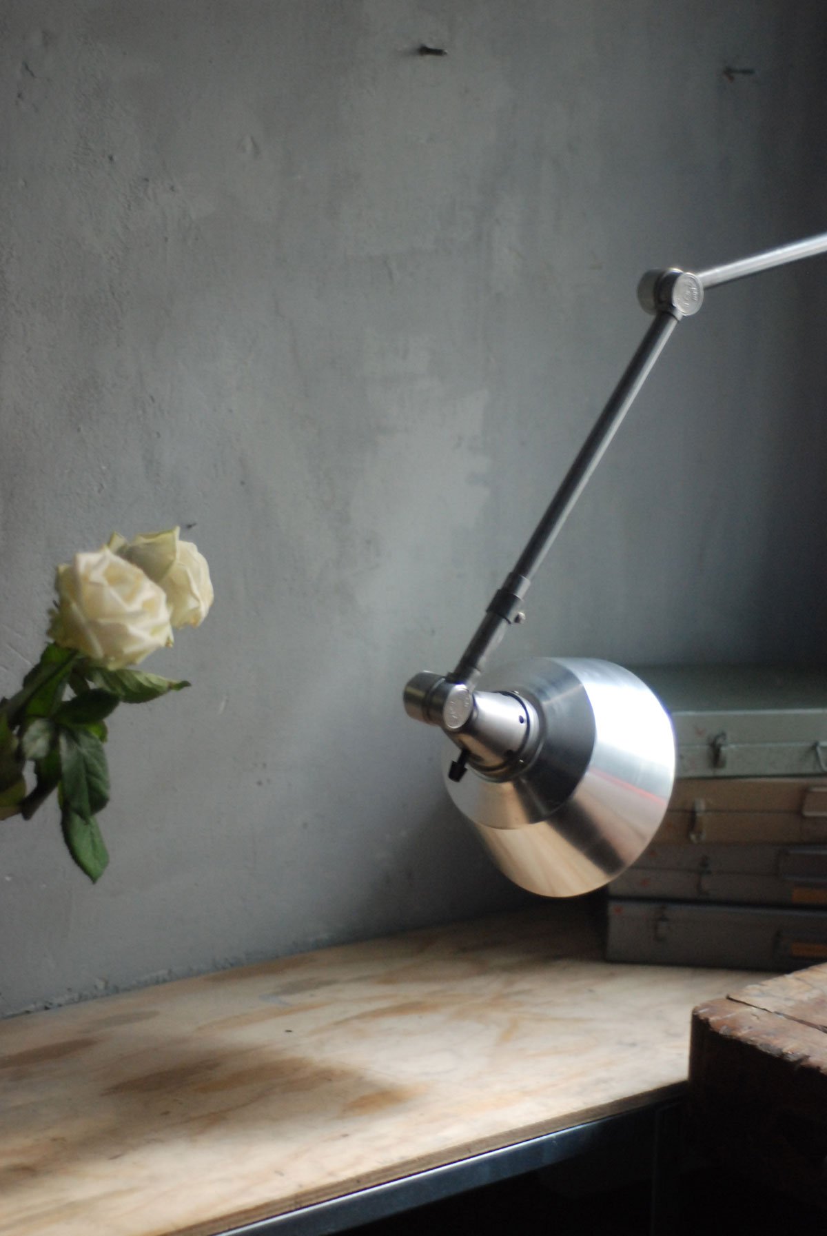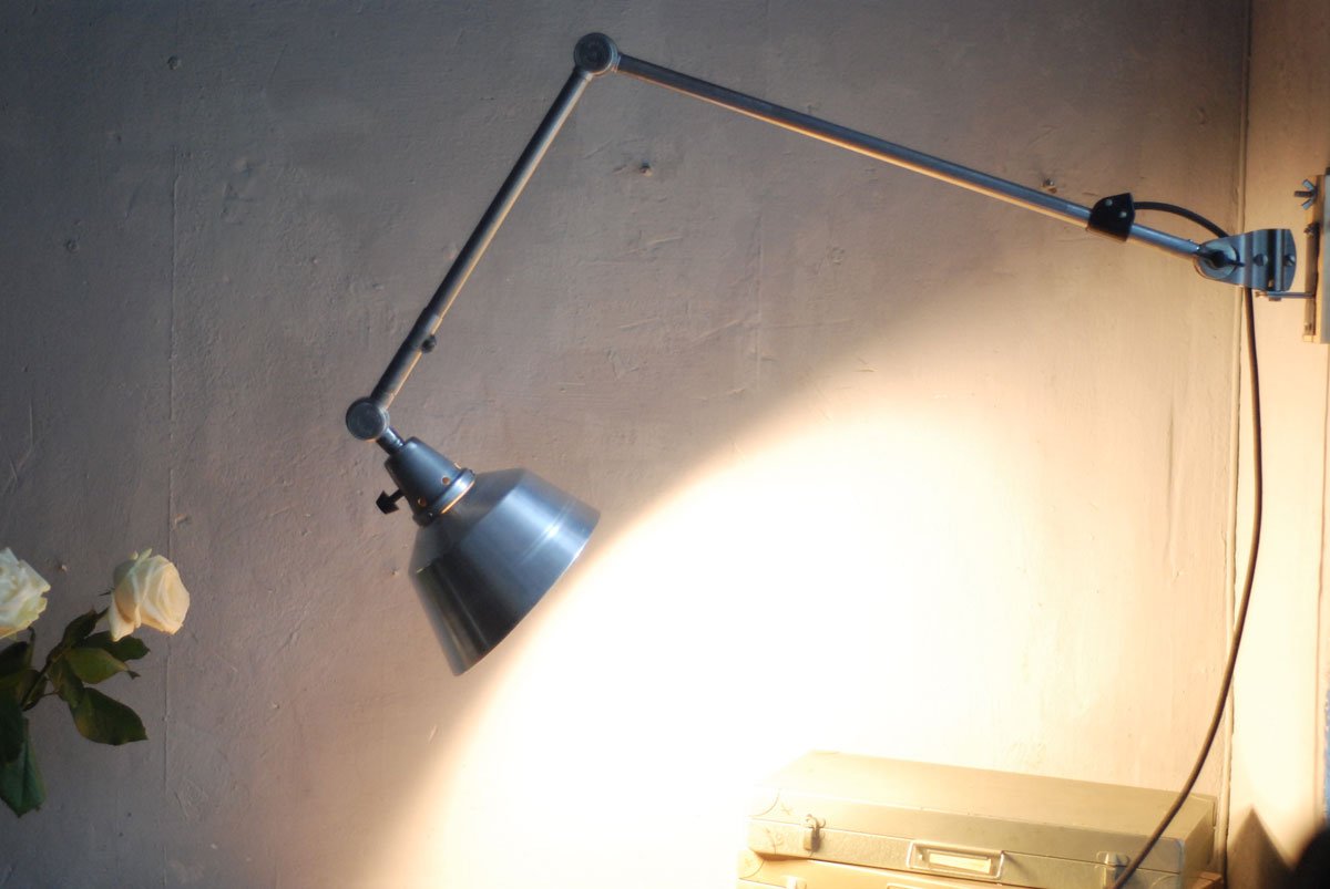 Gelenklampe Midgard in Stahloptik mit Wandhalterung. Der Entwurf dieser einzigartigen Gelenklampe stammt von Curt Fischer, der ab ca. 1920 an der Idee des „lenkbaren Lichtes“ gearbeitet hat. Noch vor den so bekannten Entwürfen von Christian Dell oder Marianne Brandt setzte Curt Fischer mit der allseitig beweglichen Arbeitsplatzleuchte die Idee des so genannten ‚lenkbaren Lichtes‘ um. Die…
