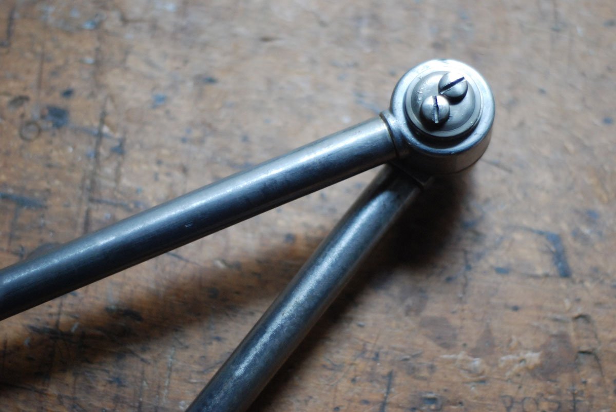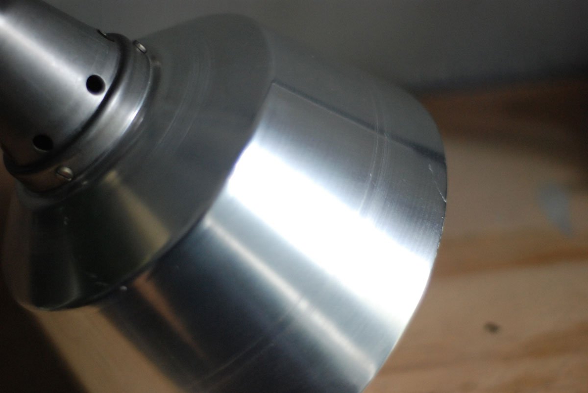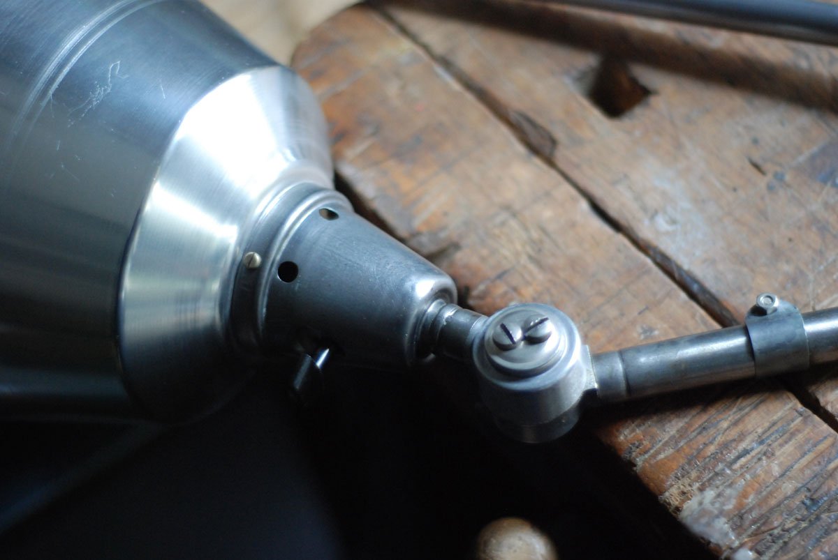 Nach der kompletten Zerlegung und sorgsamen Reinigung wurden die Elemente der Leuchte partiell entlackt, entrostet, mit Öl versiegelt und neu aufgebaut. Alle Einzelteile wurden entrostet, gereinigt, poliert, geölt.