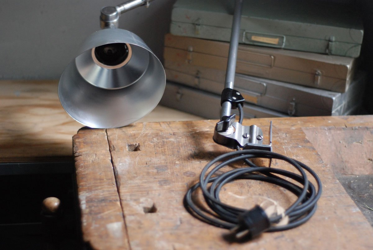 Die Elektrik wurde dreiadrig erneuert und generalüberholt. Es wurde ein schwarzes, stoffummanteltes Kabel verwendet. Die Leuchte wird mittels eines Drehschalters an der originalen Bakelitfassung betätigt.