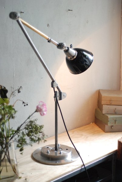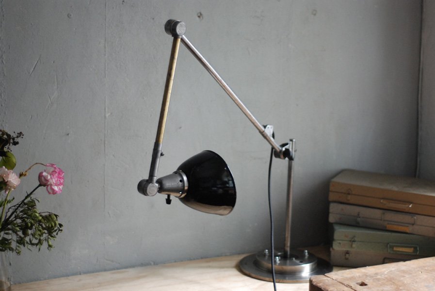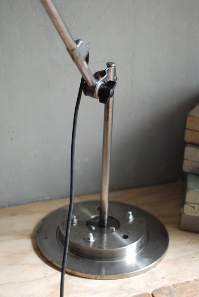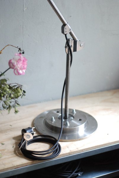 Gelenkleuchte Midgard in Stahloptik mit emailliertem Reflektor auf Sockel