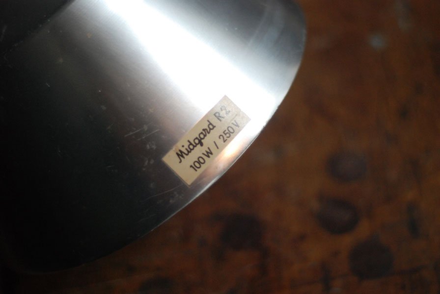 Die Lampe befindet sich in einem gebrauchten guten Zustand, weist leichte Alterspuren und eine schönen Patina auf. Der Reflektor aus Aluminium ist in einem guten Zustand und weist leichte Alterspuren sowie Kratzer und Beulen auf. Er ist mit „Midgard R2“ markiert.