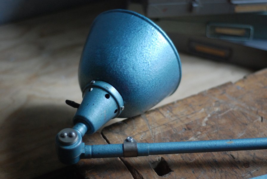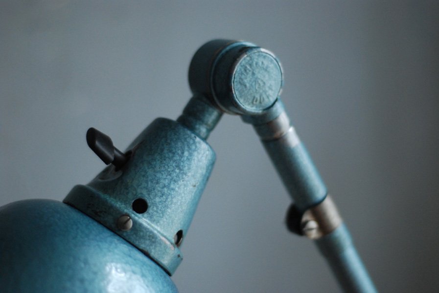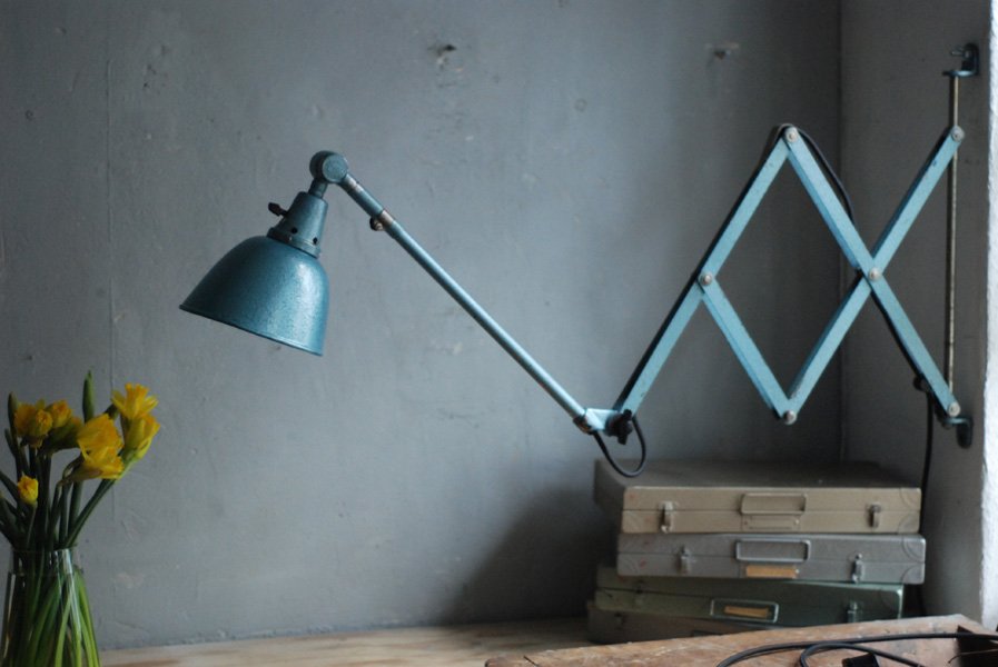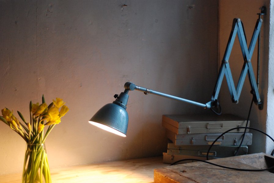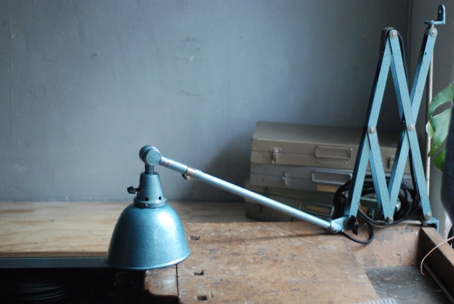 Grosse Scherenlampe Midgard DDRP Type 1000-I mit Hammerschlag Türkisblauer Lackierung.