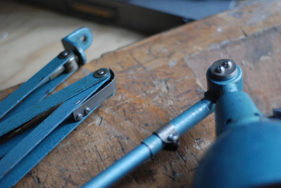 Nach der kompletten Zerlegung wurden die Elemente der Leuchte sorgfältig und vollständing gereinigt, entrostet und befreit von fremden Lackresten, und neu aufgebaut. Alle Einzelteile wurden entrostet, gereinigt, poliert, geölt.