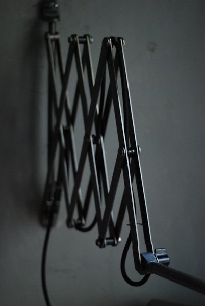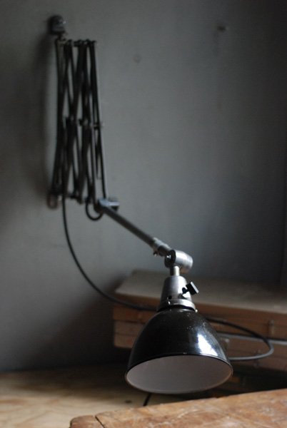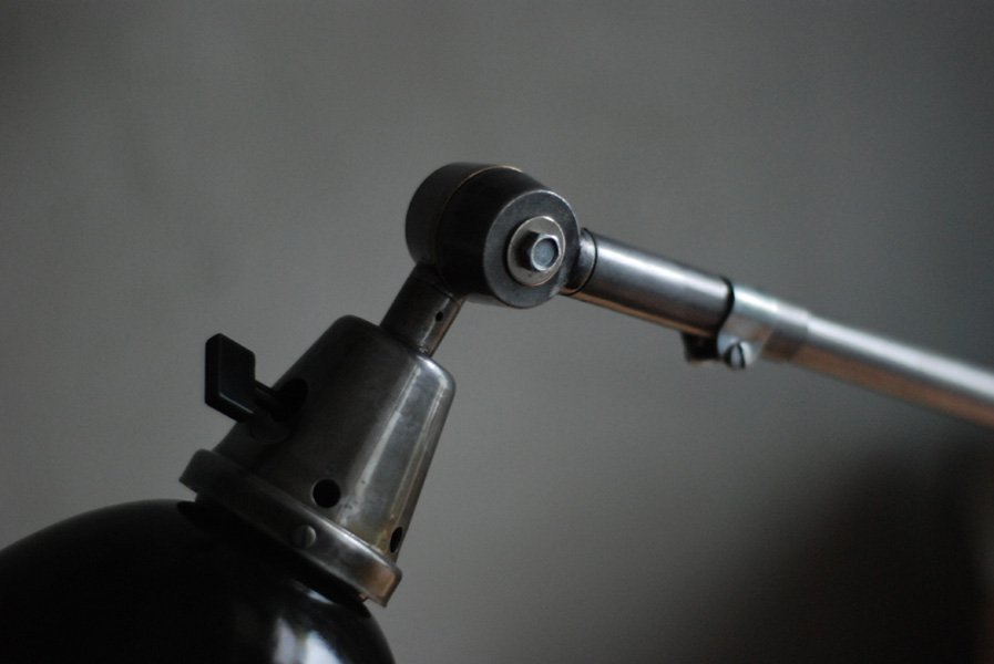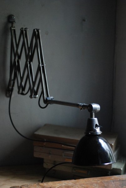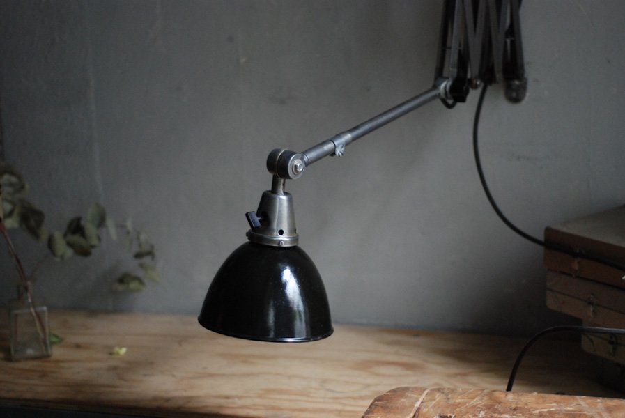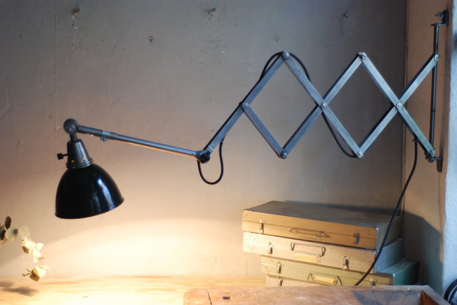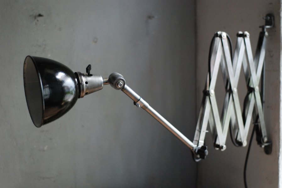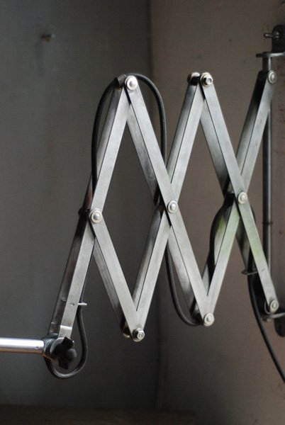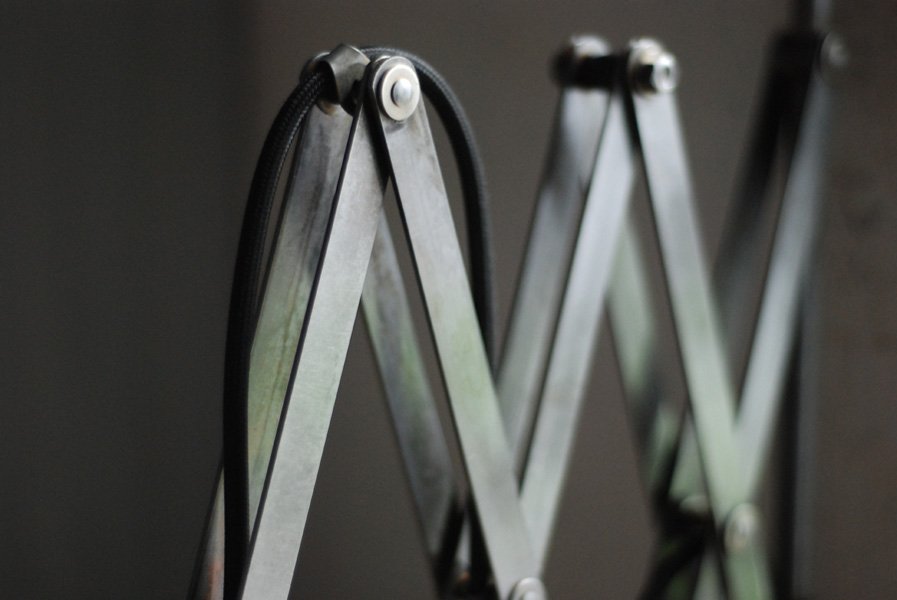 Grosse Scherenlampe Midgard in Stahloptik mit Reflektor aus Emaille eines anderen Herstellers.