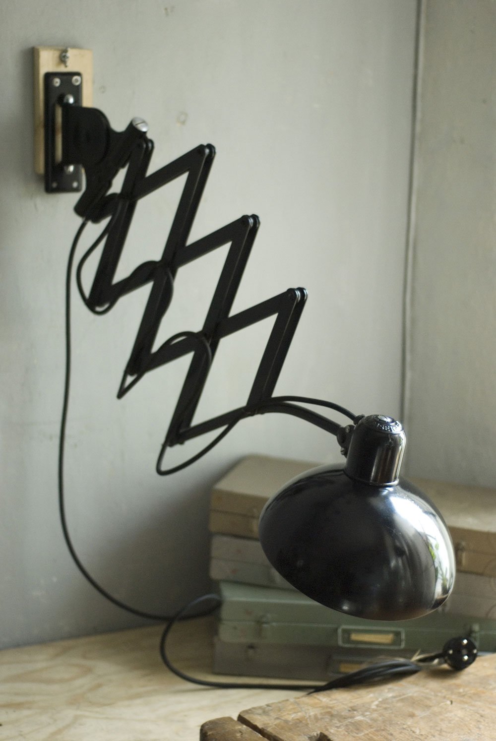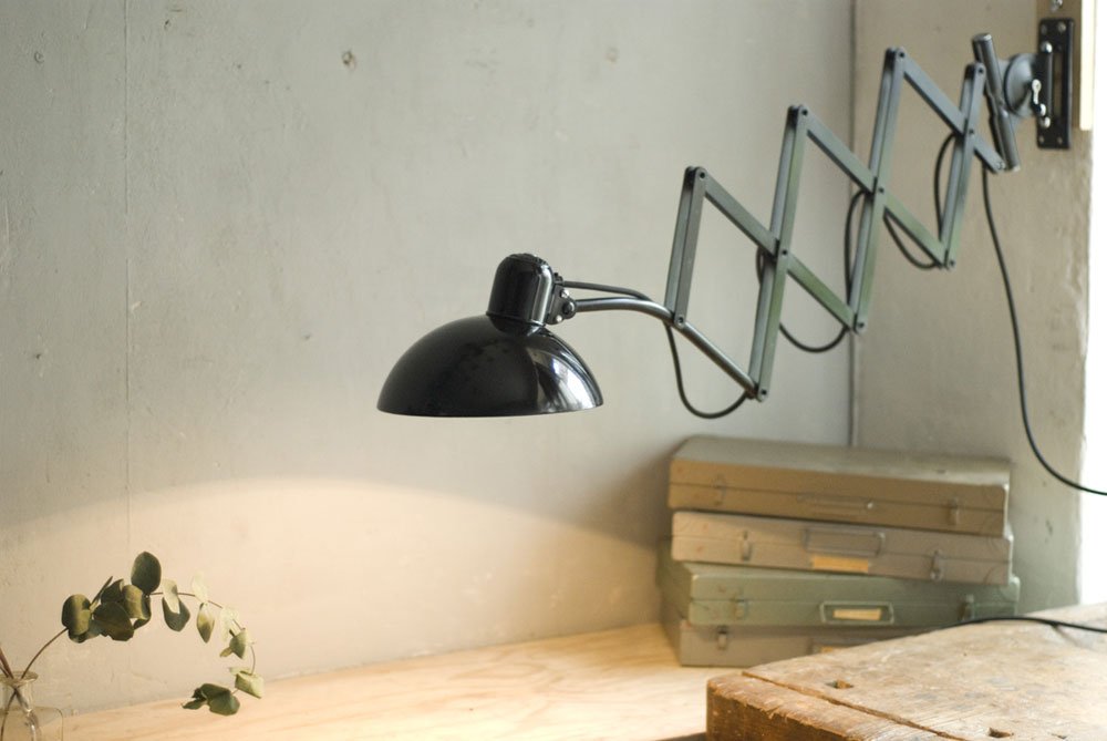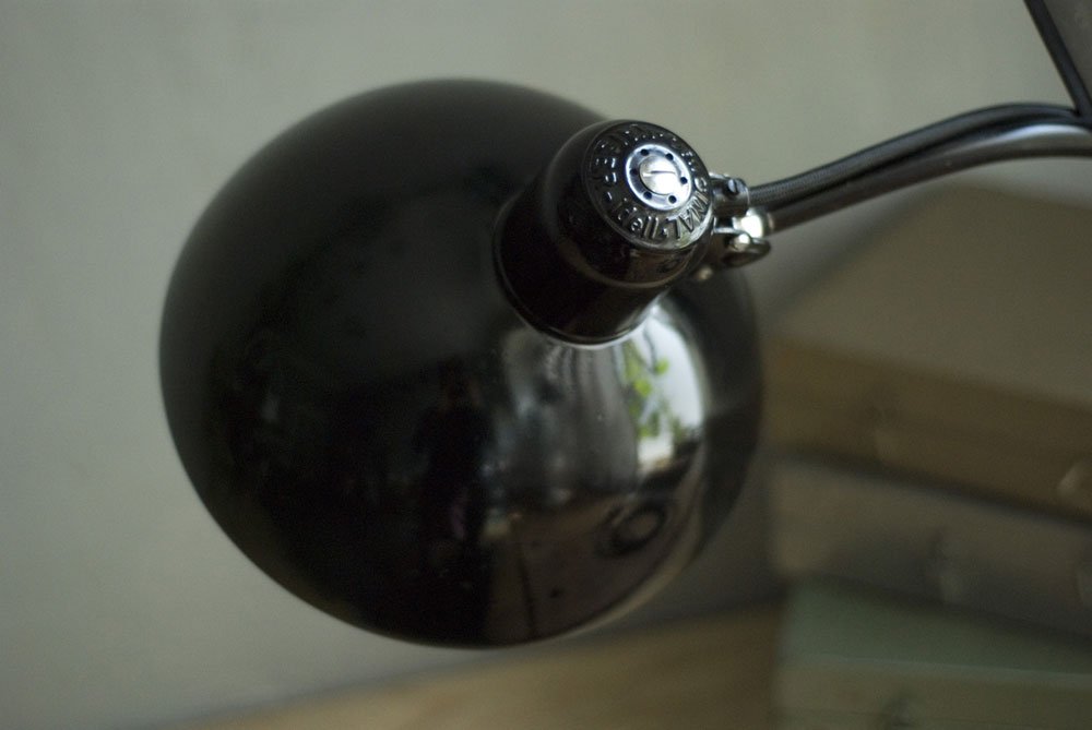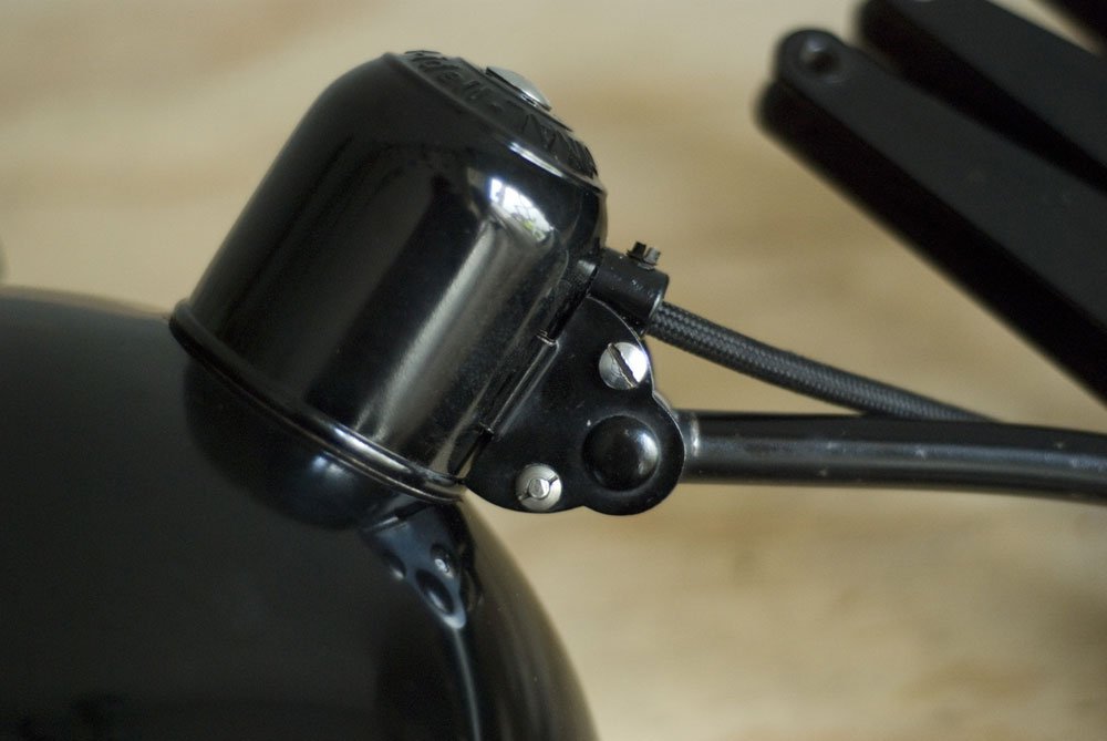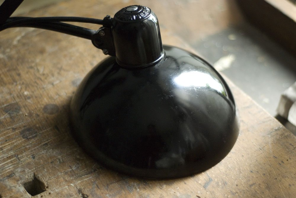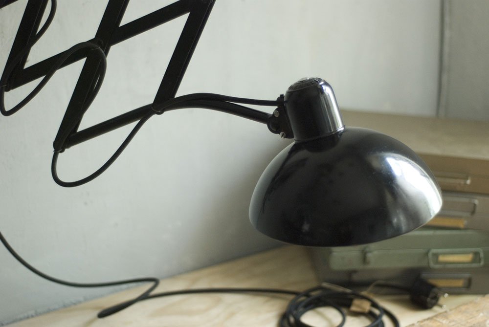 Grosse schwarze Scherenlampe Kaiser Idell 6614 mit leichen Zeitspuren.