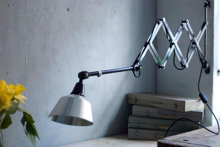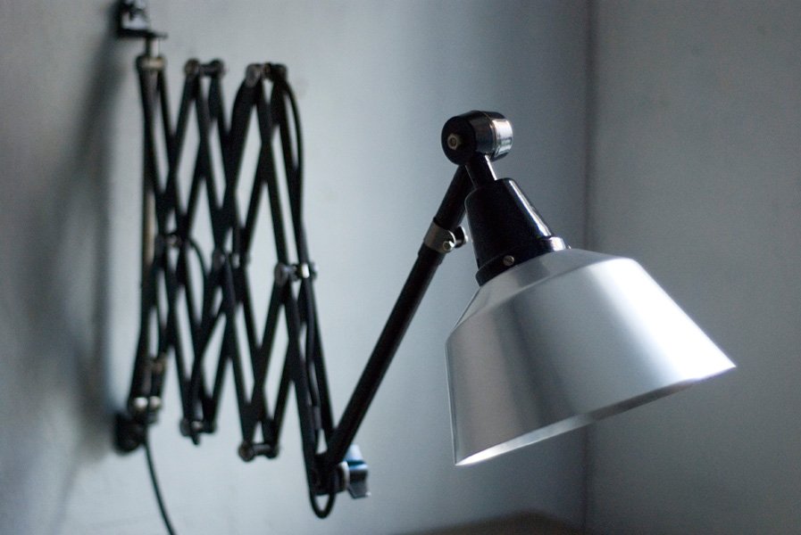 Der Entwurf dieser schönen Scherenleuchte stammt von Curt Fischer, der ab ca. 1920 an der Idee des „lenkbaren Lichtes“ gearbeitet hat. Noch vor den so bekannten Entwürfen von Christian Dell oder Marianne Brandt setzte Curt Fischer mit der allseitig beweglichen Arbeitsplatzleuchte die Idee des so genannten ‚lenkbaren Lichtes‘ um. Die Metallwerkstatt im Bauhaus in Weimar wurde mit Midgard-Leuchten erhellt und diente den Bauhaus-Studenten als Vorbild und ist später auch in die Wohnzimmereinrichtung von Ilse und Walter Gropius in deren Meisterhaus am Dessauer Bauhaus belegbar.