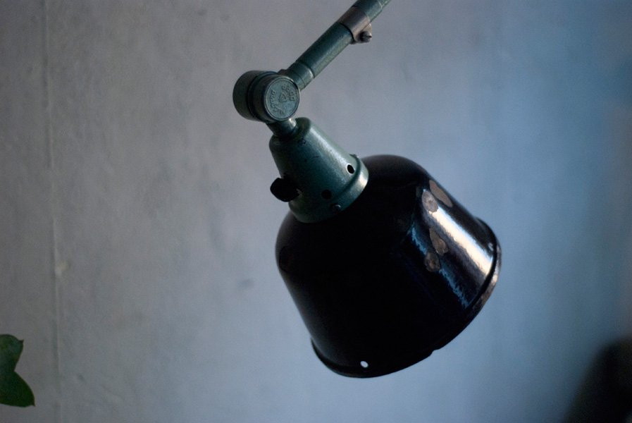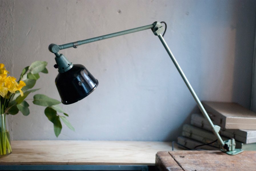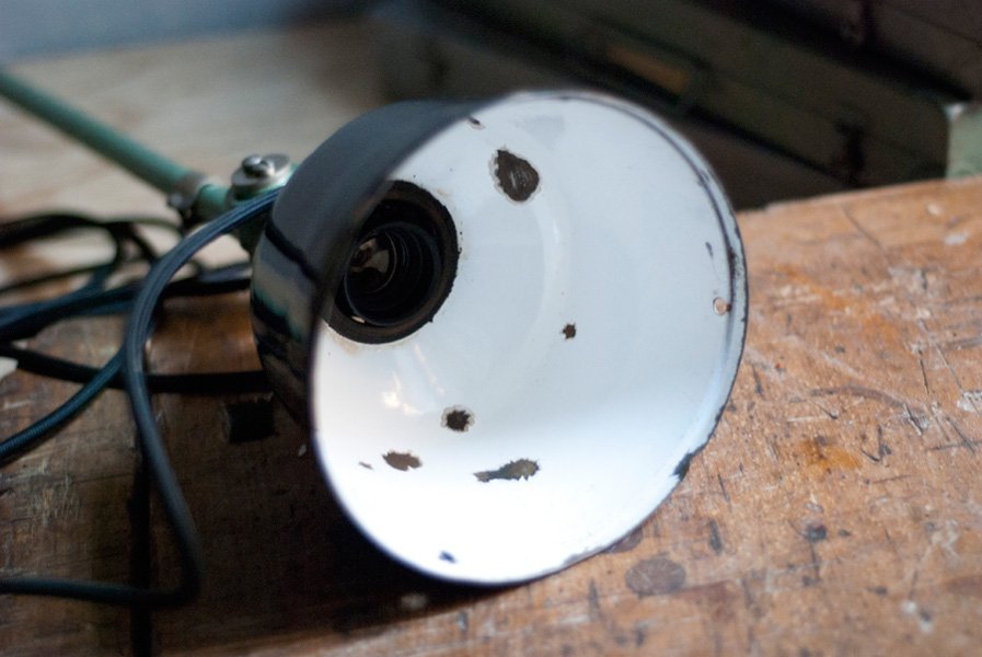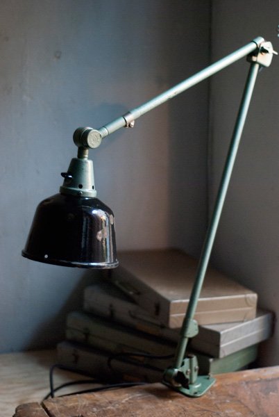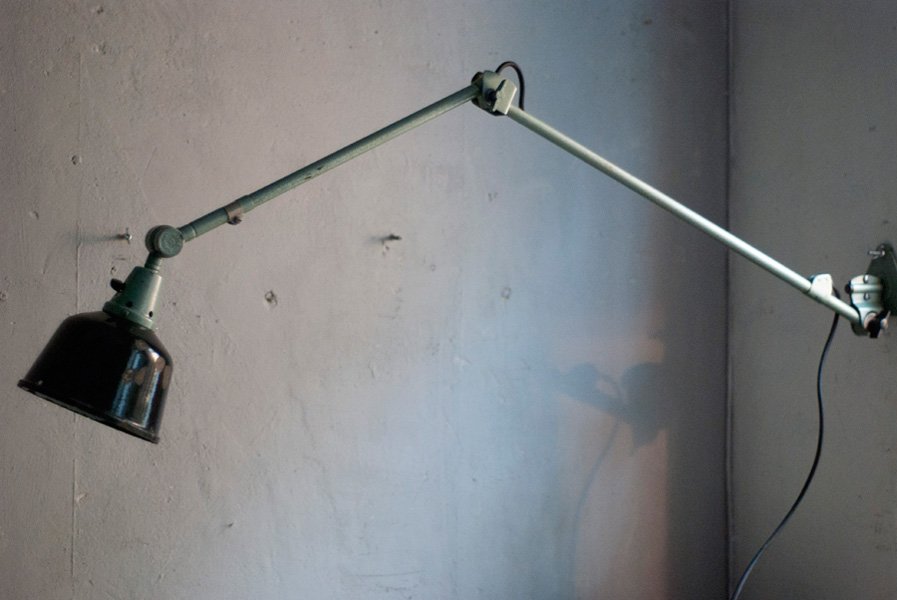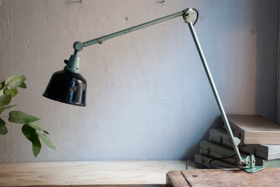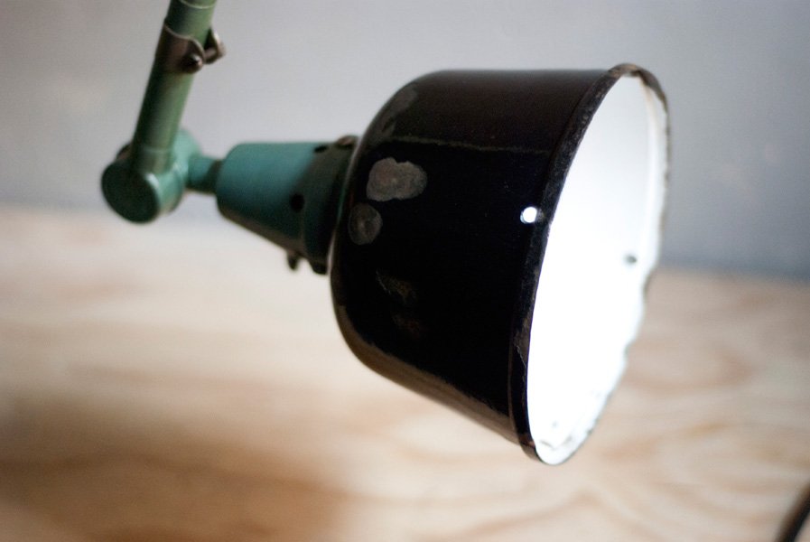 Grosse Gelenklampe Midgard DDRP in Hammerschlag grün mit emailliertem Reflektor.