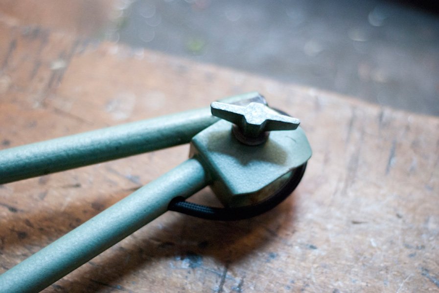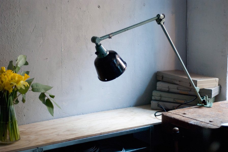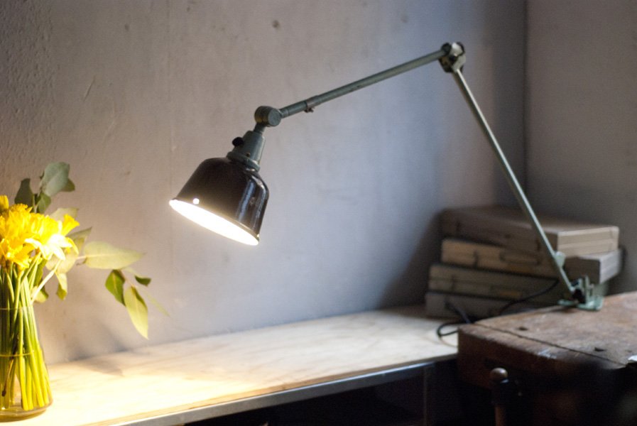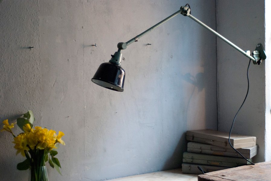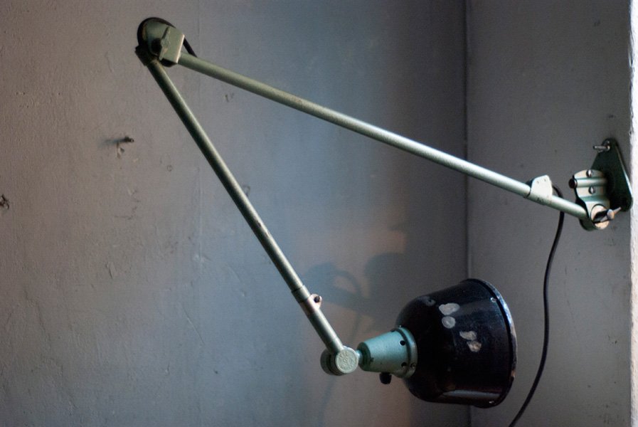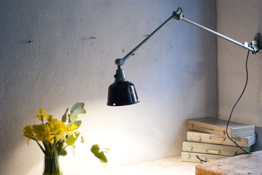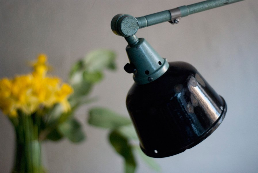 Grosse Gelenklampe Midgard DDRP in Hammerschlag grün mit emailliertem Reflektor.