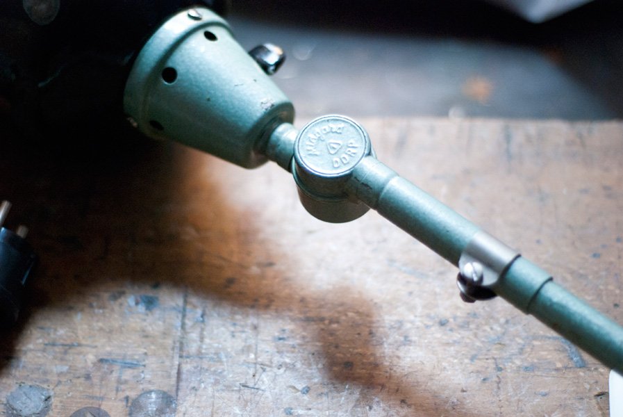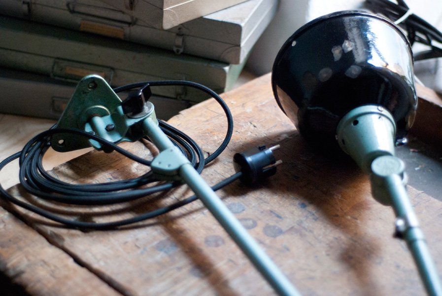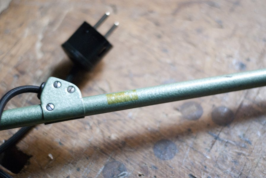 Die Technik der Leuchte funktioniert einwandfrei. Die Leuchte wird mittels des Drehschalters an der Bakelitfassung betätigt. Die Elektrik wurde dreiadrig erneuert und generalüberholt. Es wurde ein schwarzes, stoffummanteltes Kabel verwendet.