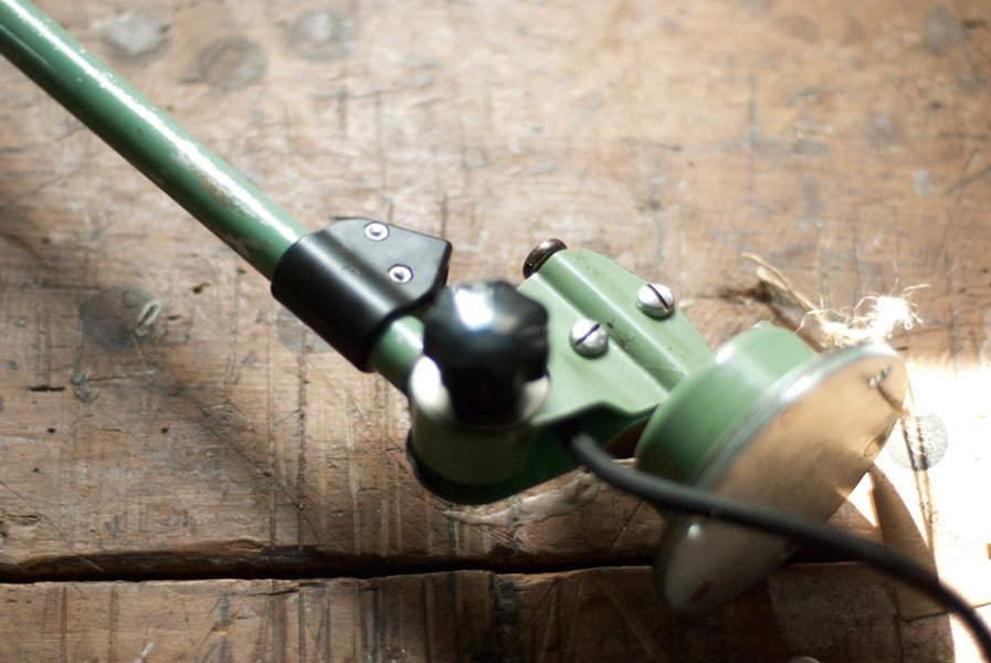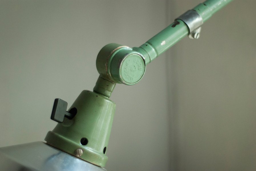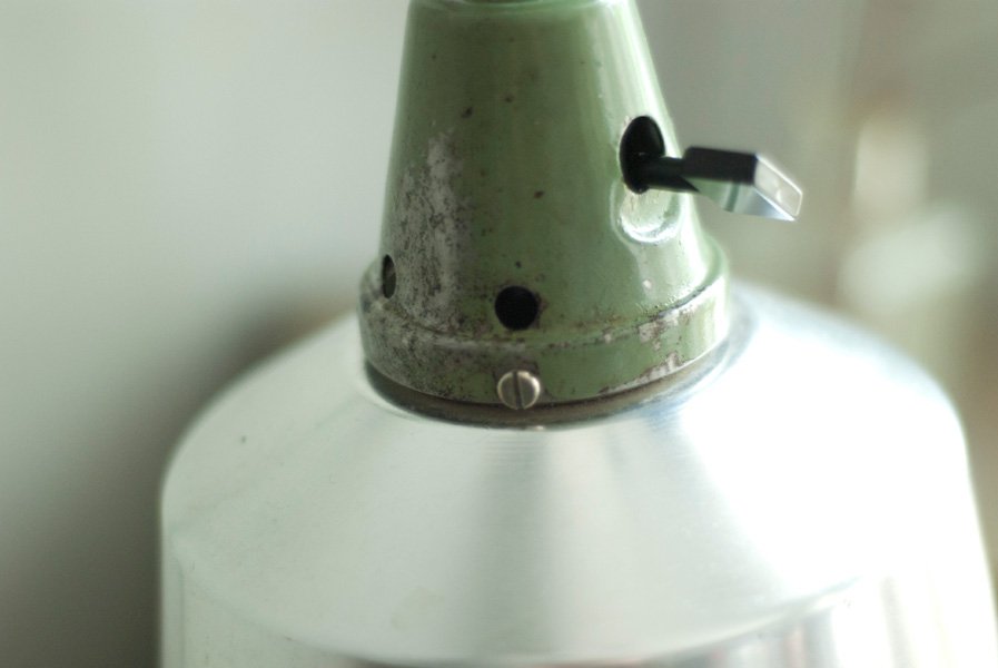Die Leuchte befindet sich in einem gebrauchten Zustand und weist Alterspuren und Lackabplatzer auf. Der schöne Schirm befindet sich in einem sehr guten Zustand und weist lediglich ein paar Kratzer auf.