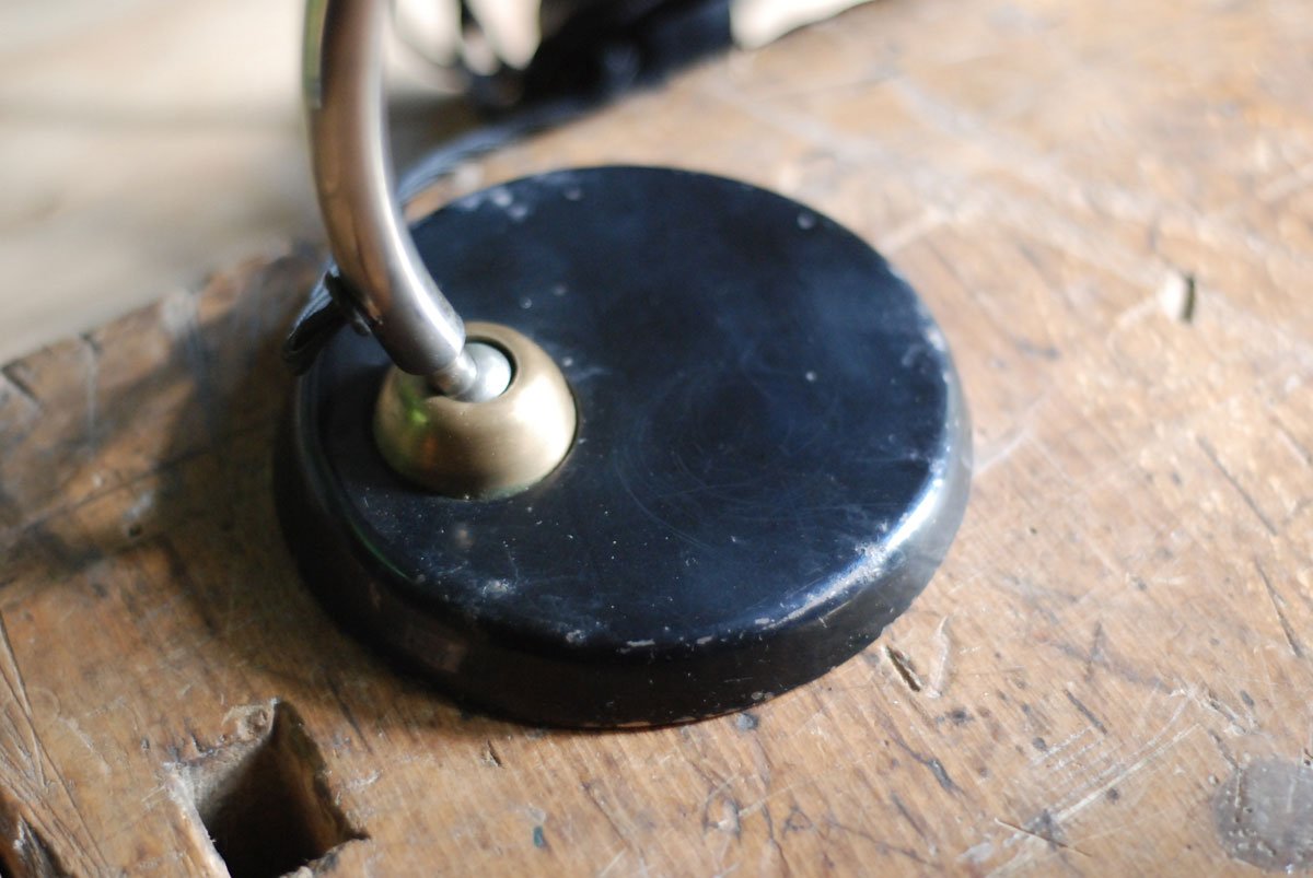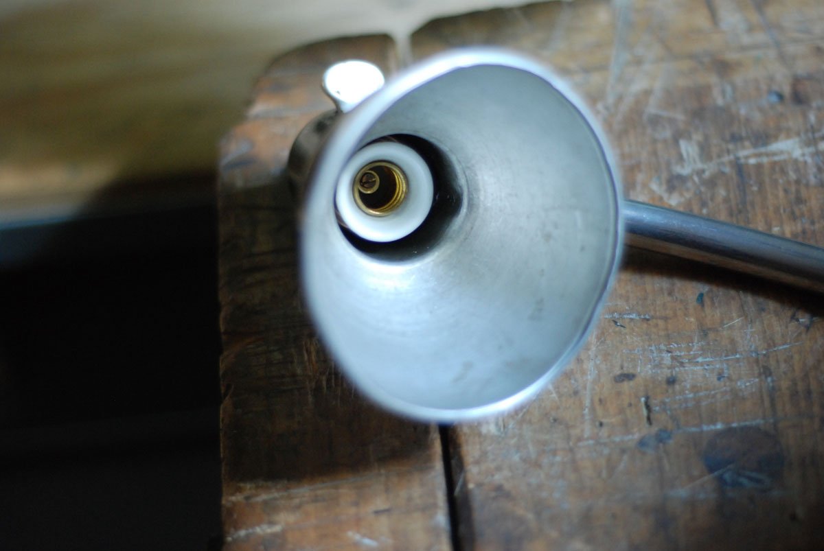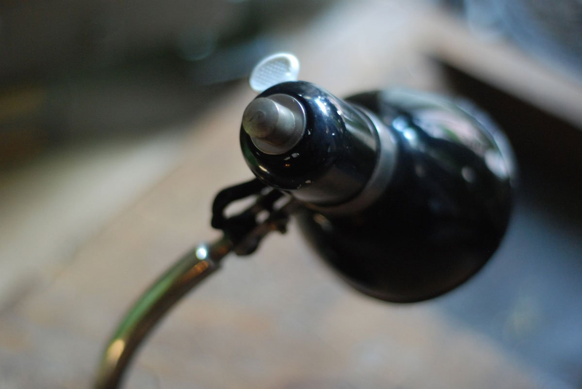 Die Leuchte wird mittels eines Drehschalters aus Porzellan an der Messingfassung betätigt. Die Technik der Leuchte funktioniert einwandfrei.